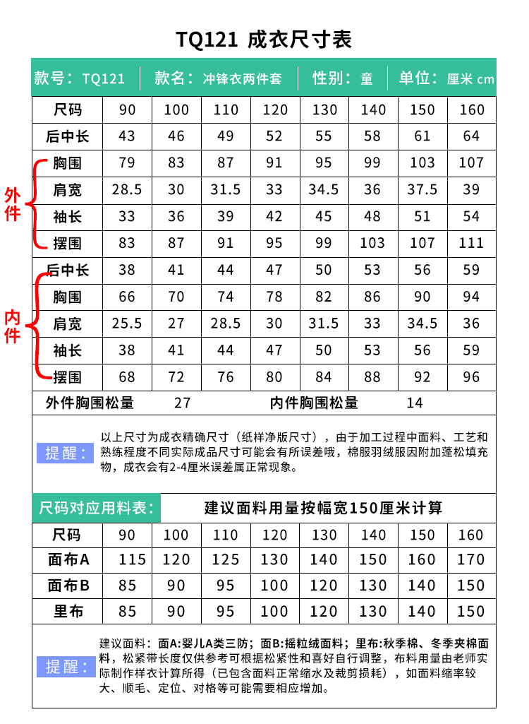 裁缝学苑TQ121儿童防水三合一冲锋衣纸样童装男女童外套做衣服打版裁剪样板