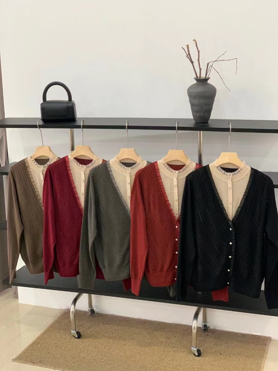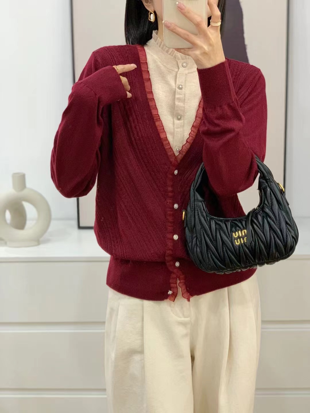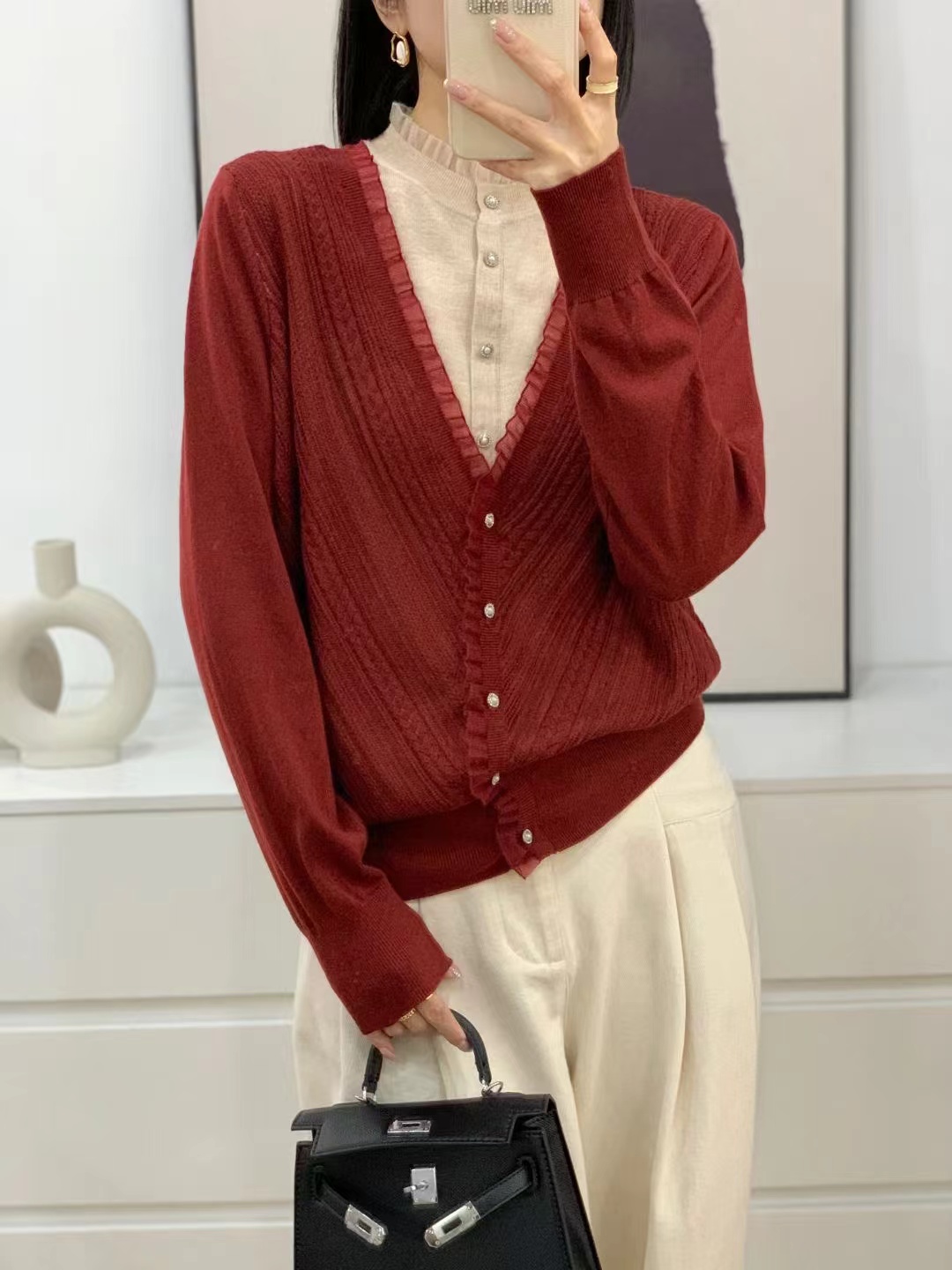 伯妮斯茵 | 复古温柔风 V 领木耳边针织开衫 春秋气质显瘦上衣 HJ3E25