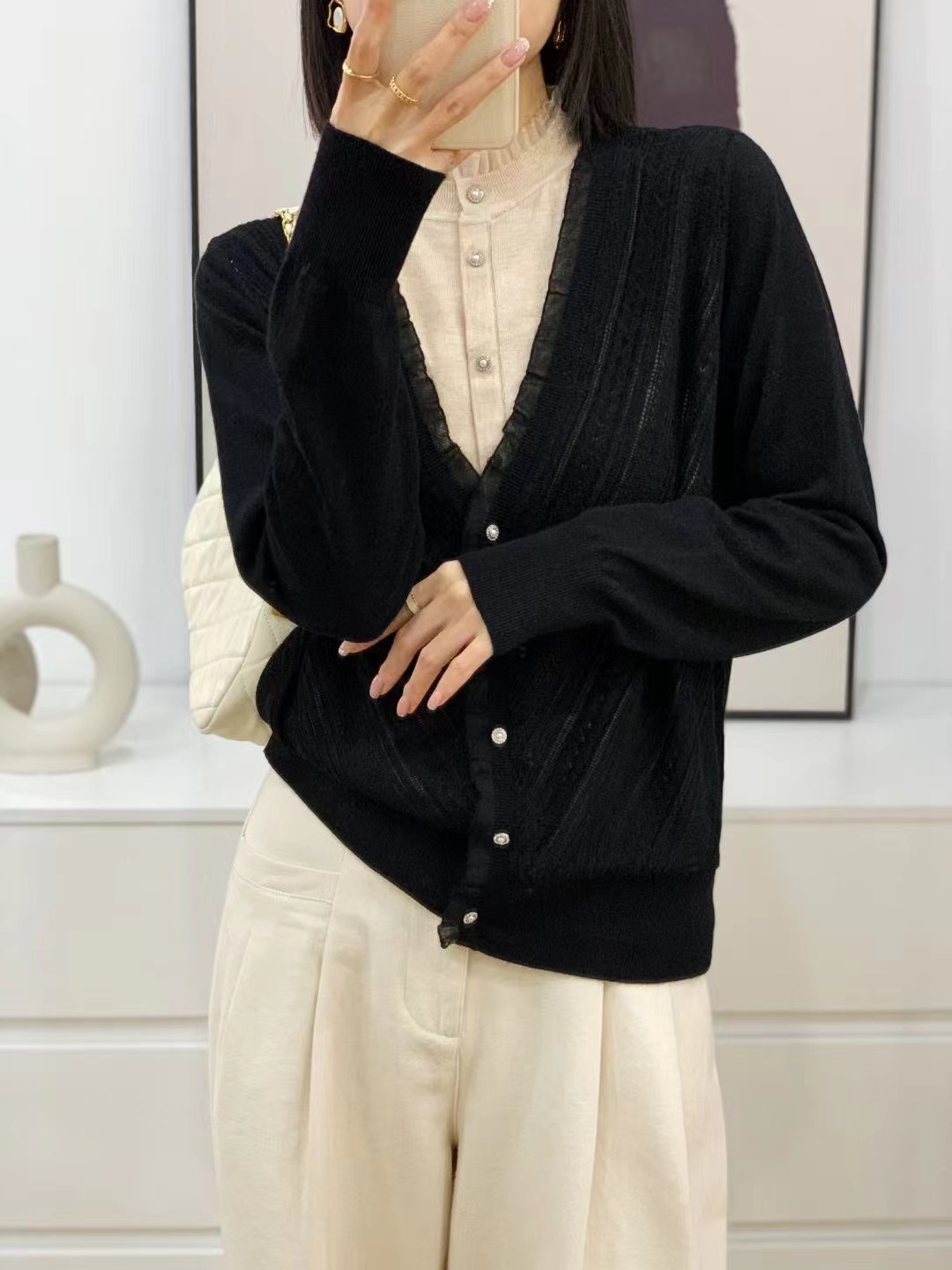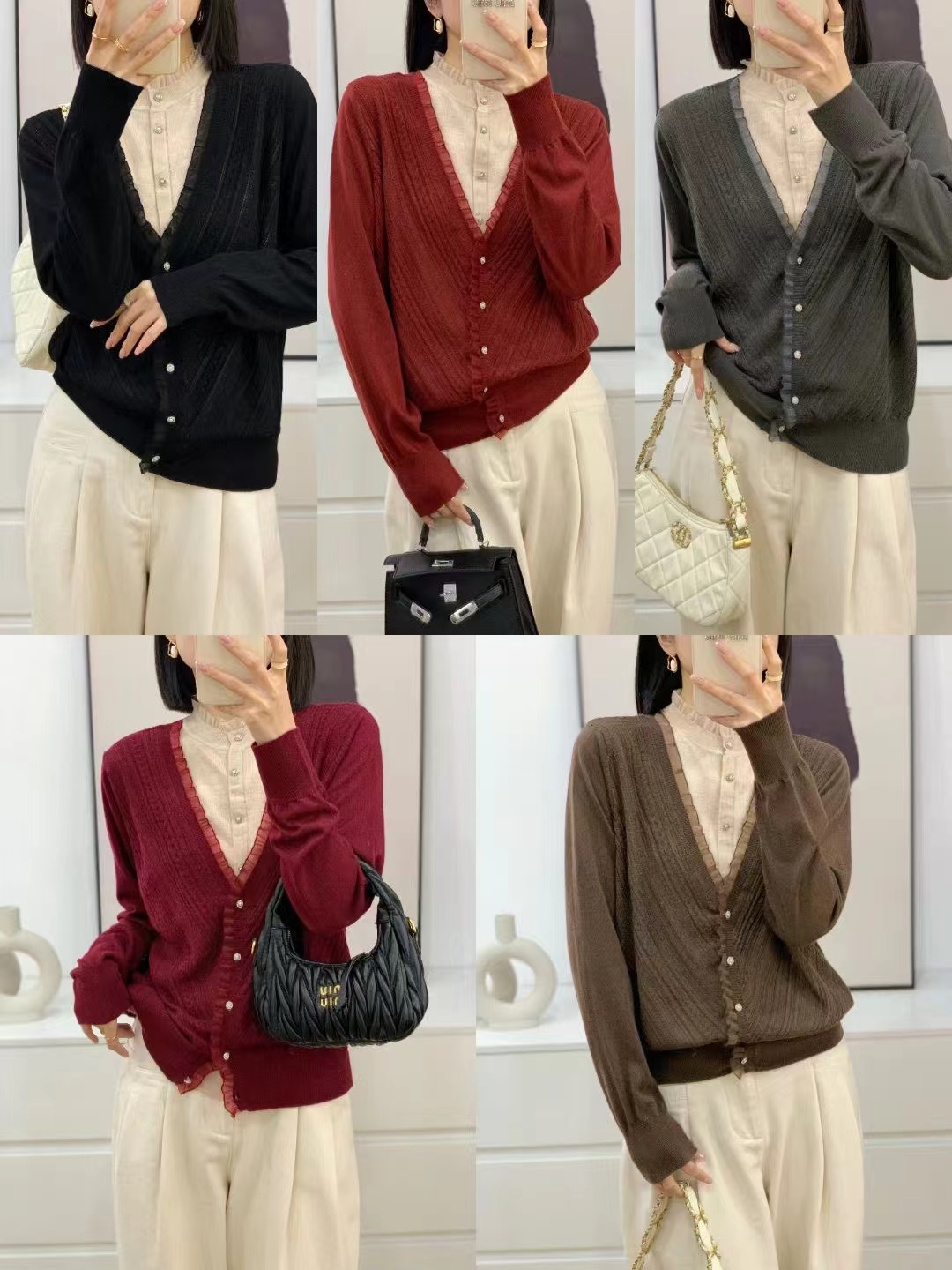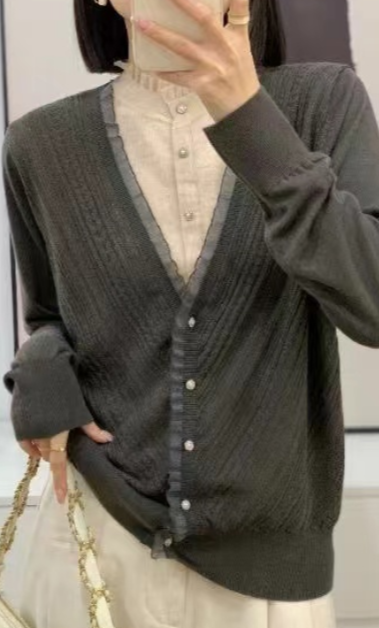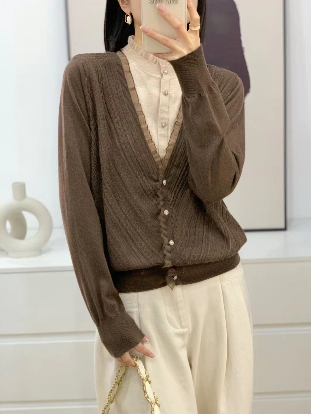 伯妮斯茵 | 复古温柔风 V 领木耳边针织开衫 春秋气质显瘦上衣 HJ3E25