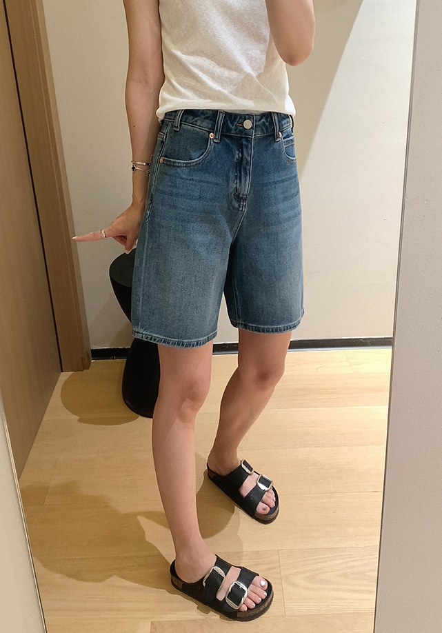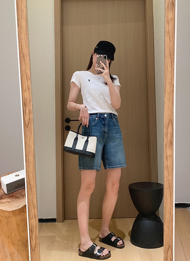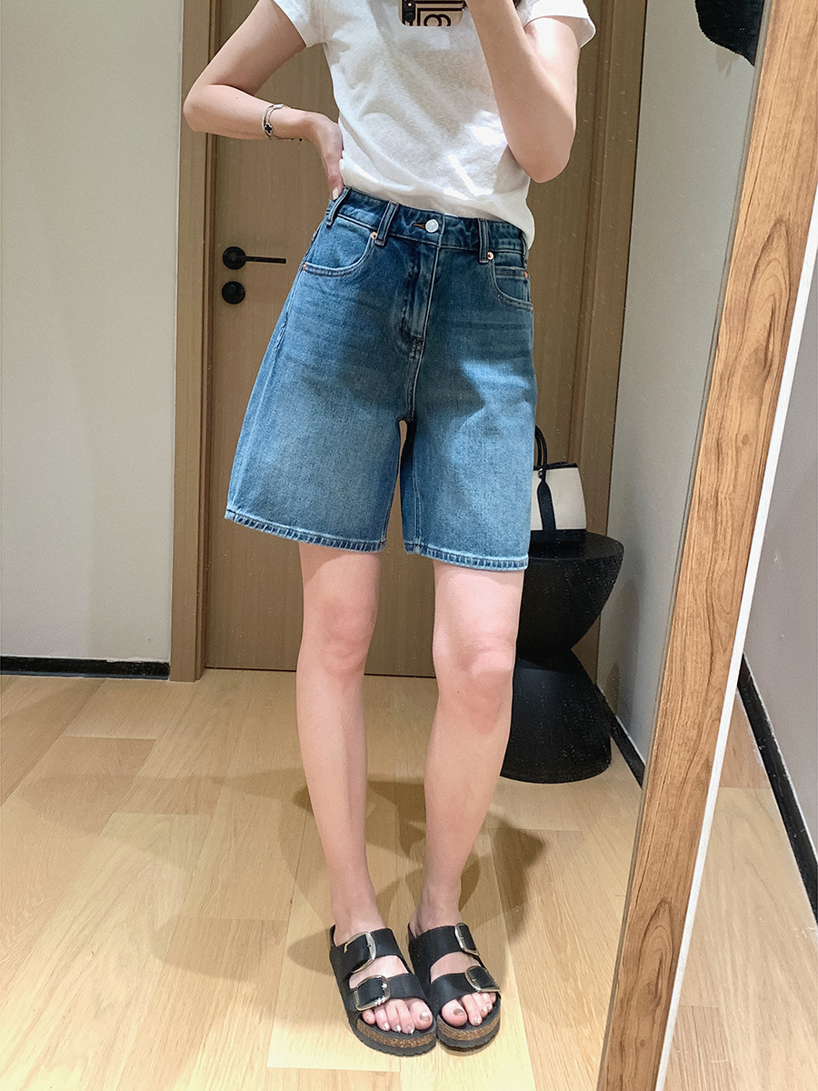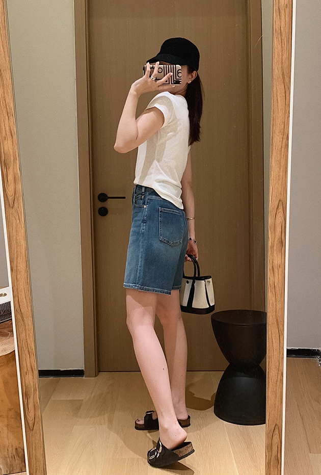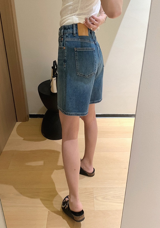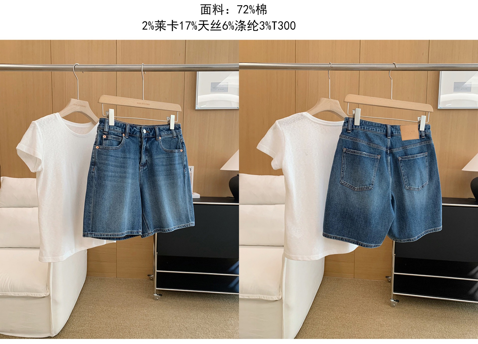直筒五分裤型,收胯显瘦,梨形身材闭眼入!高腰设计,视觉拉高身段比例整件0.8公分车双线,盾形后袋+撞色包枣设计,显立体有型噢~