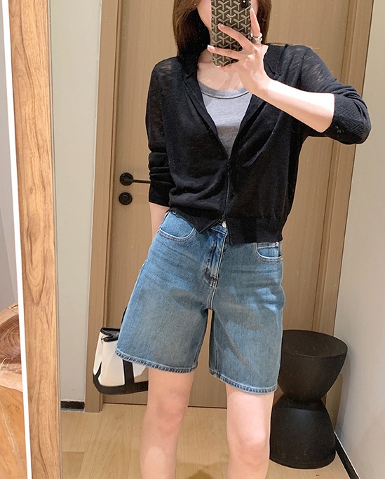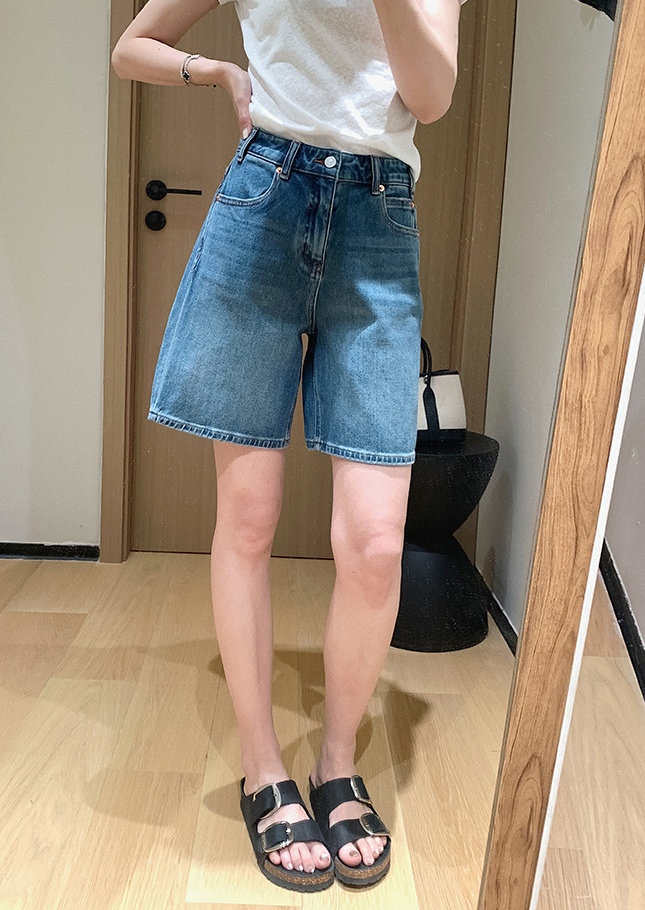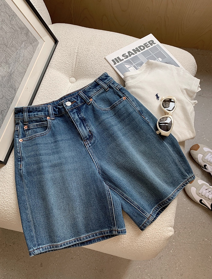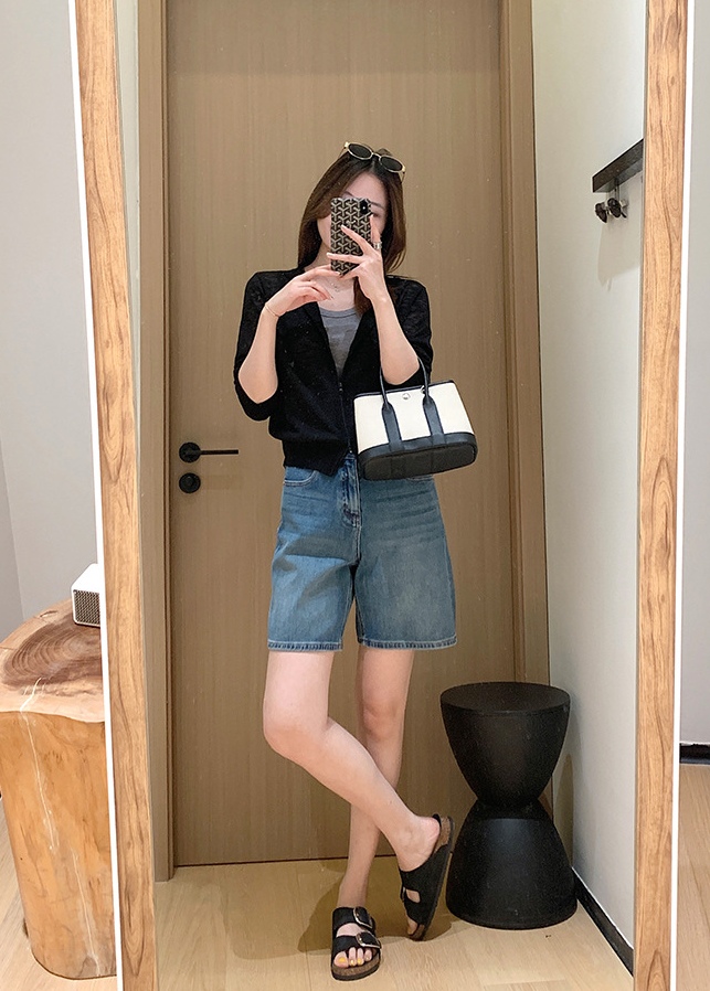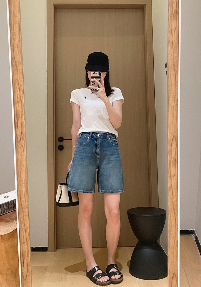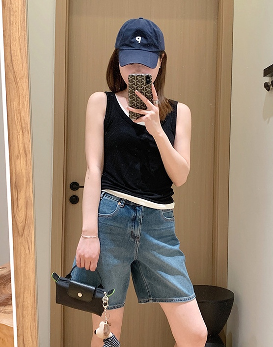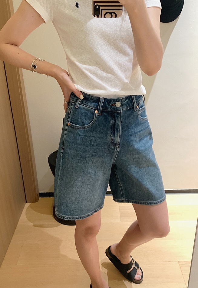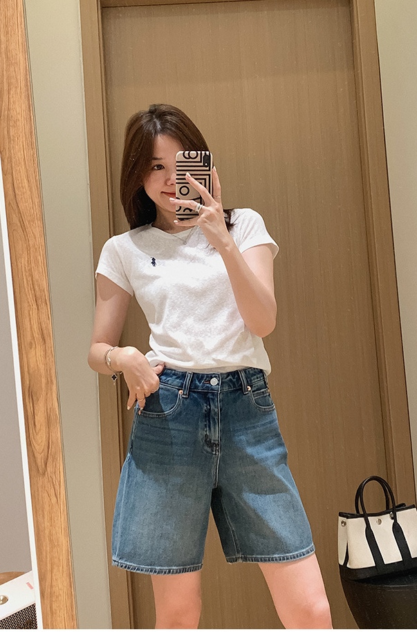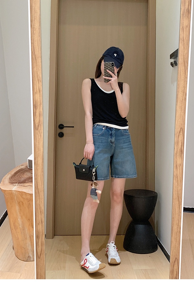 直筒五分裤型,收胯显瘦,梨形身材闭眼入!高腰设计,视觉拉高身段比例整件0.8公分车双线,盾形后袋+撞色包枣设计,显立体有型噢~
