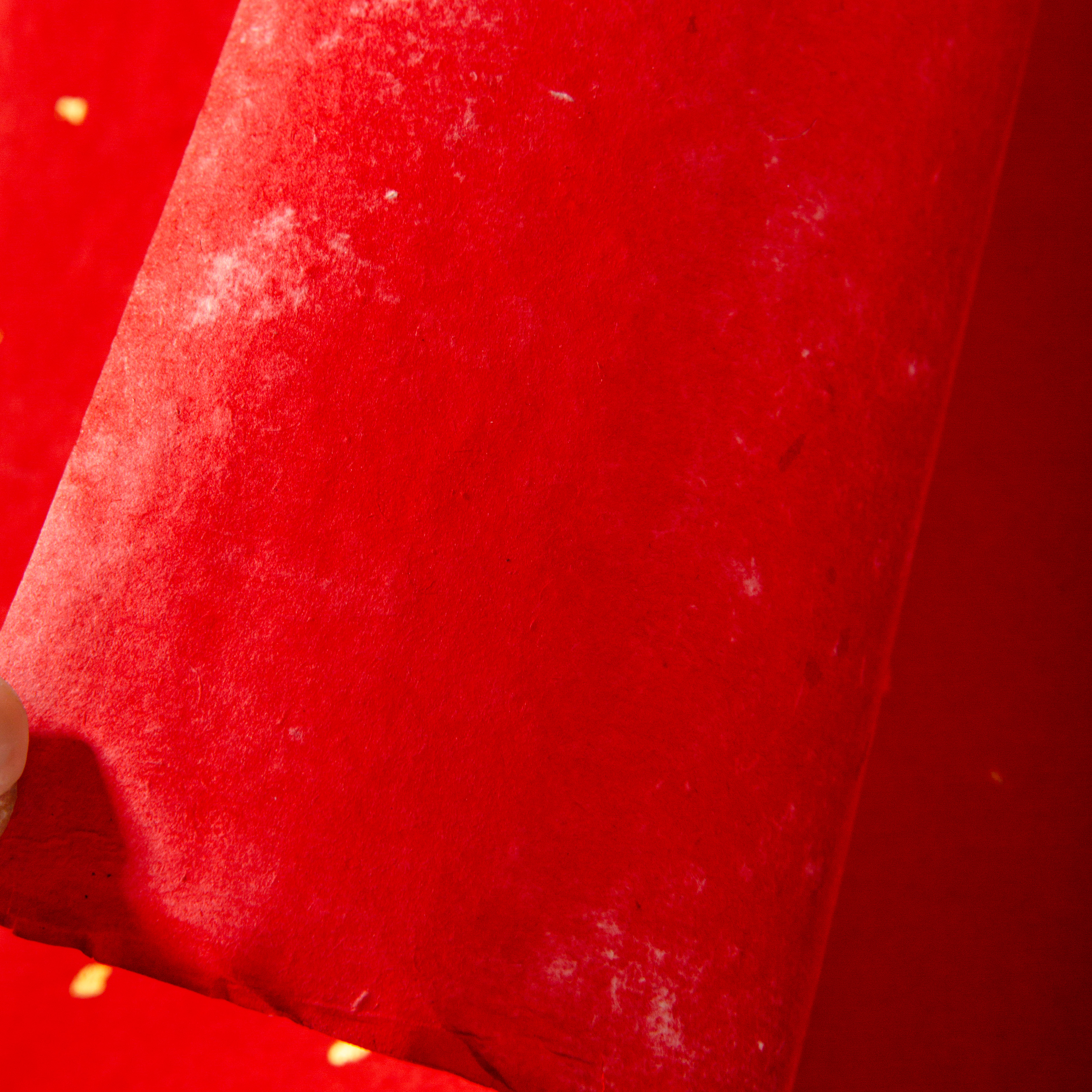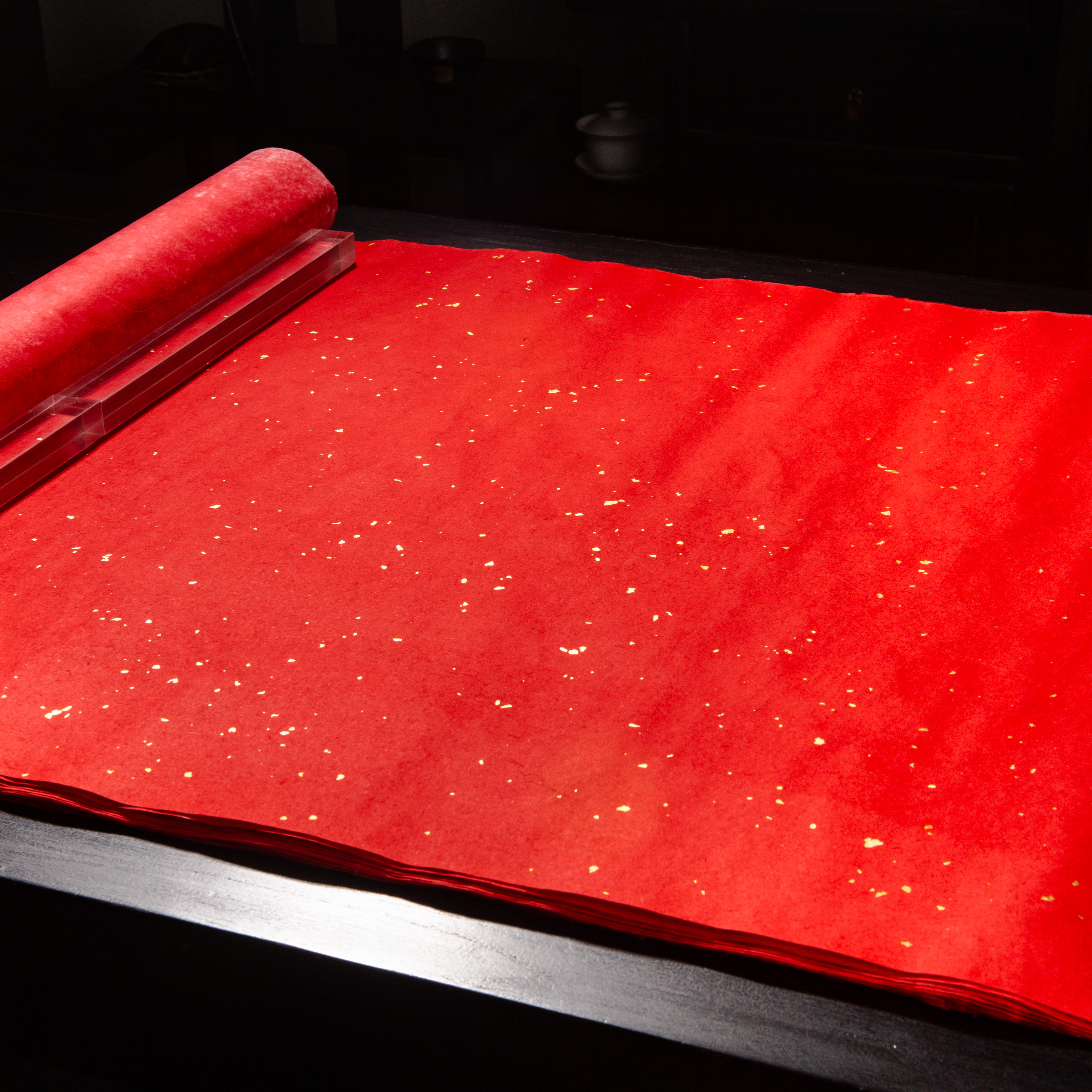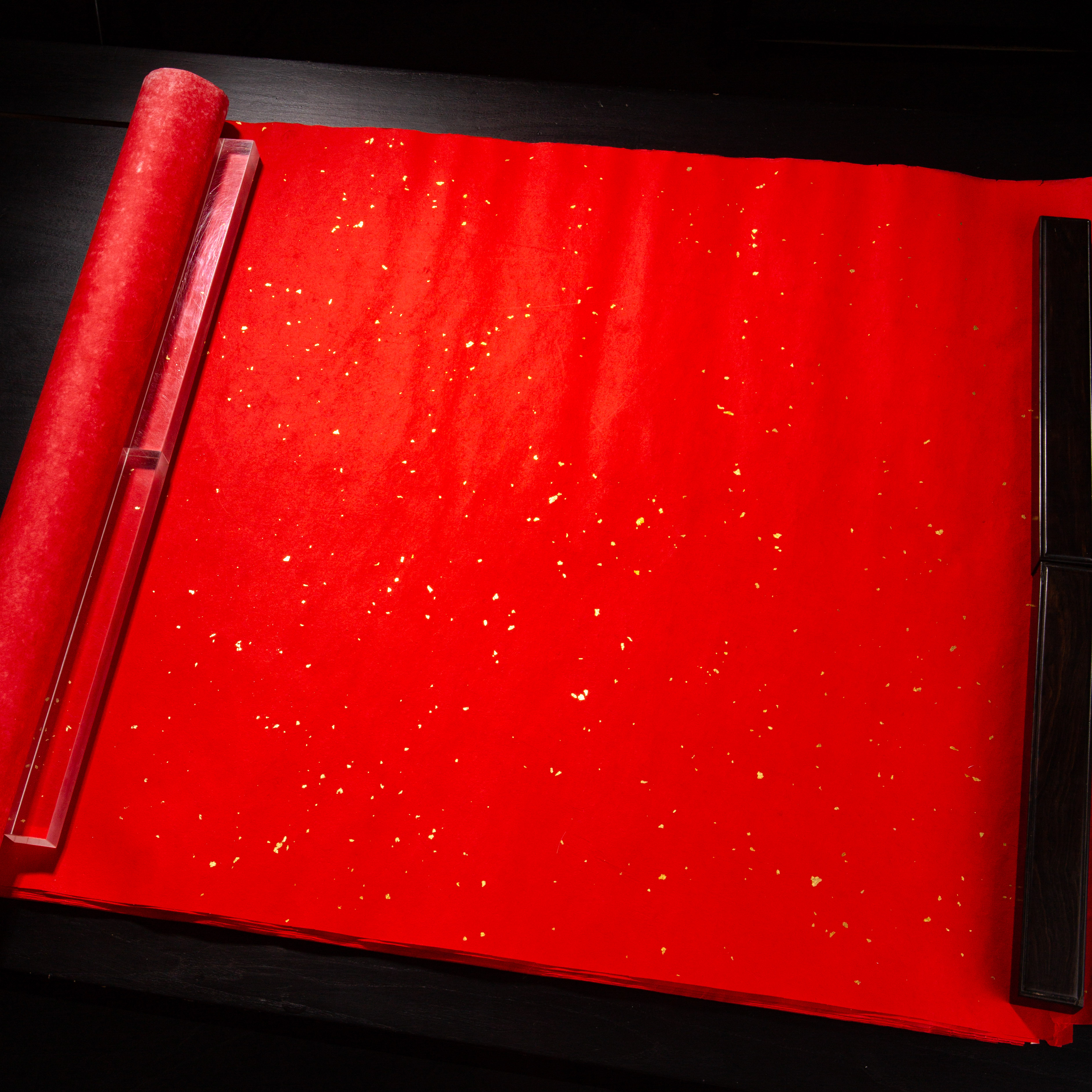 70-80年代杨柳青画店制“洒真金大红冷金笺”。其纸质精良厚实,纯植物手工染色,颜色极具层次感,洒真金光泽华丽,是不可多得的好纸。
