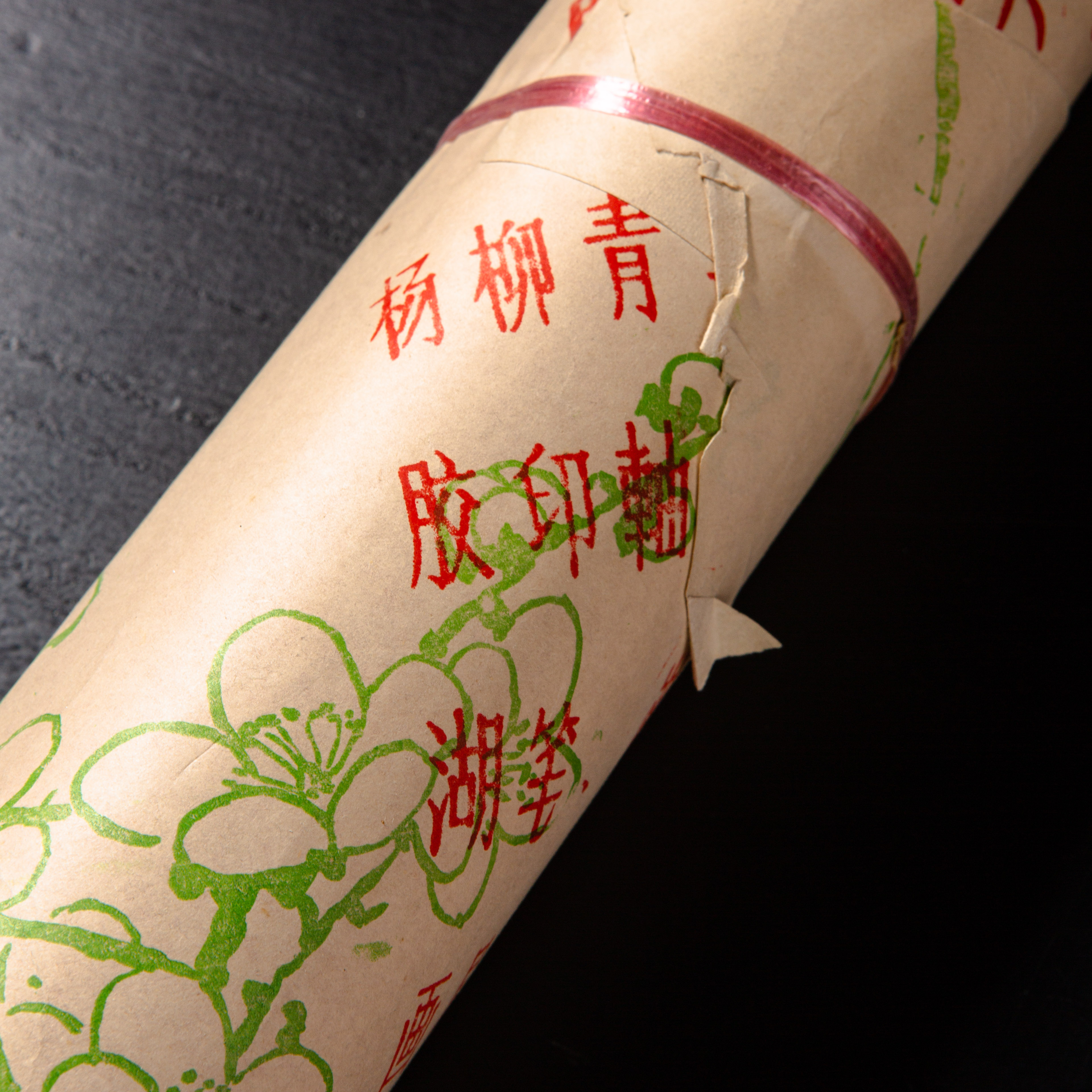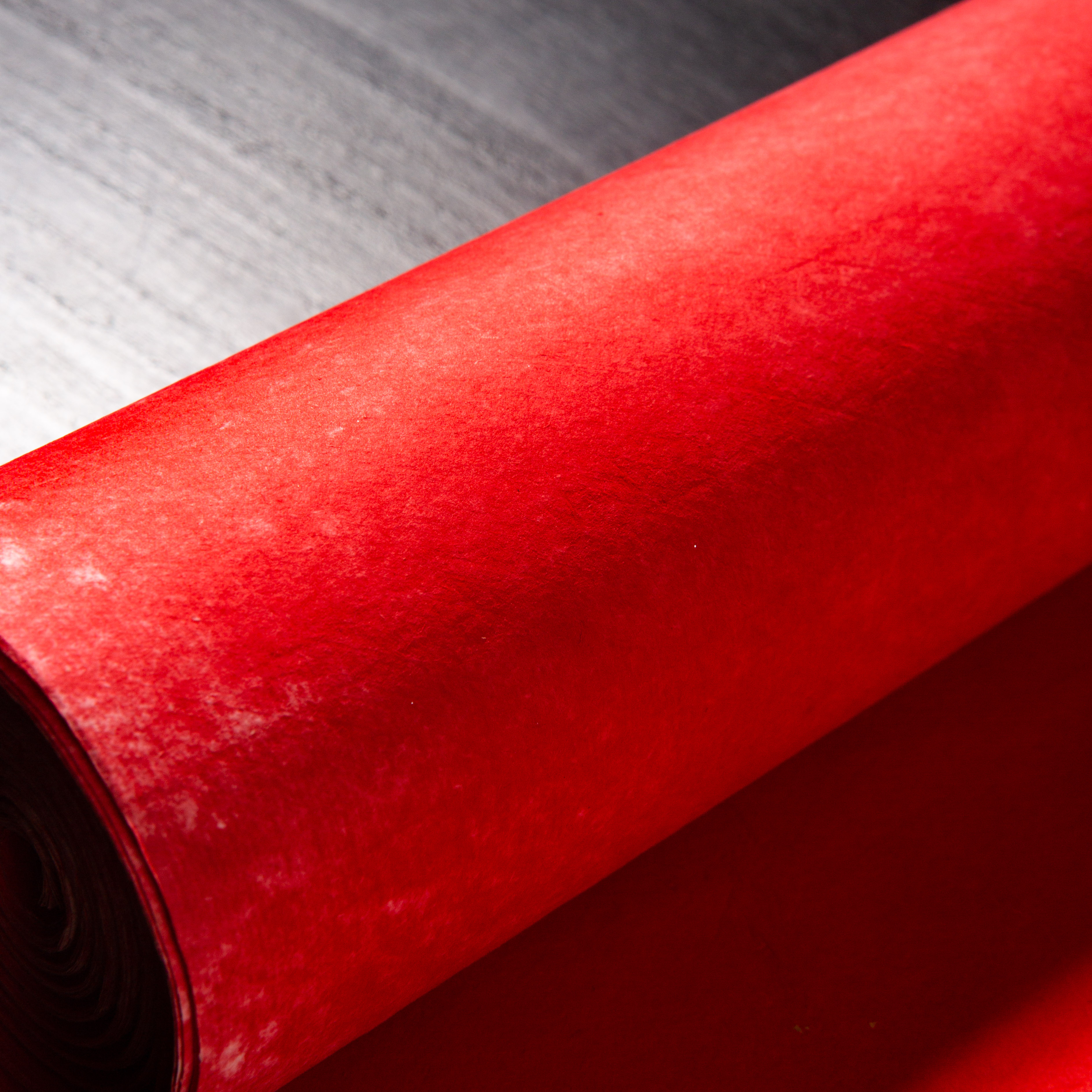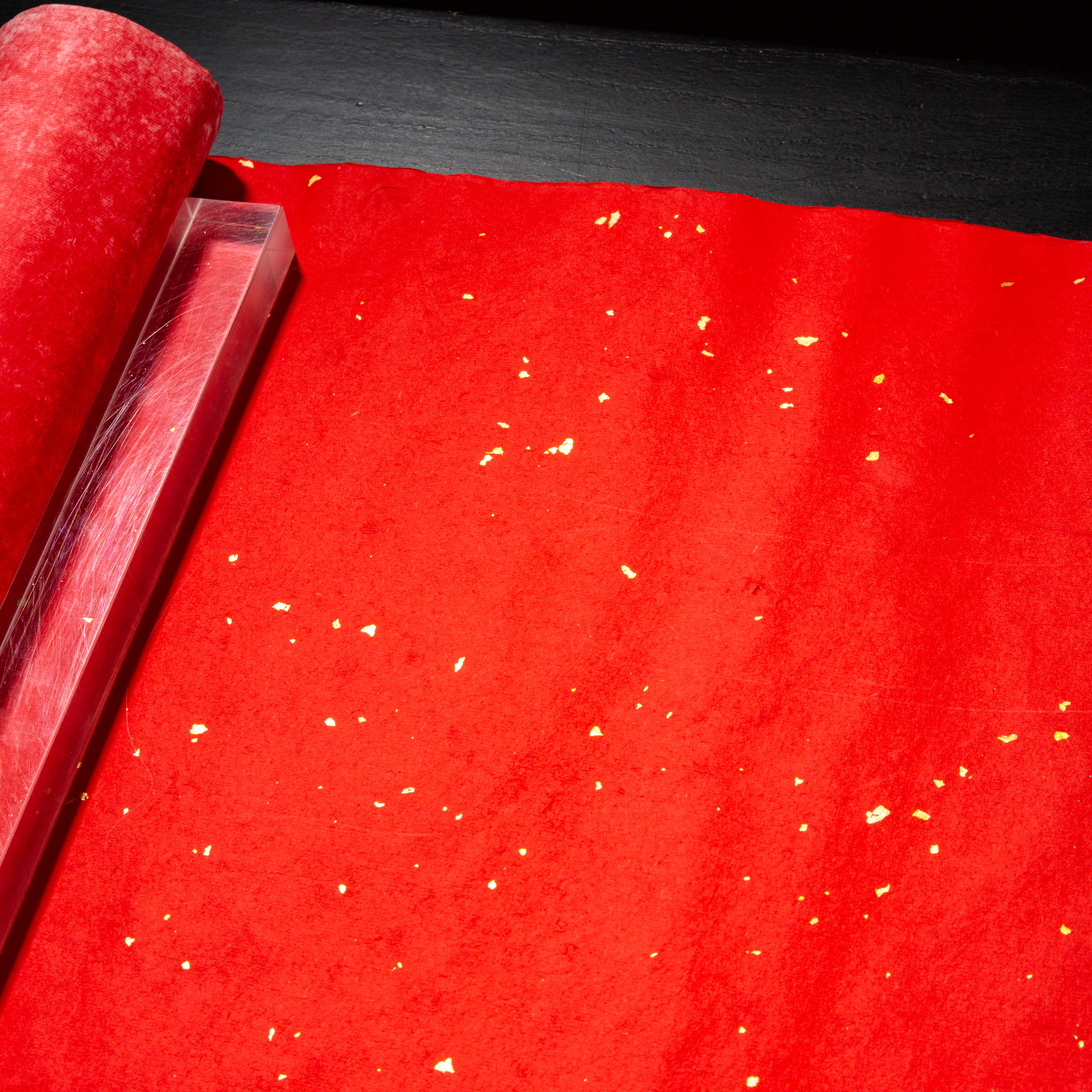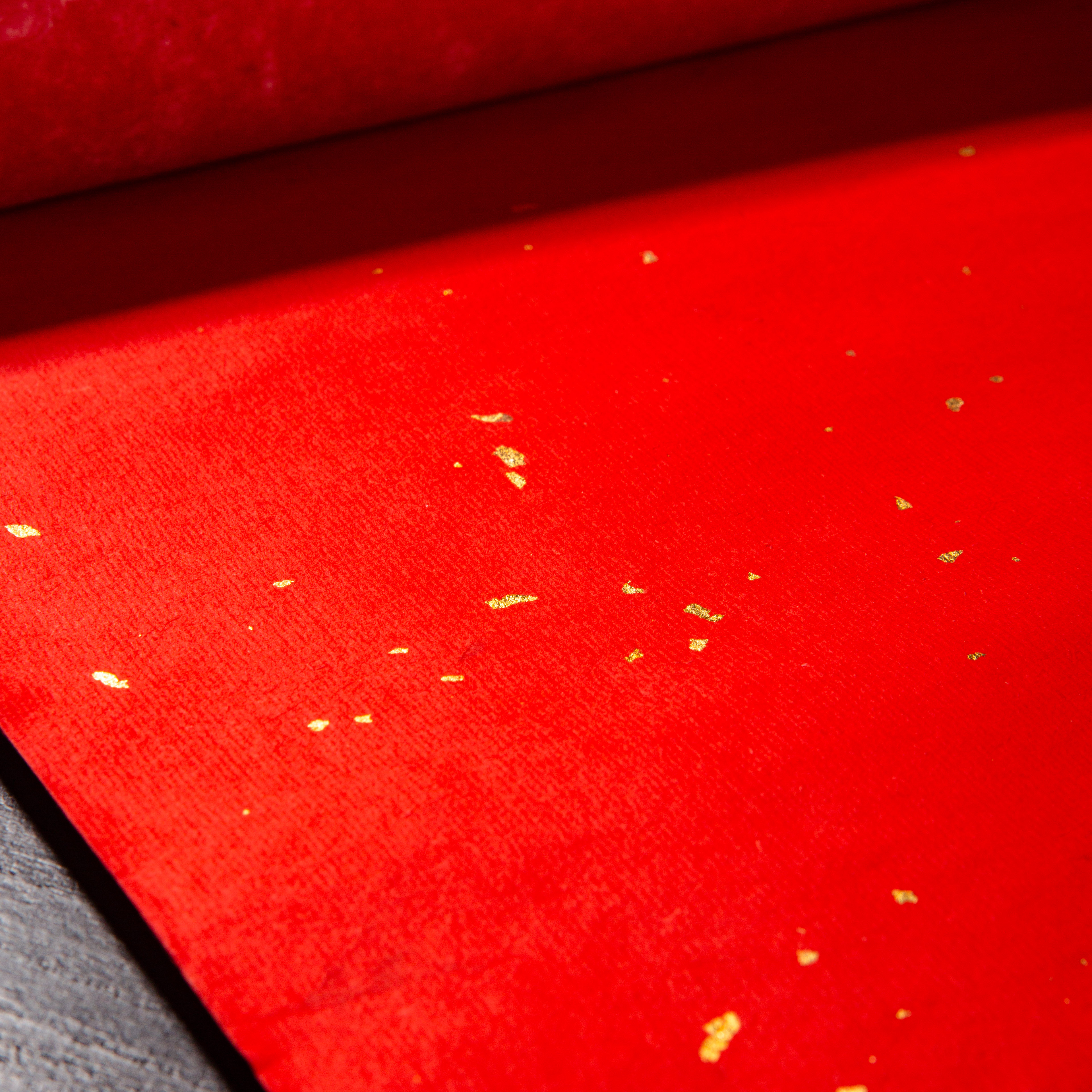 70-80年代杨柳青画店制“洒真金大红冷金笺”。其纸质精良厚实,纯植物手工染色,颜色极具层次感,洒真金光泽华丽,是不可多得的好纸。