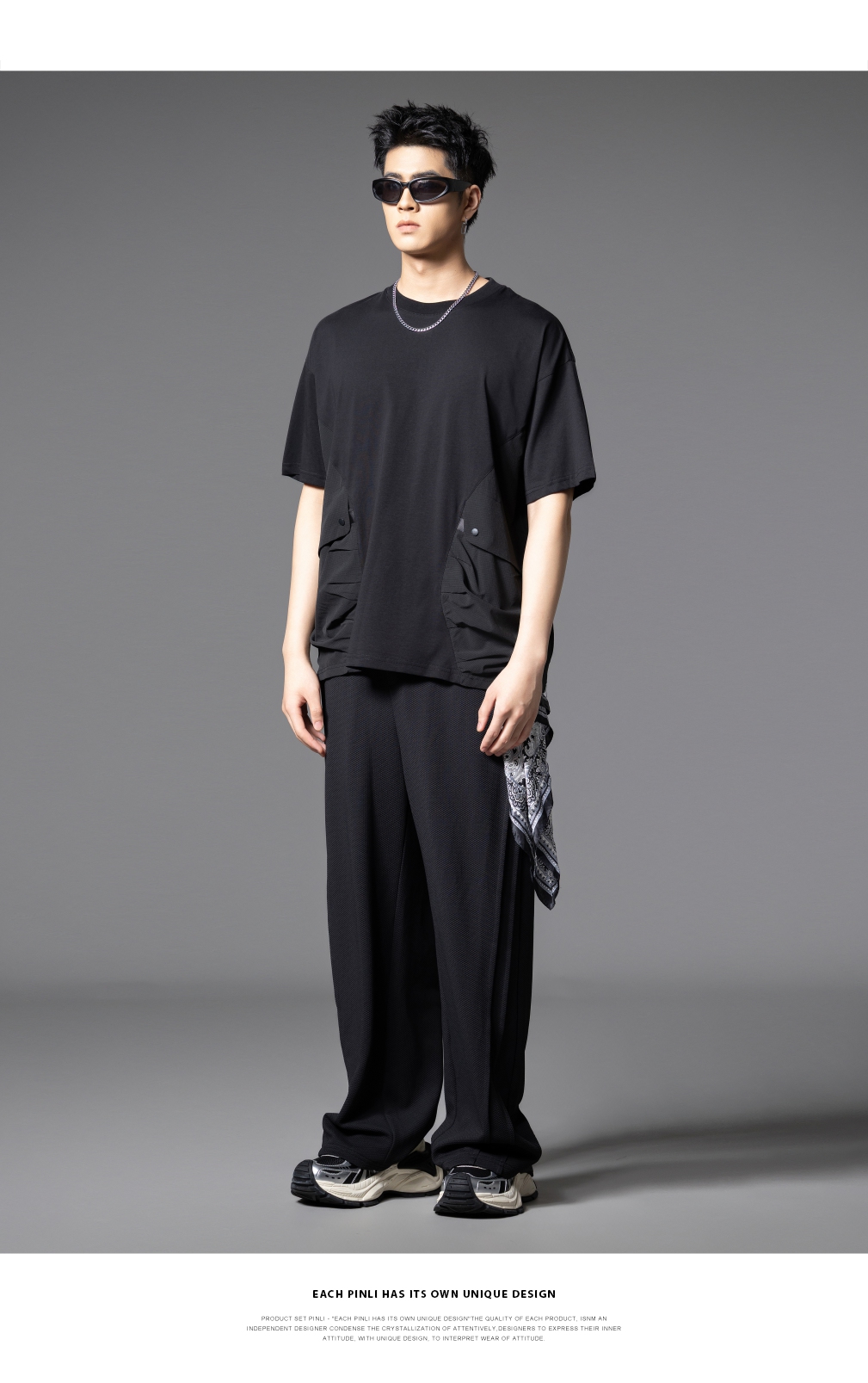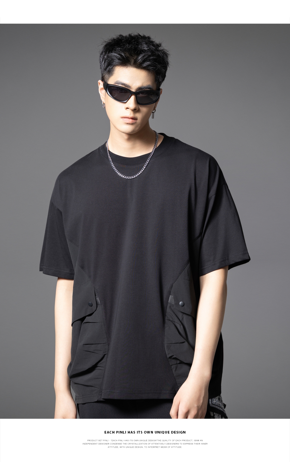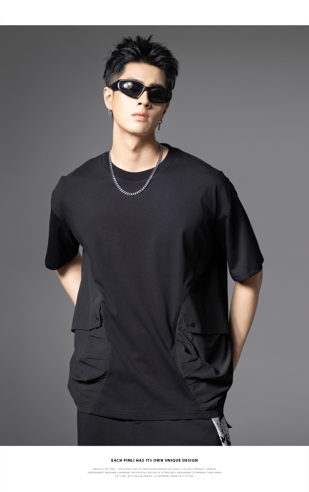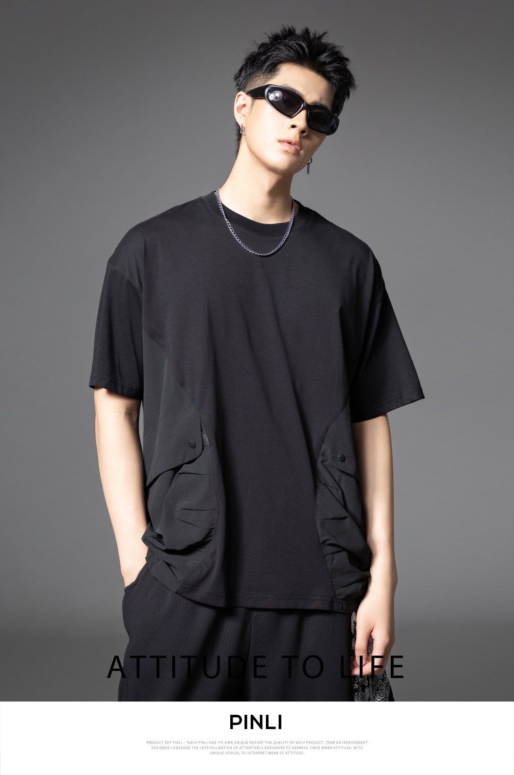 PINLI品立2025夏季新款男士圆领落肩个性口袋装饰短袖T恤宽松上衣B252111070