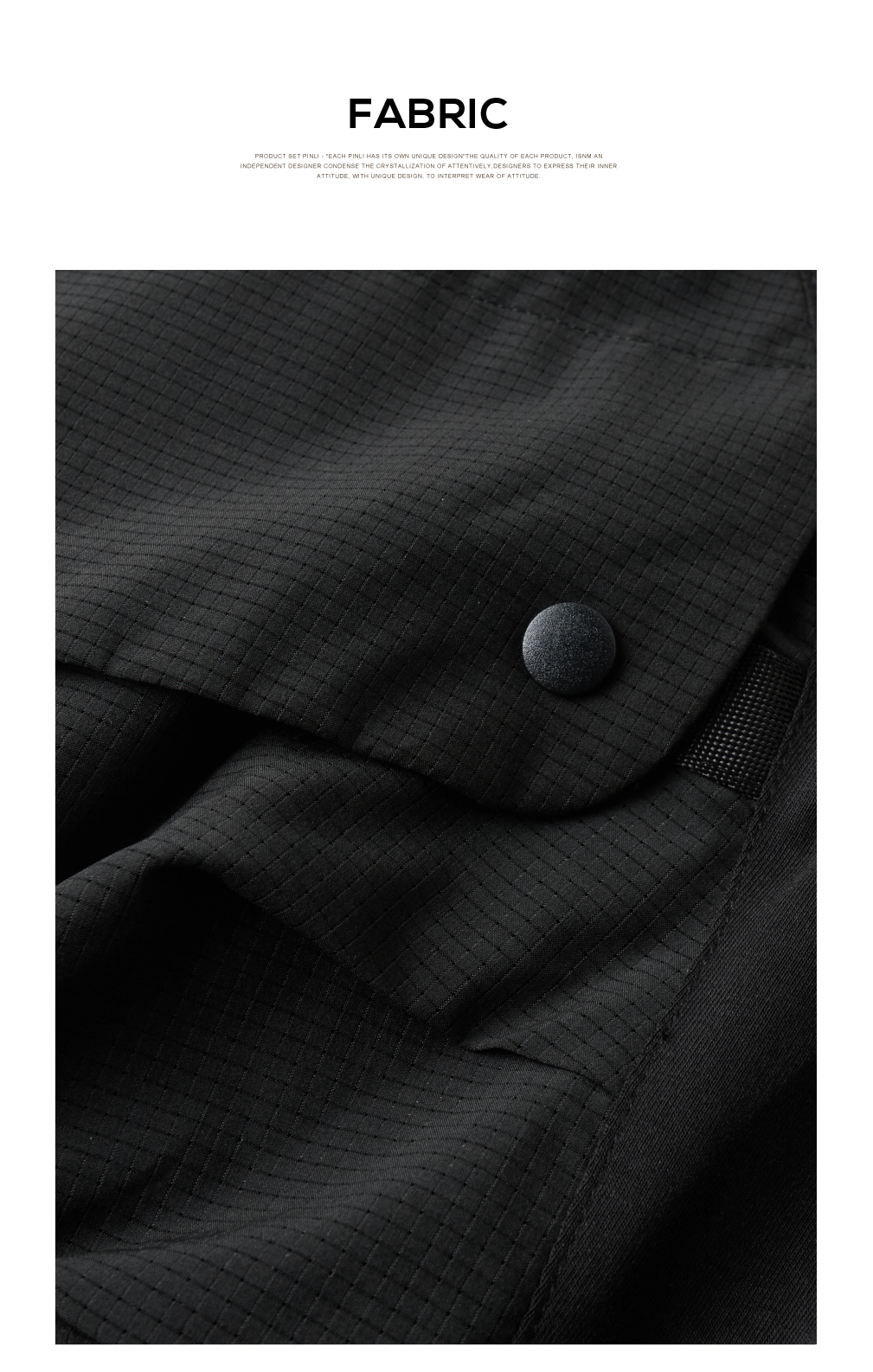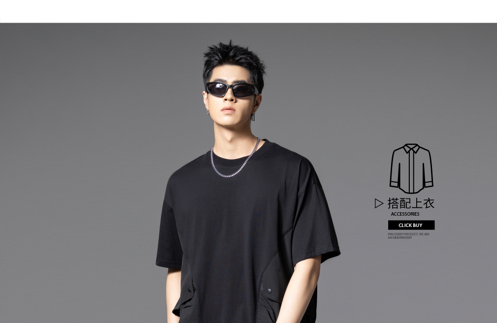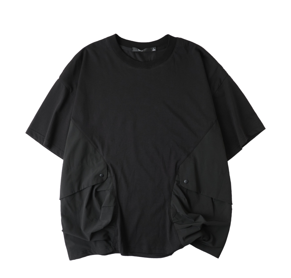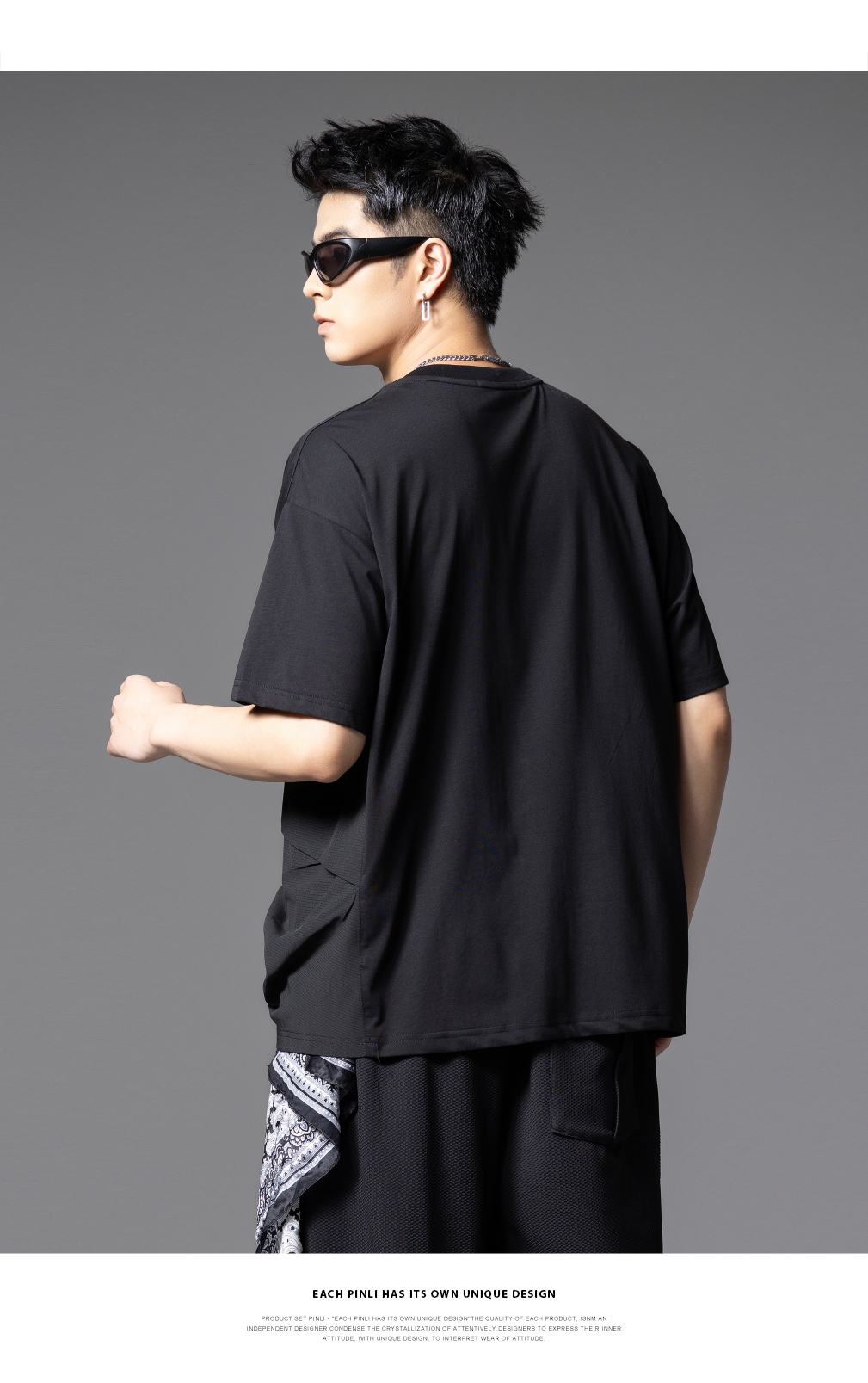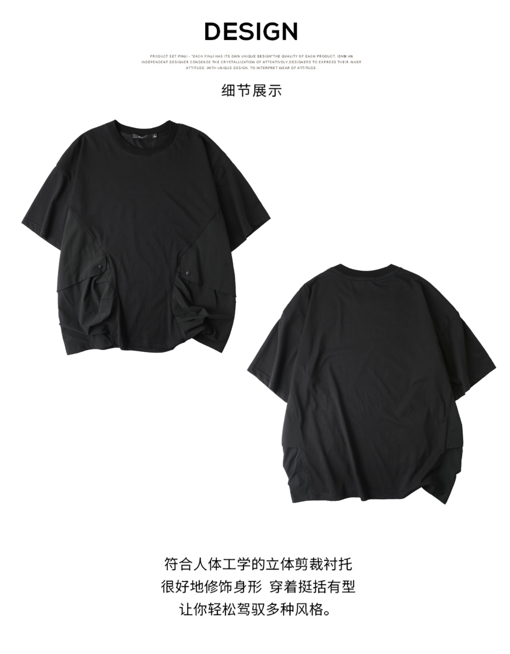 PINLI品立2025夏季新款男士圆领落肩个性口袋装饰短袖T恤宽松上衣B252111070