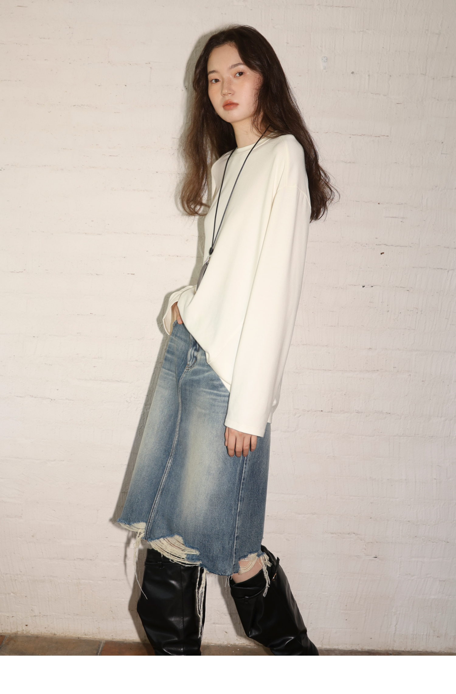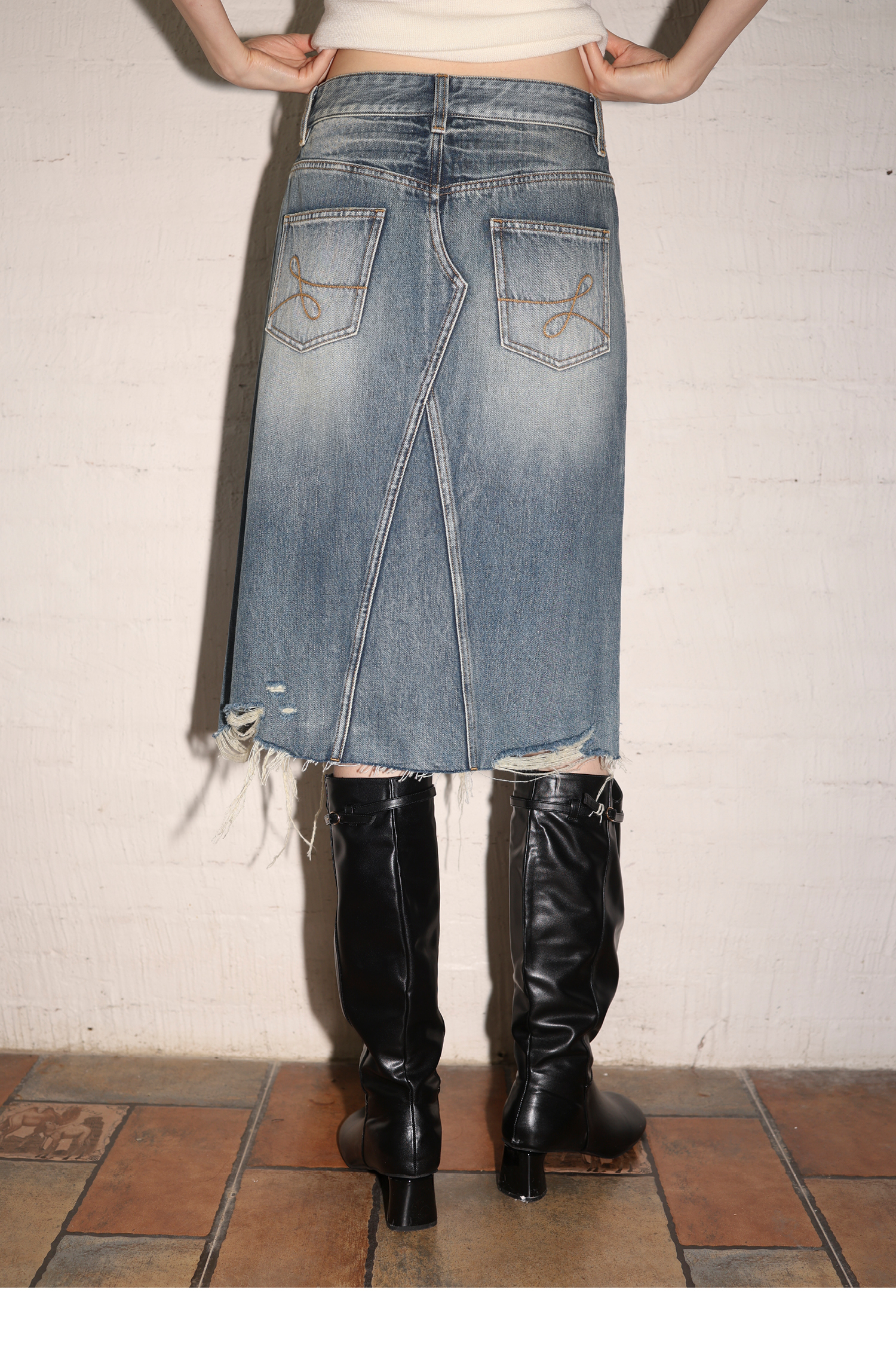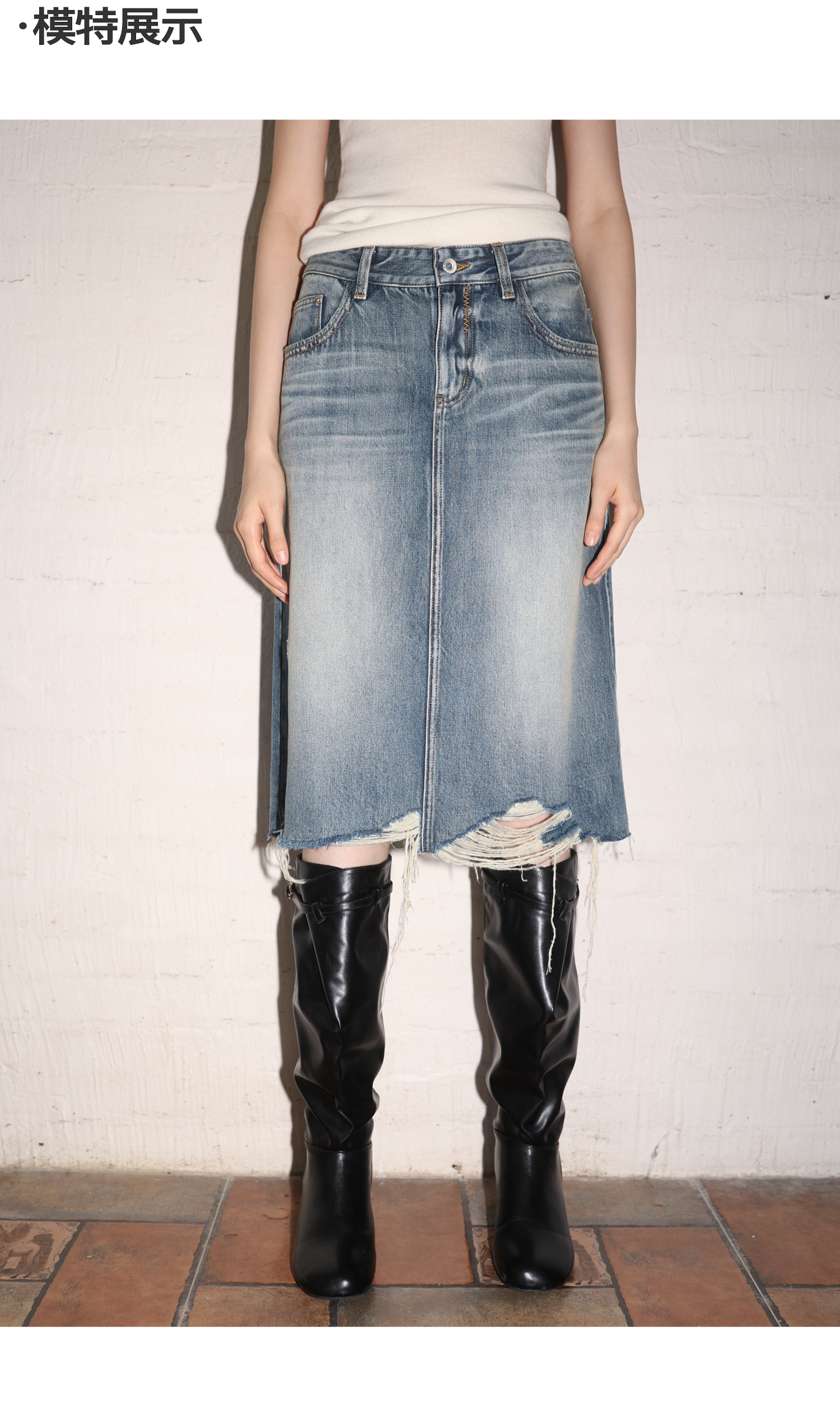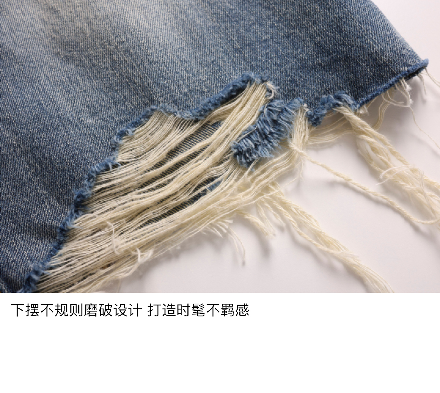 素舶 全棉磨破柔雾蓝水洗牛仔裙中长款流苏不规则下摆直筒半身裙