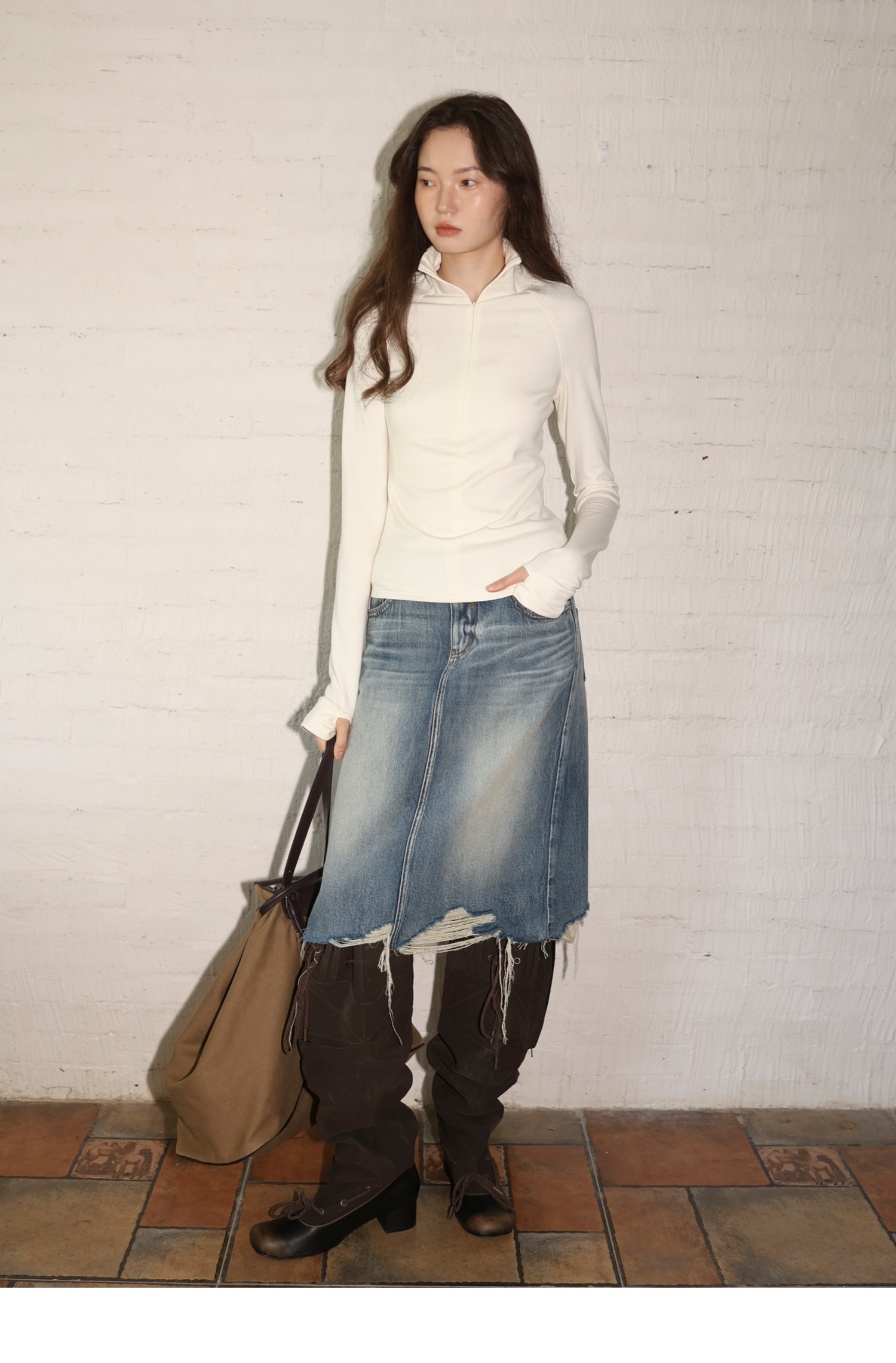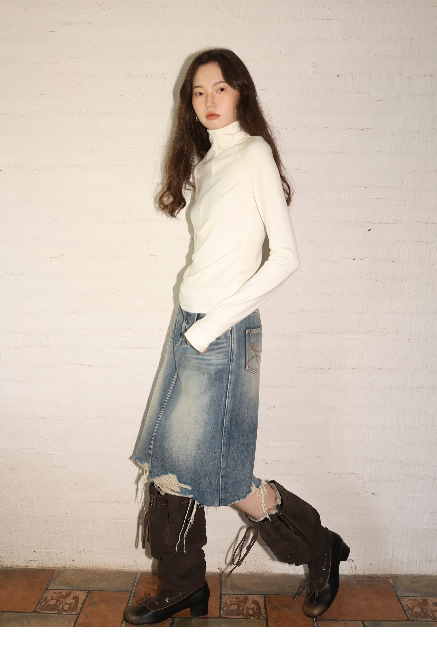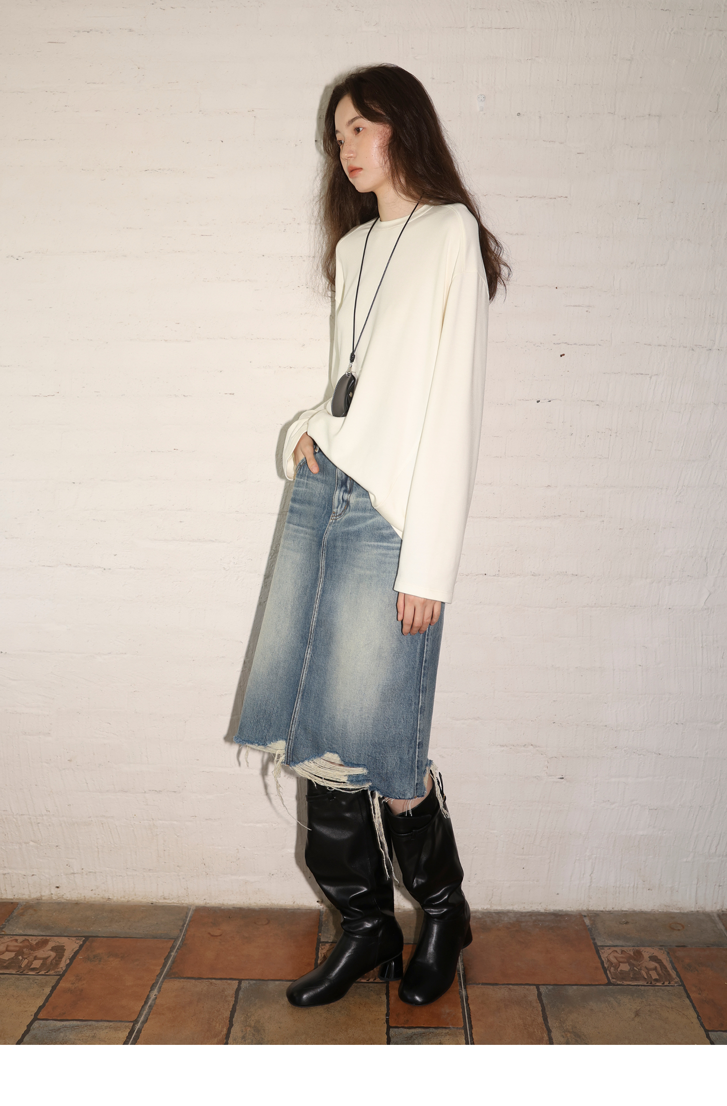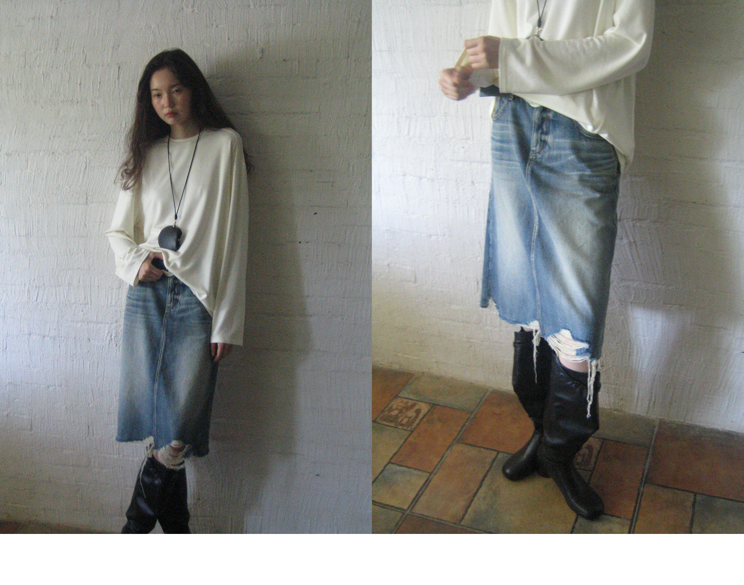素舶 全棉磨破柔雾蓝水洗牛仔裙中长款流苏不规则下摆直筒半身裙