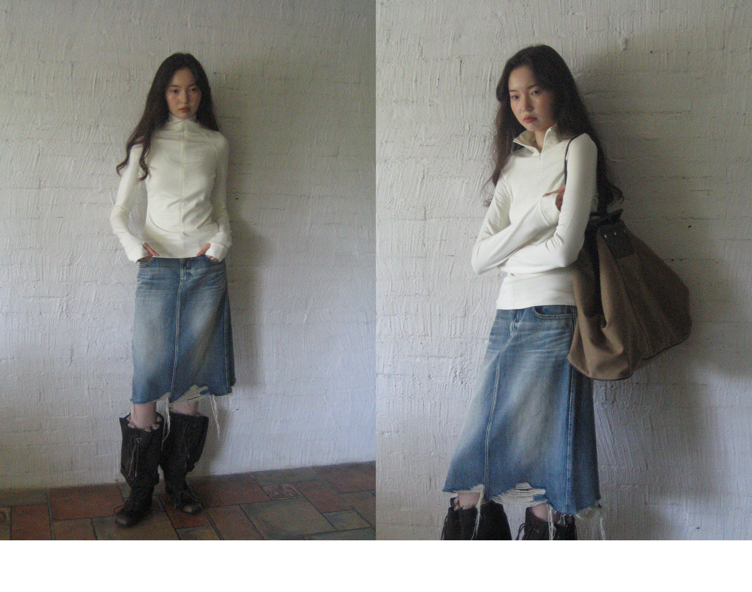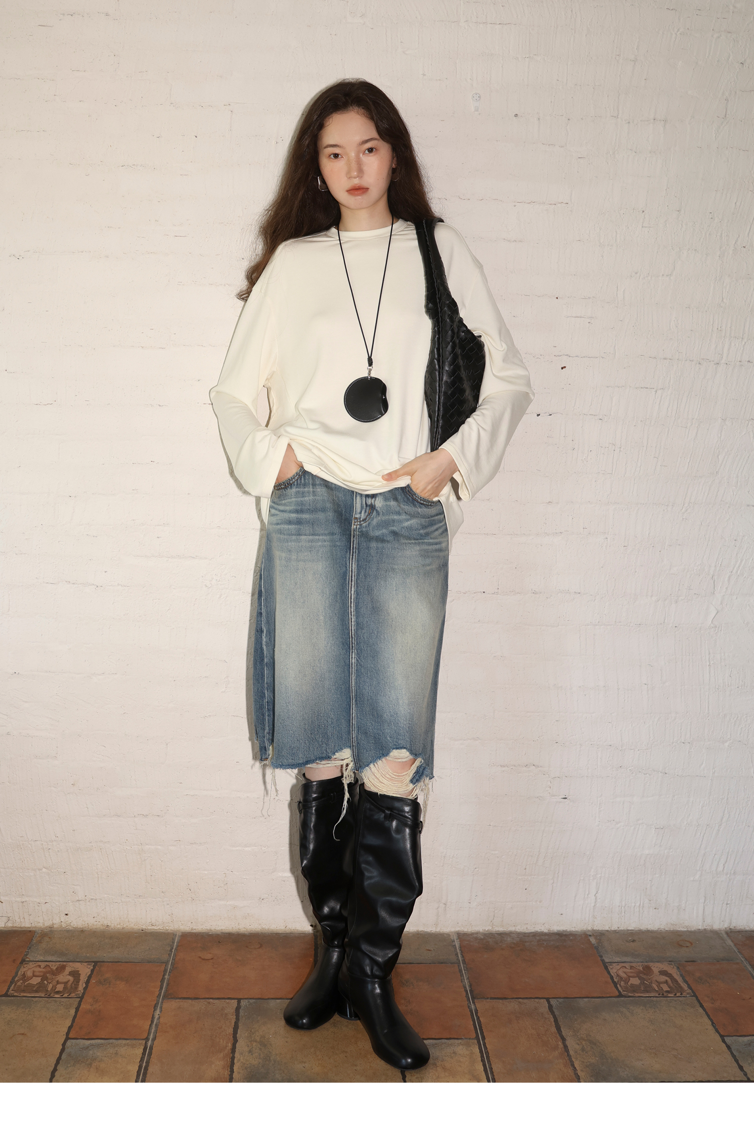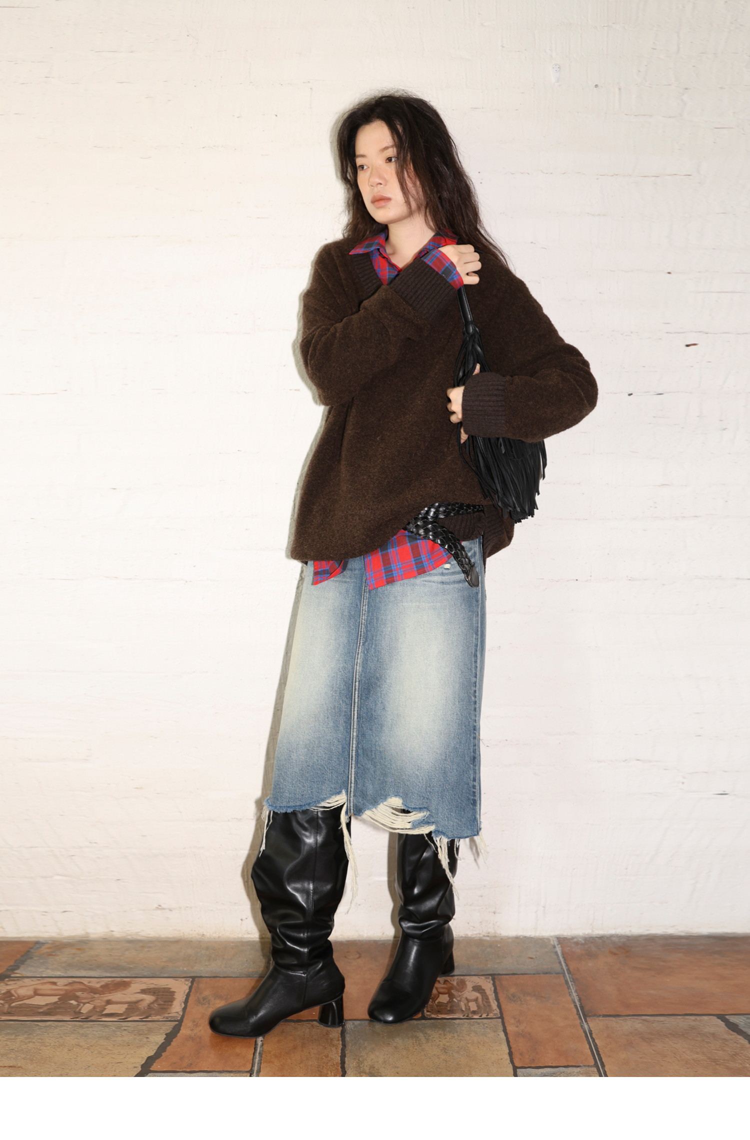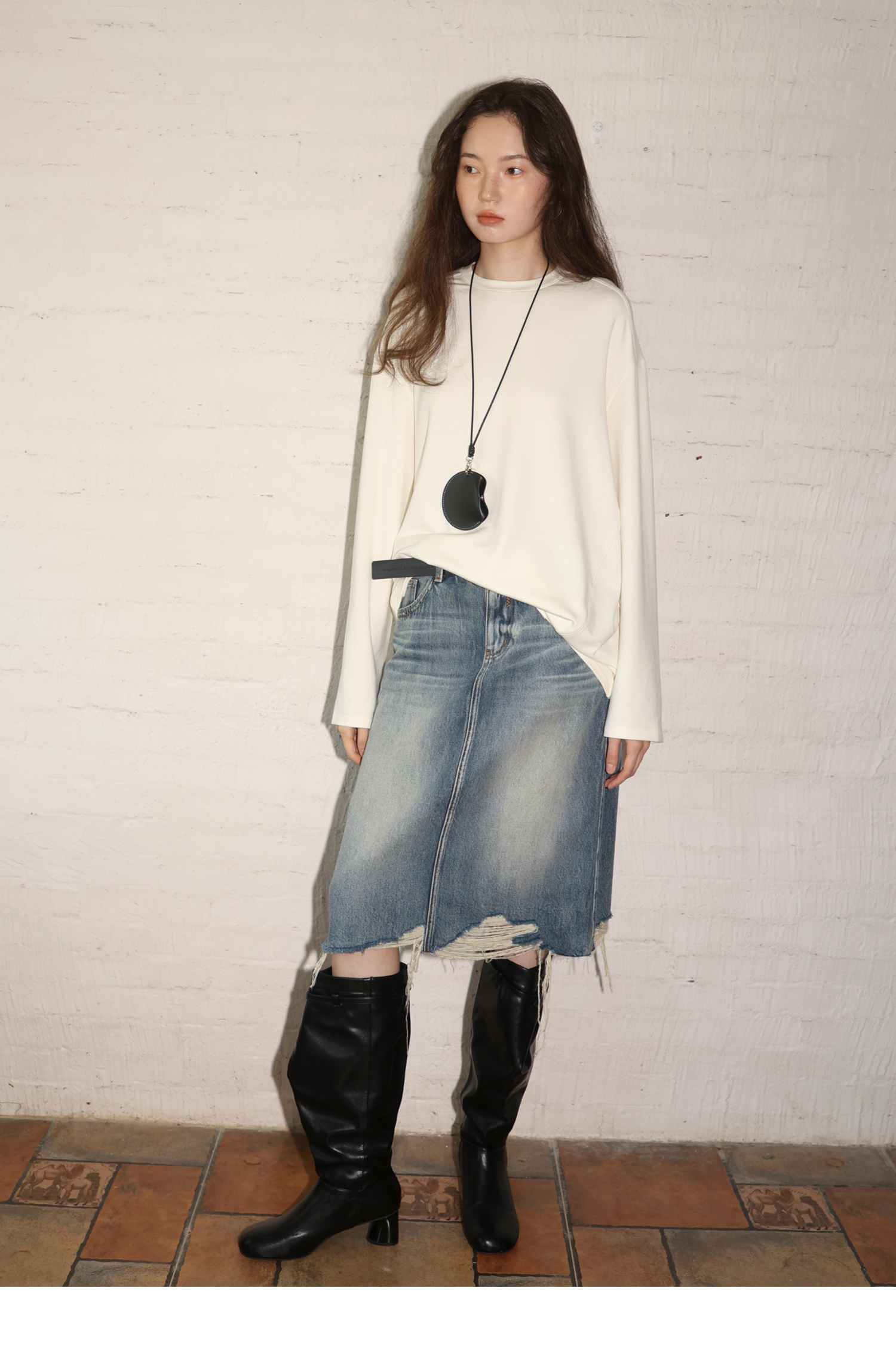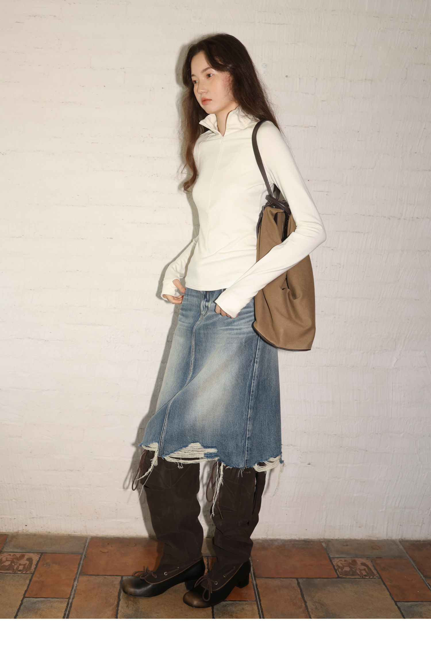 素舶 全棉磨破柔雾蓝水洗牛仔裙中长款流苏不规则下摆直筒半身裙