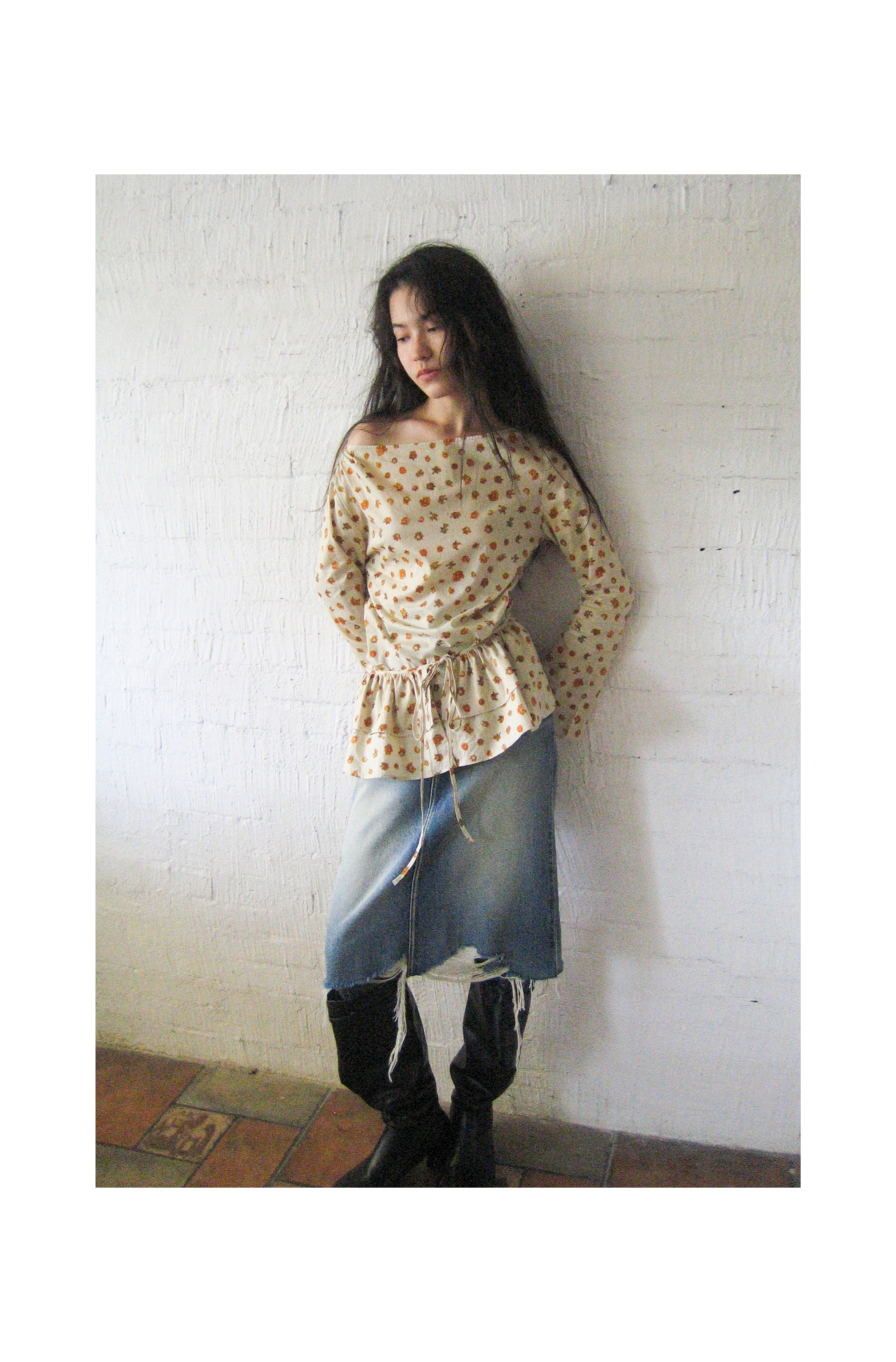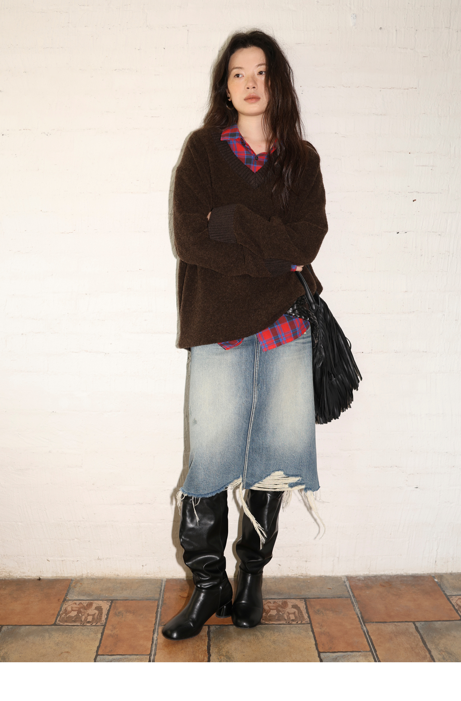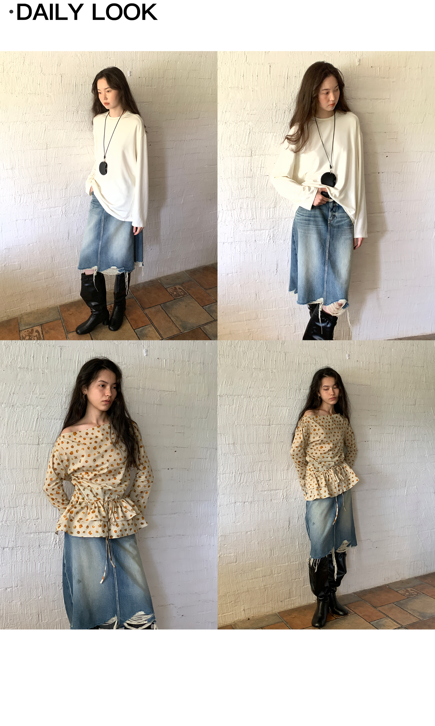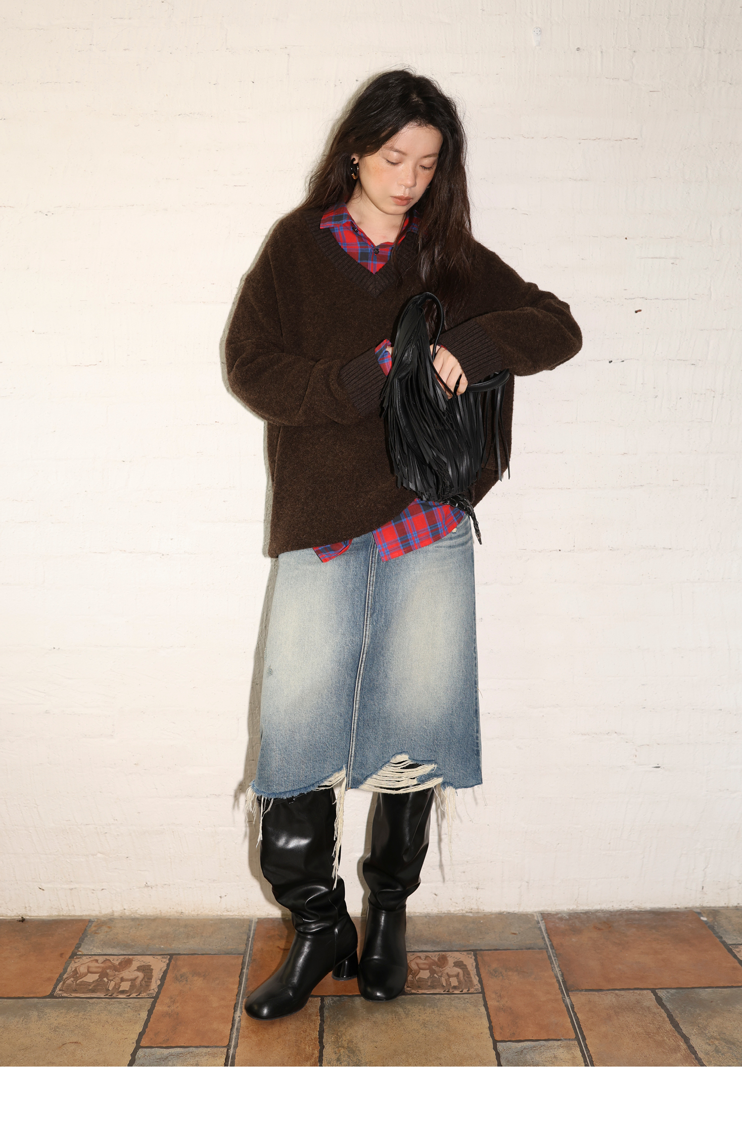 素舶 全棉磨破柔雾蓝水洗牛仔裙中长款流苏不规则下摆直筒半身裙