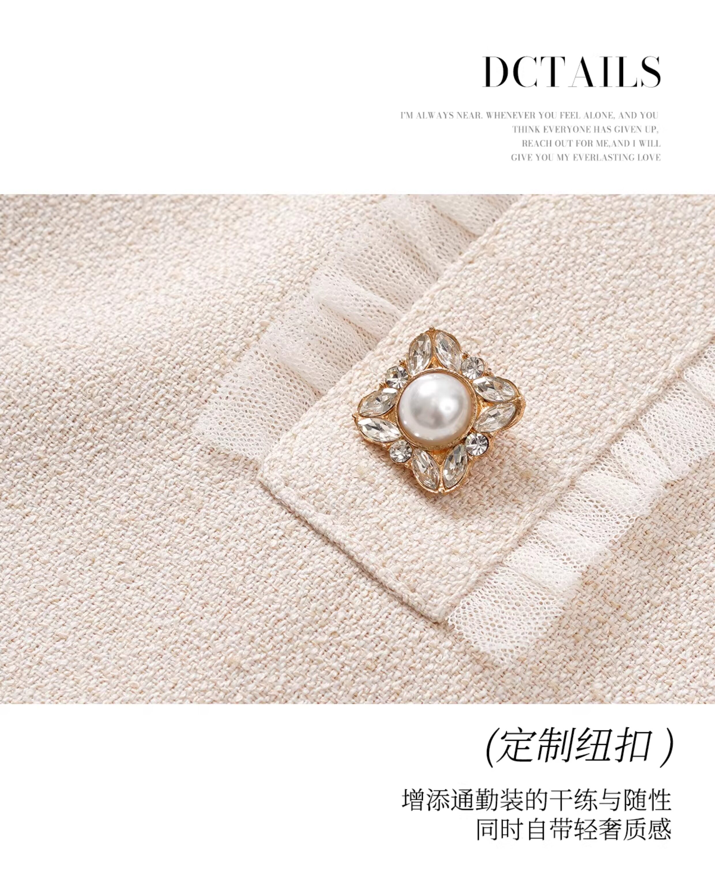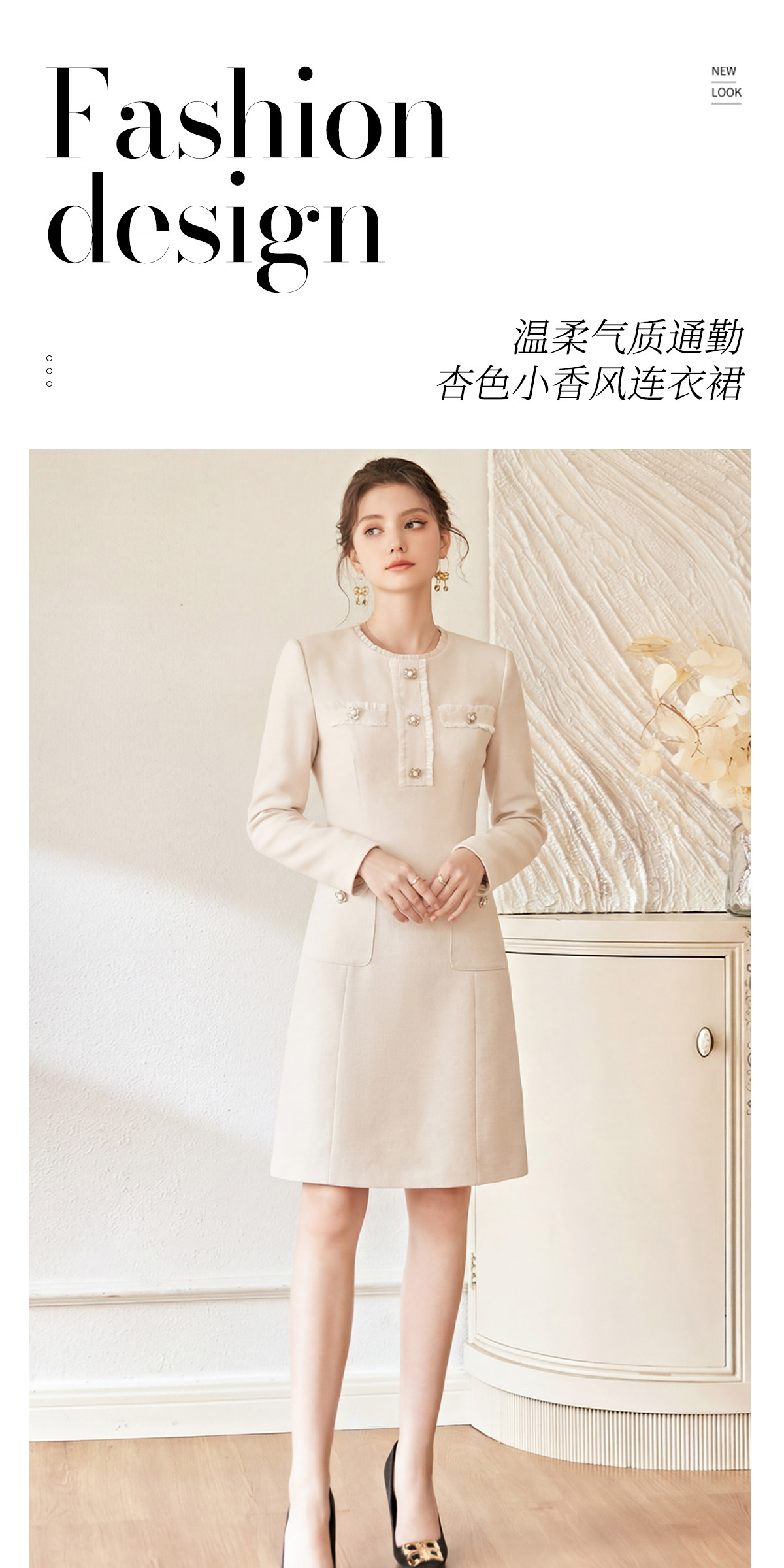 艾尚臣木耳边小香风轻奢优雅米白色连衣裙女长袖珍珠扣修身高级感