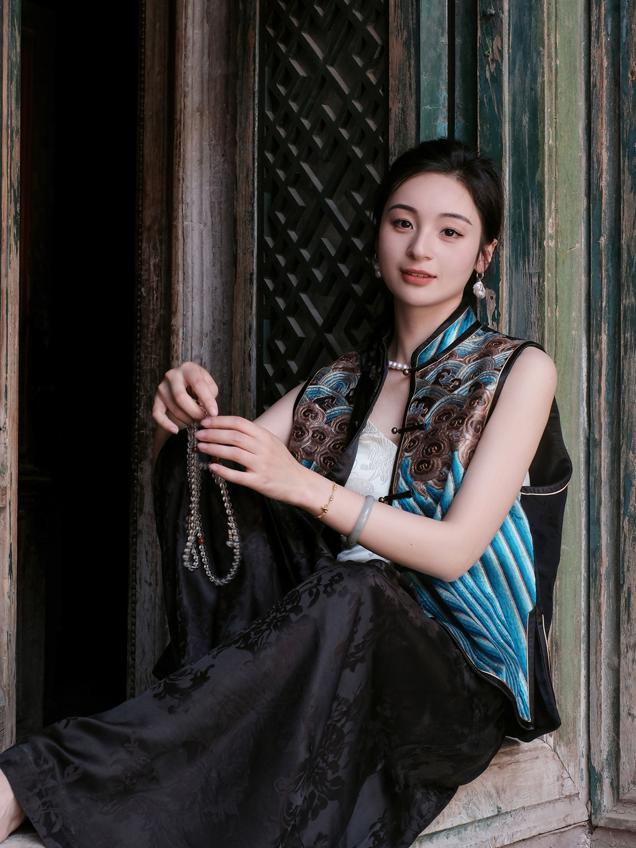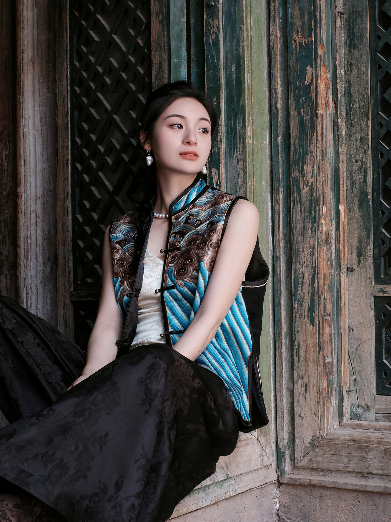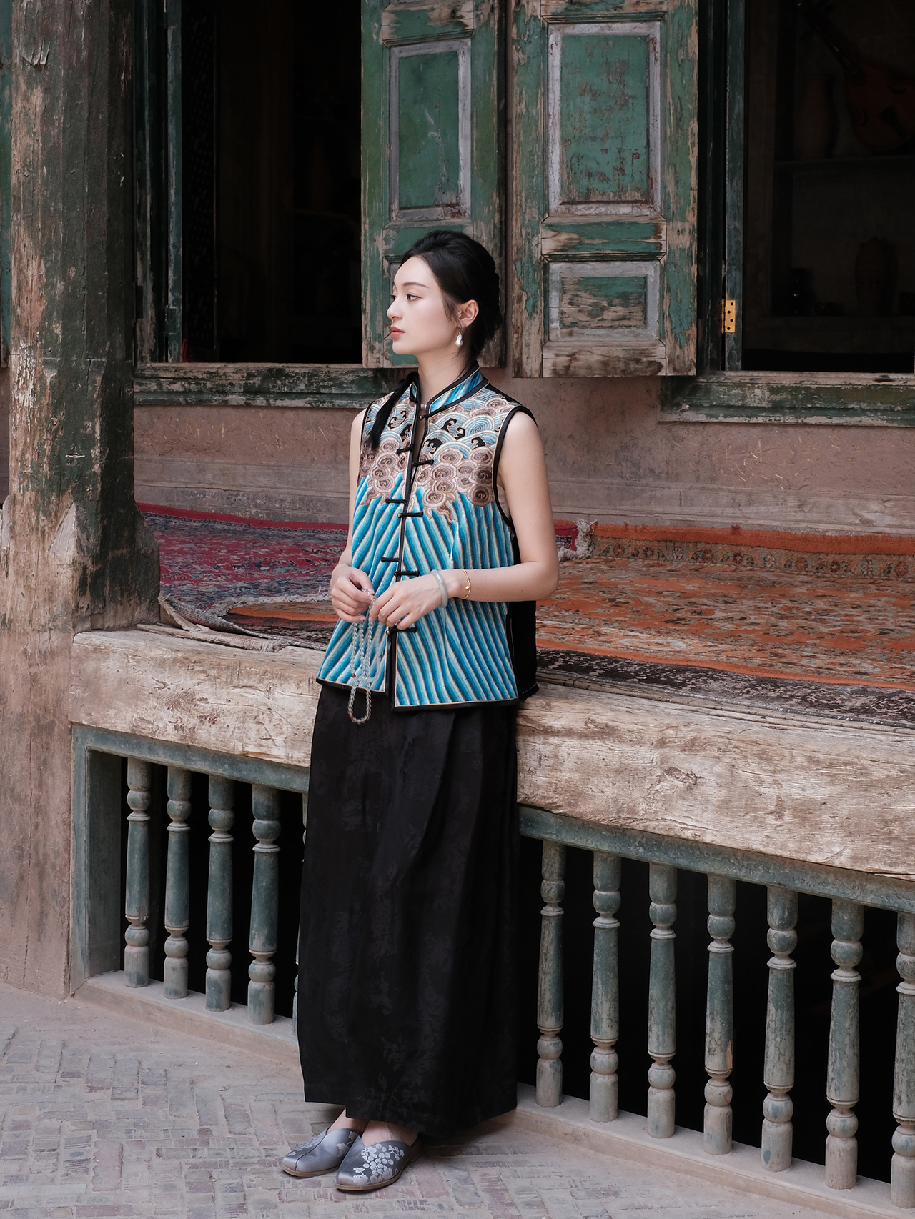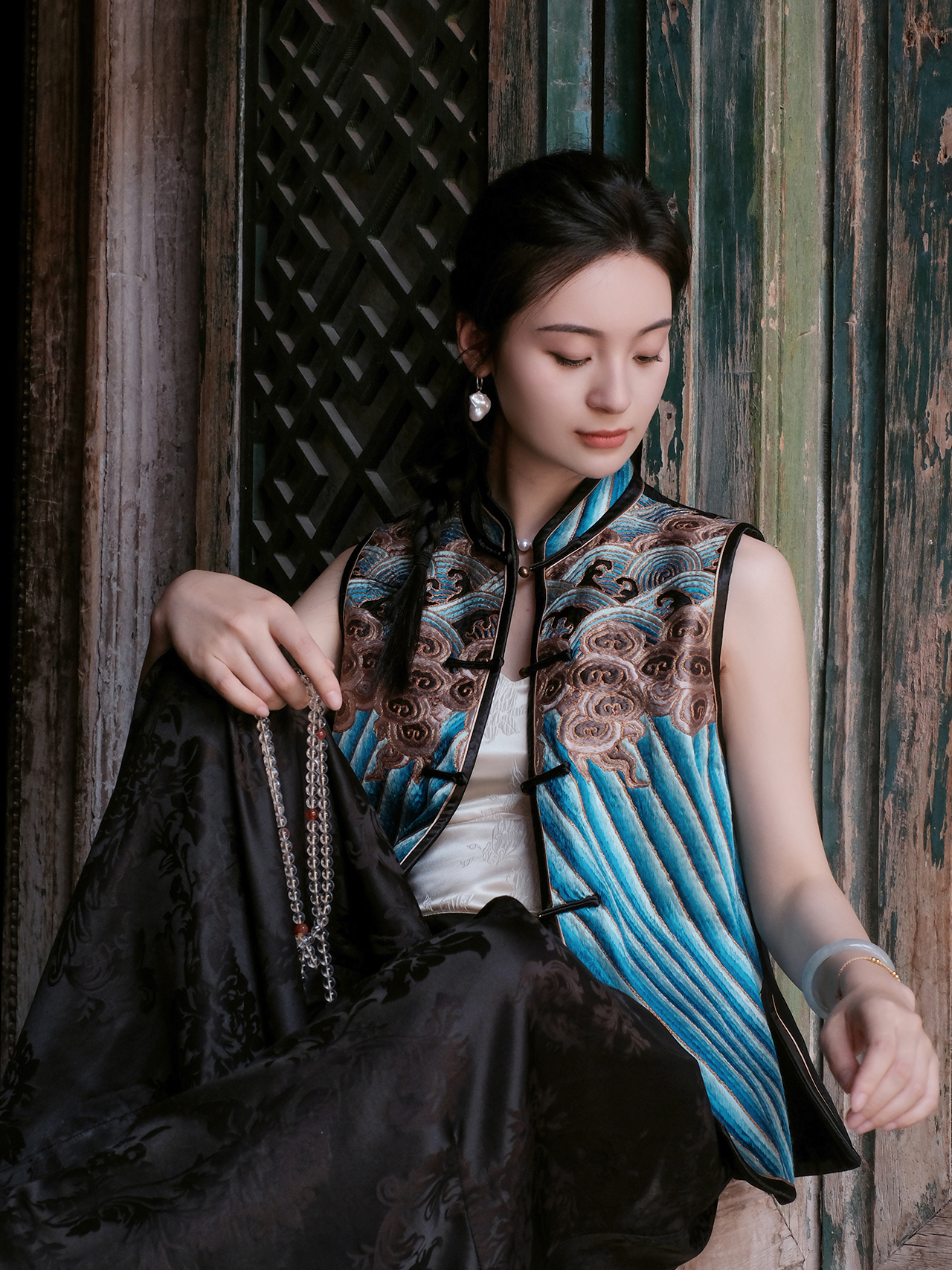 盛唐牡丹盛奢系列|老绣片江崖海水纹马夹(特殊商品不退不换)