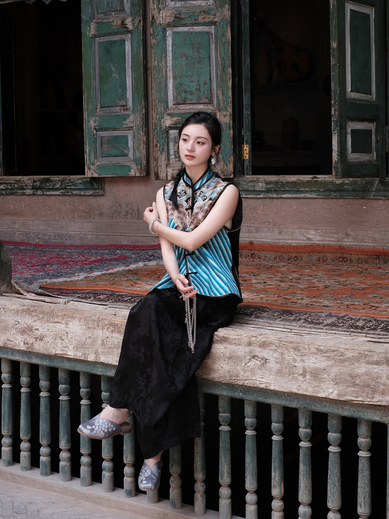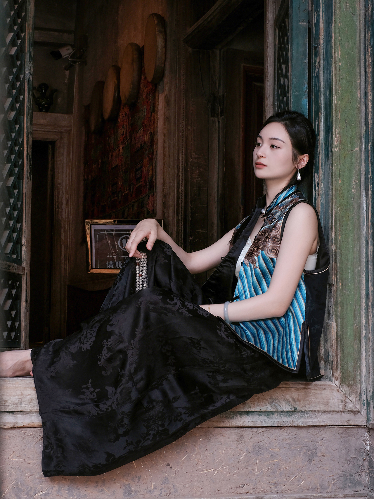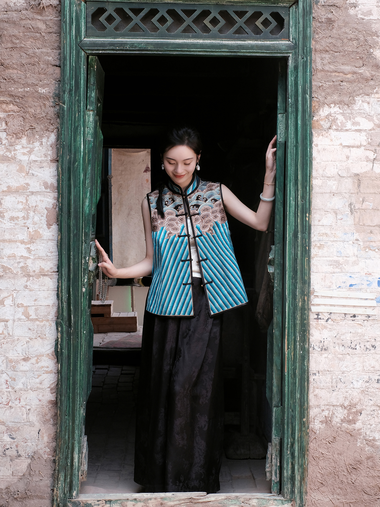 盛唐牡丹盛奢系列|老绣片江崖海水纹马夹(特殊商品不退不换)