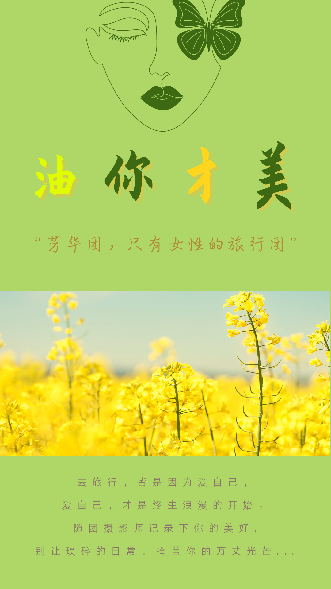 孩子志·芳华行【油你才美】 4/16 专属女性的旅行,爱自己,才是浪漫的开始。别让琐碎的日常,掩盖你的万丈光芒!