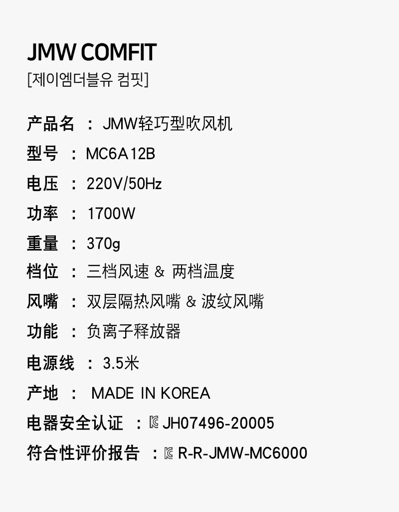 JMW 韩国进口小巧轻便大功率发型师发廊理发店专业造型吹风机