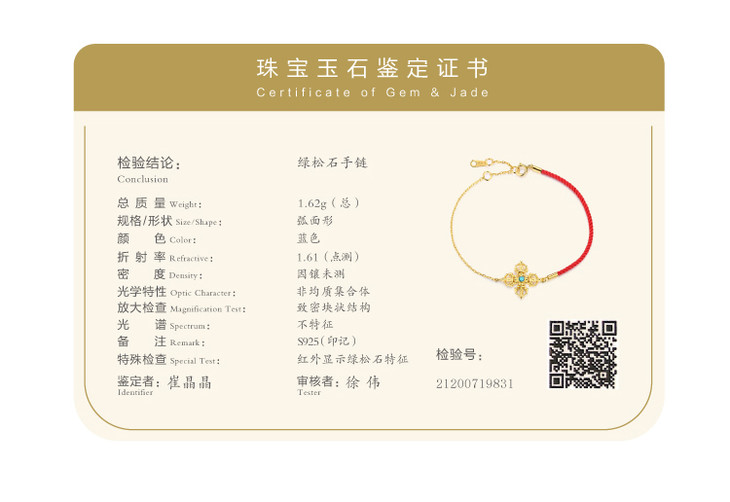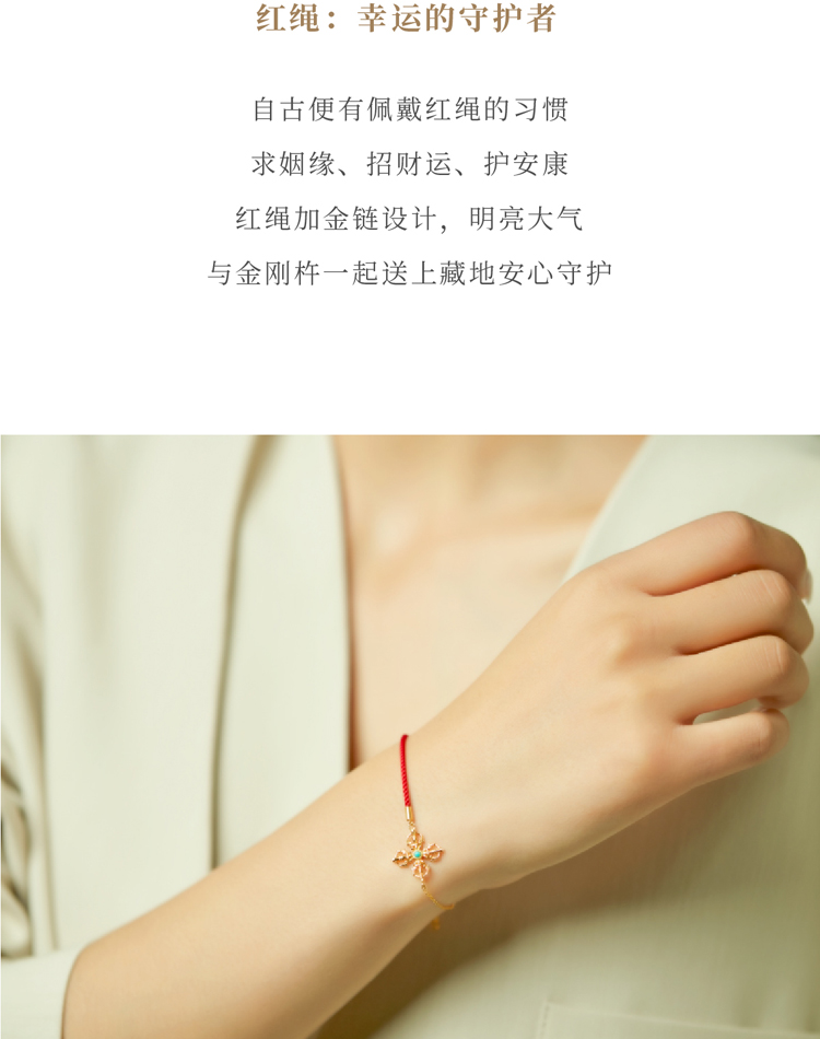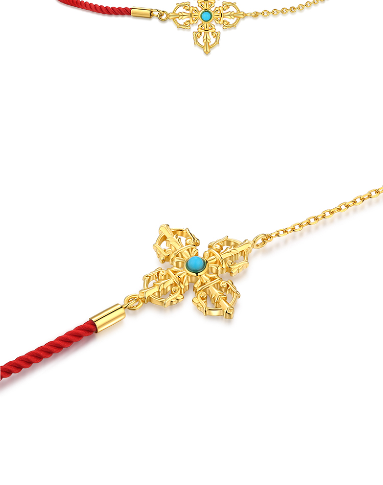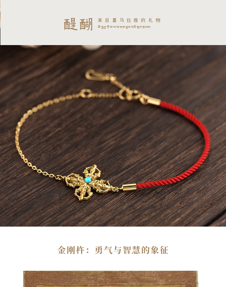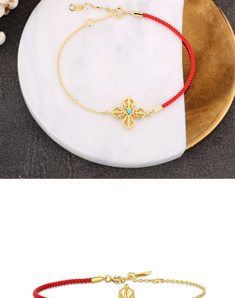 醍醐十字金刚杵红绳手链 925银镀金 原矿松石