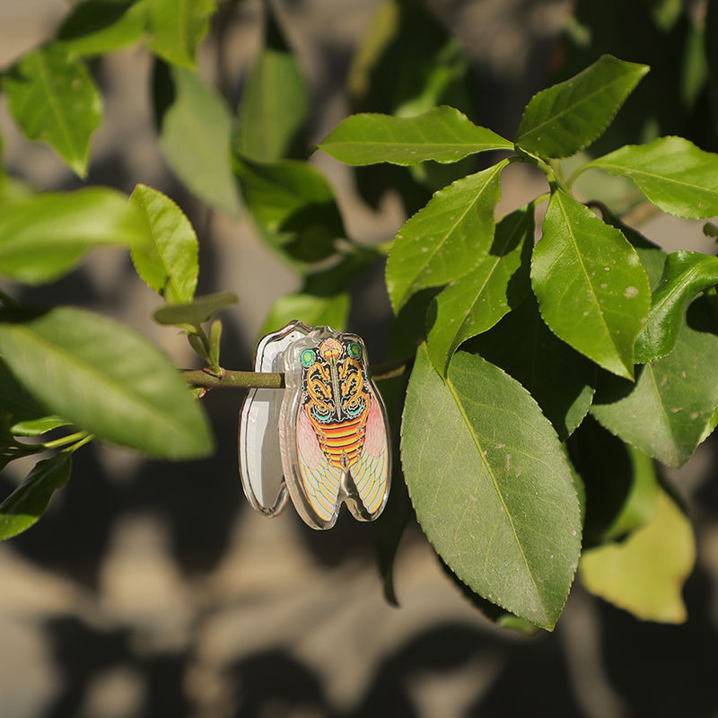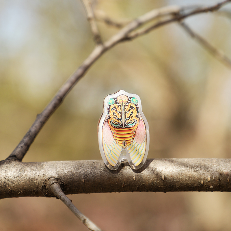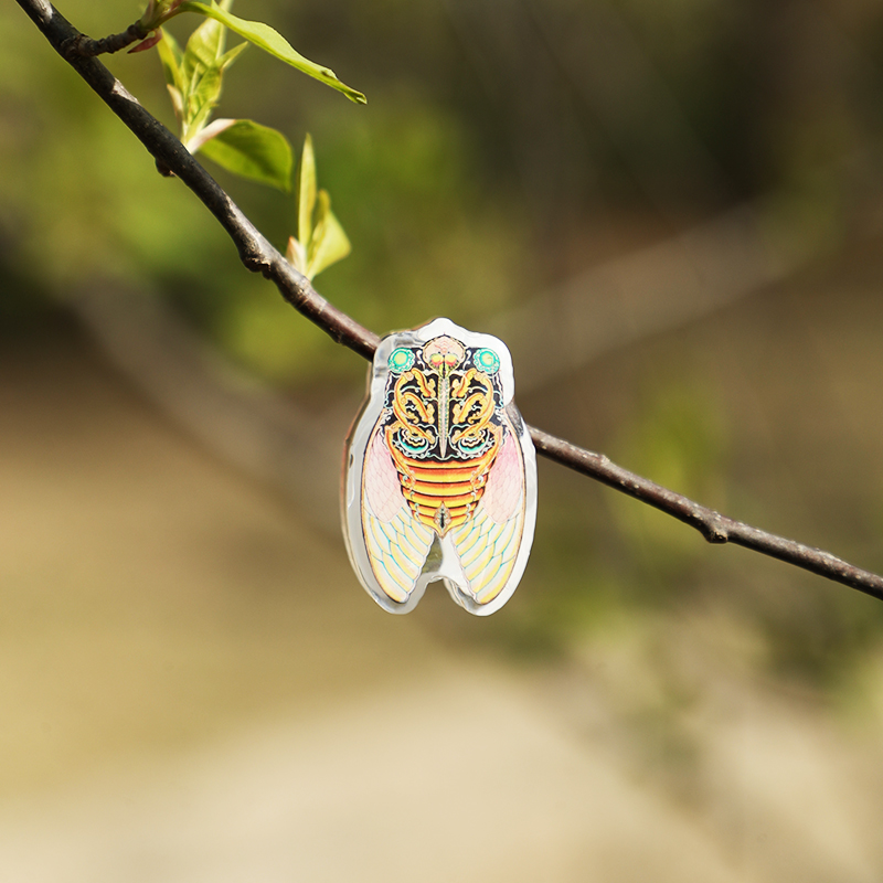 知了在仿生的同时巧妙嵌入红蝠、寿桃、祥云等多种吉祥图案,纹饰精美。