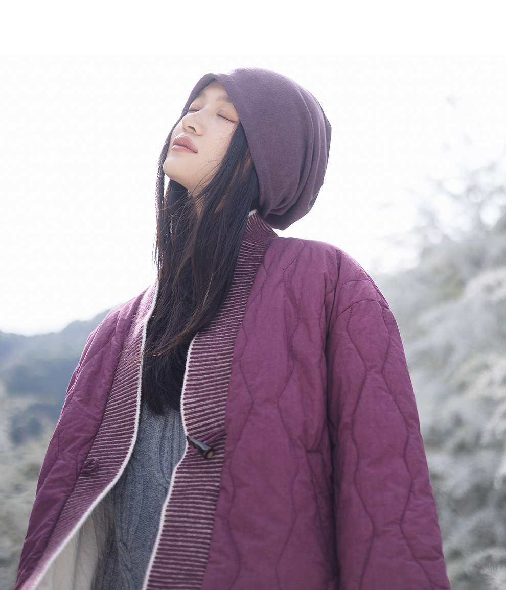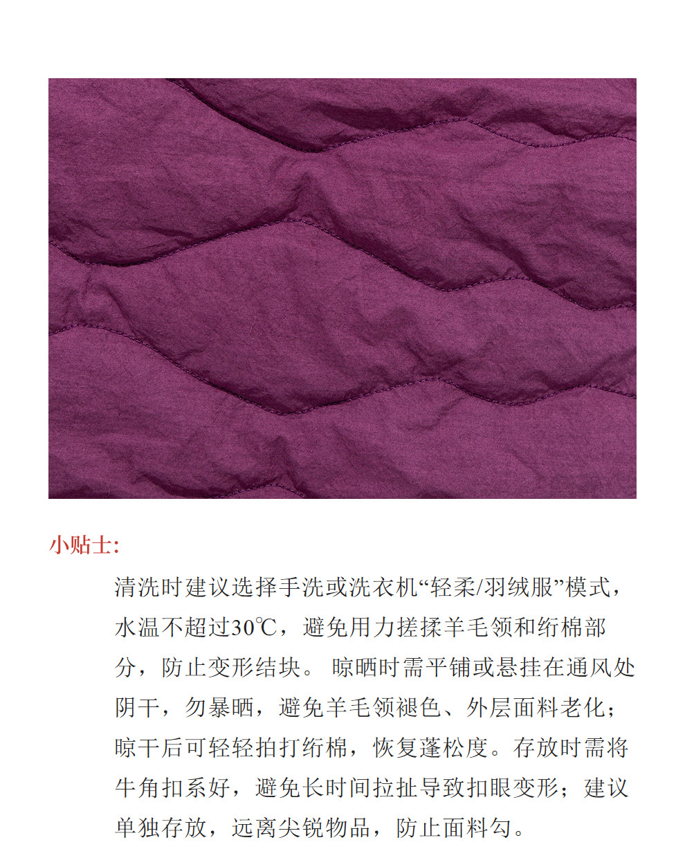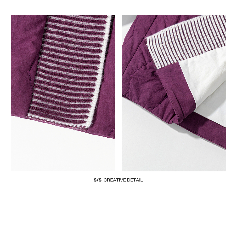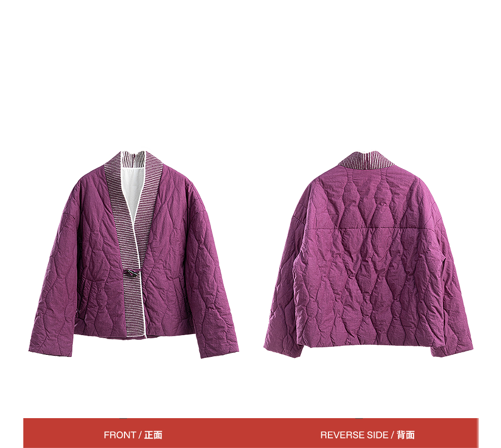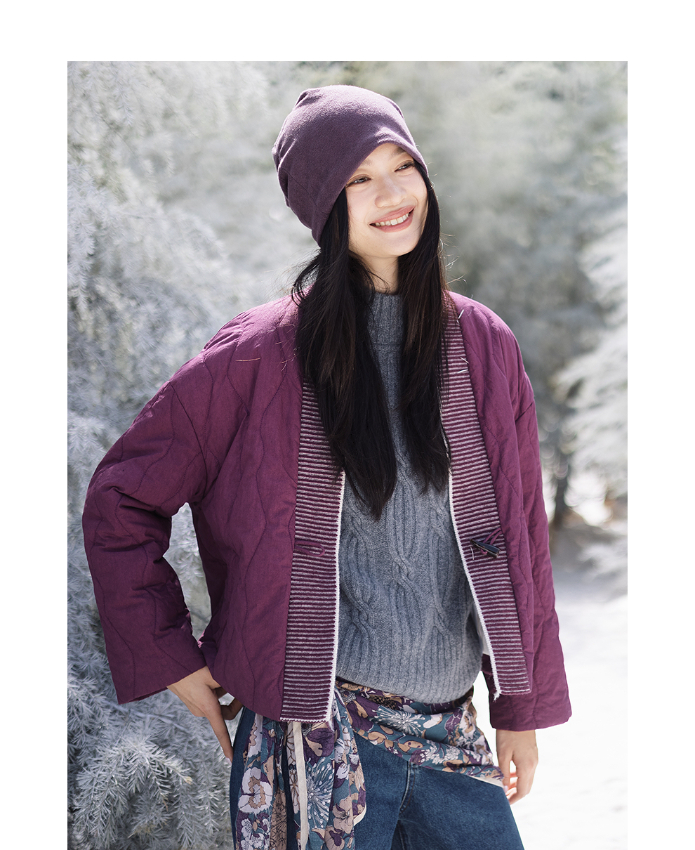 绽放736朵/紫葫芦棉服·葫芦形绗棉毛织拼接v领短棉衣新款厚外套
