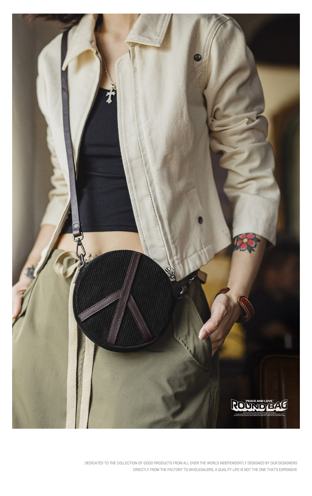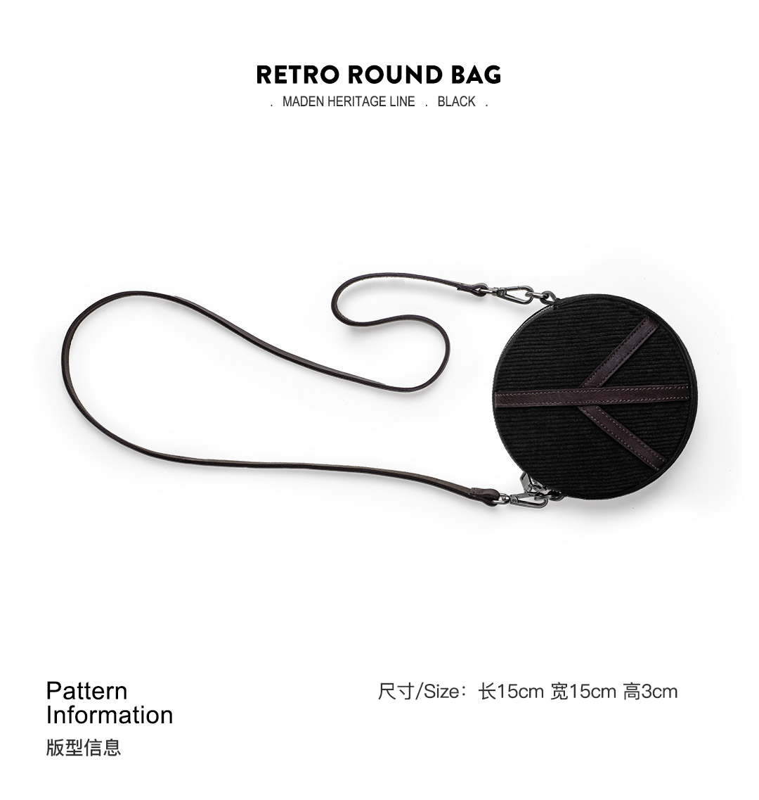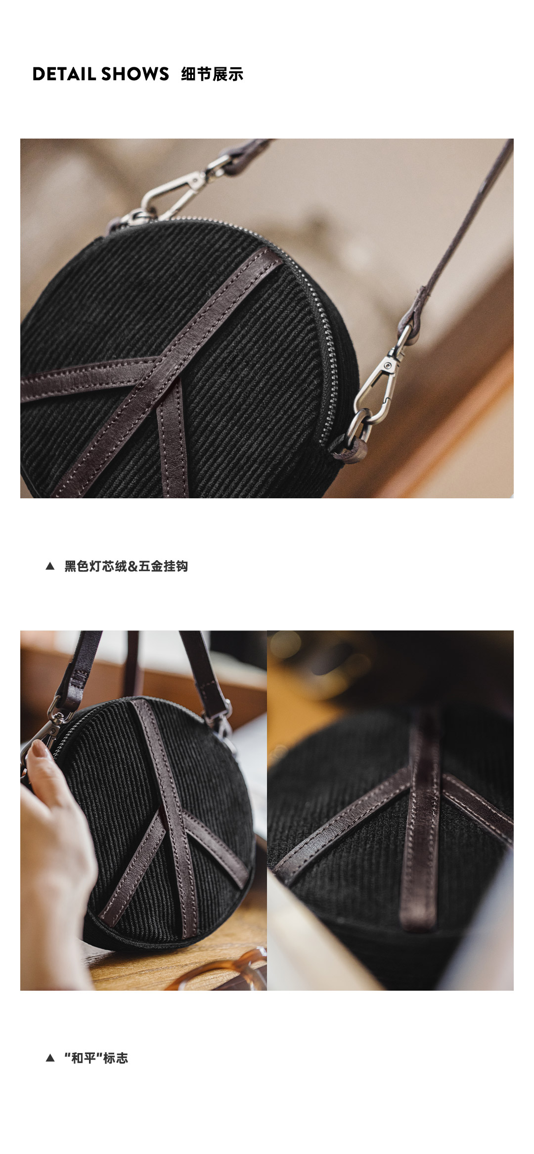 马登黑色灯芯绒斜挎小型圆包超轻便迷你精致复古随身单肩包包女士