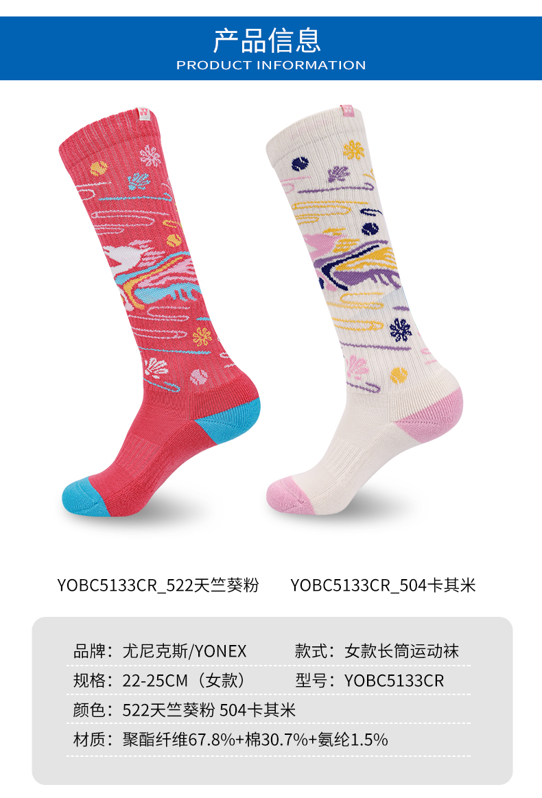 YONEX尤尼克斯羽毛球袜马年限定YOBC5133CR女款加厚毛巾底长筒运动袜