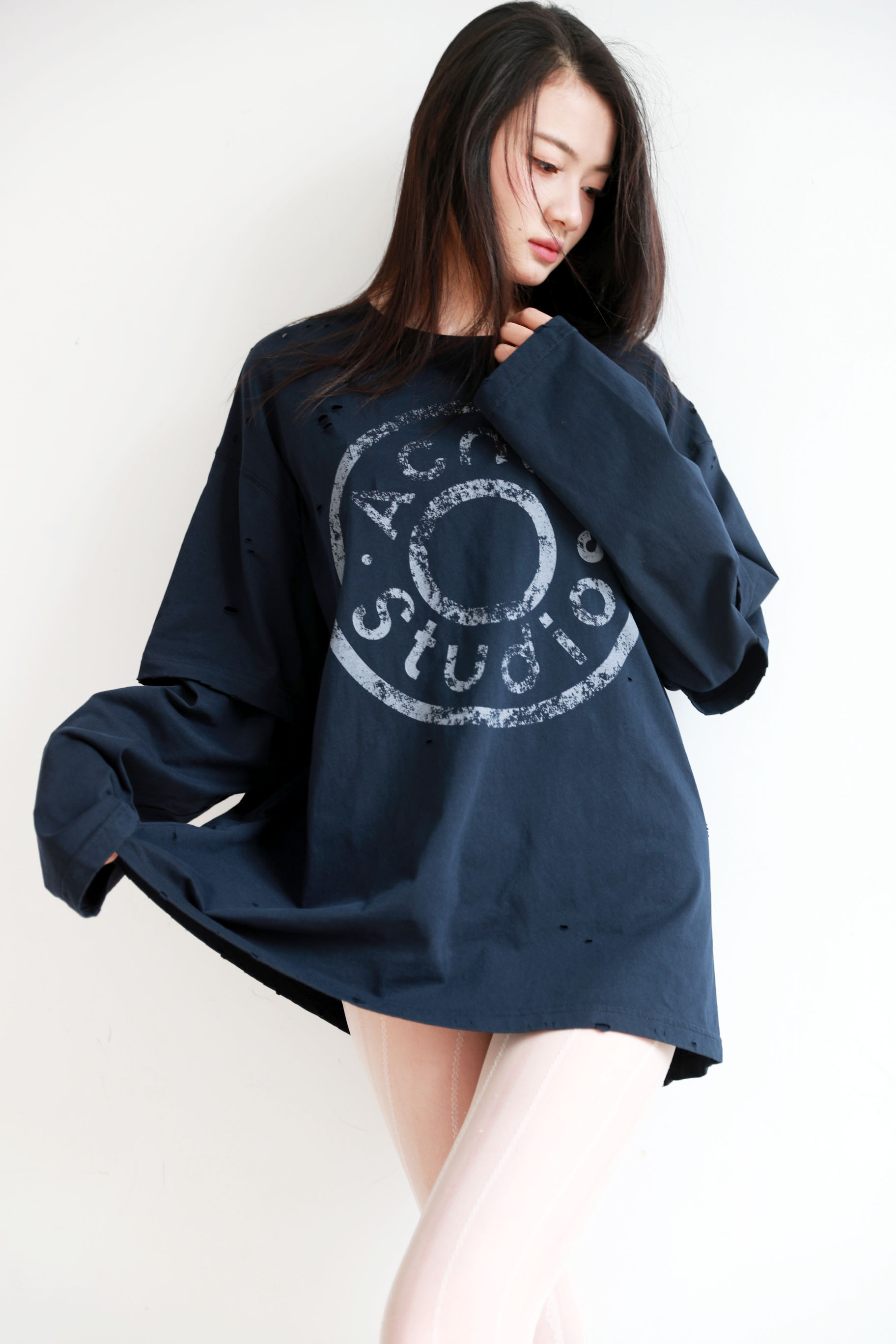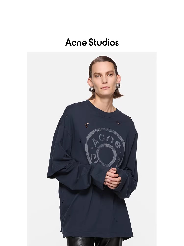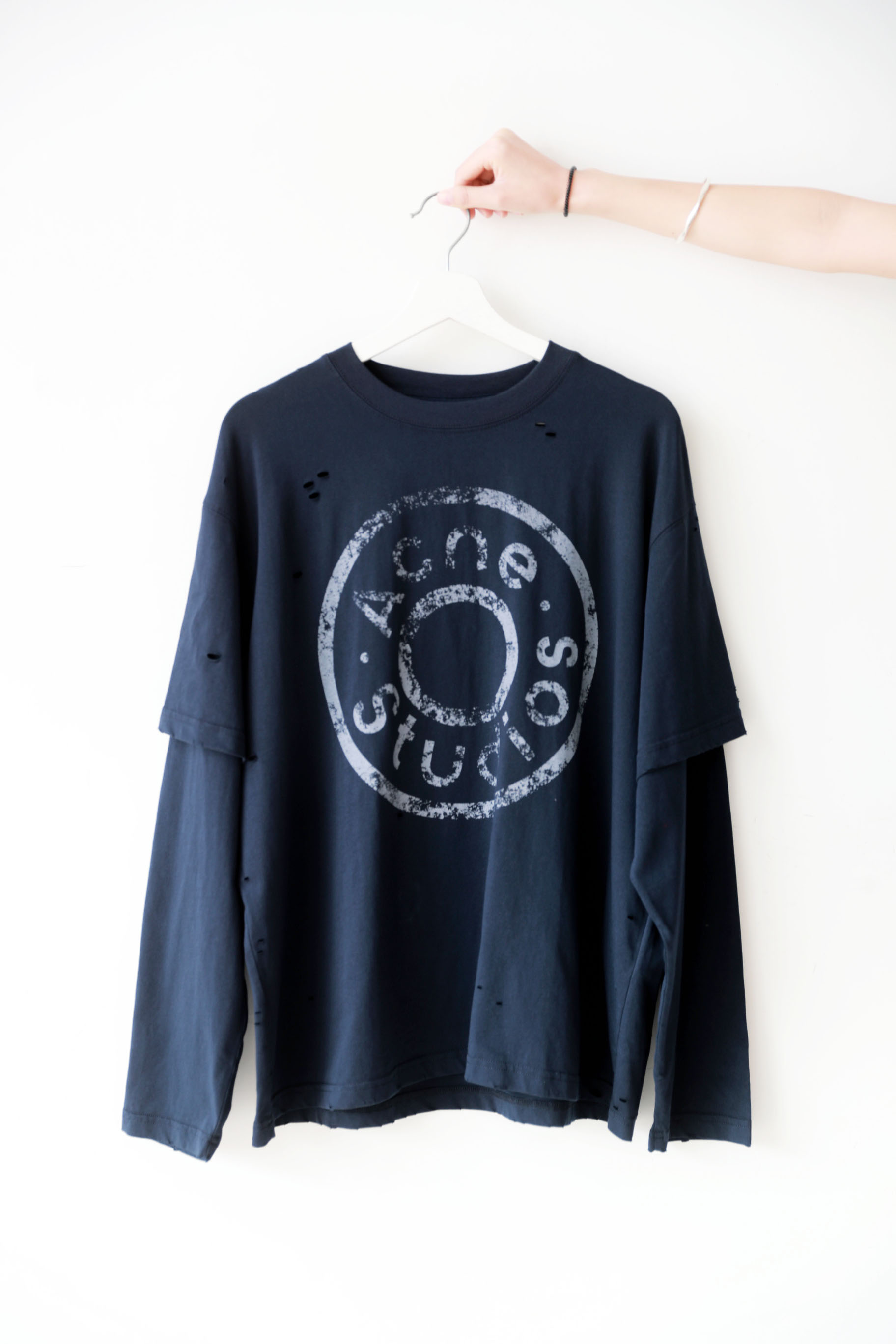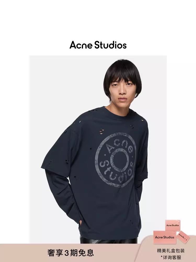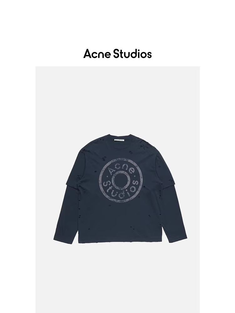 假两件长袖tee,胸口字母印花。复古做旧破洞水洗圆领上衣E010658