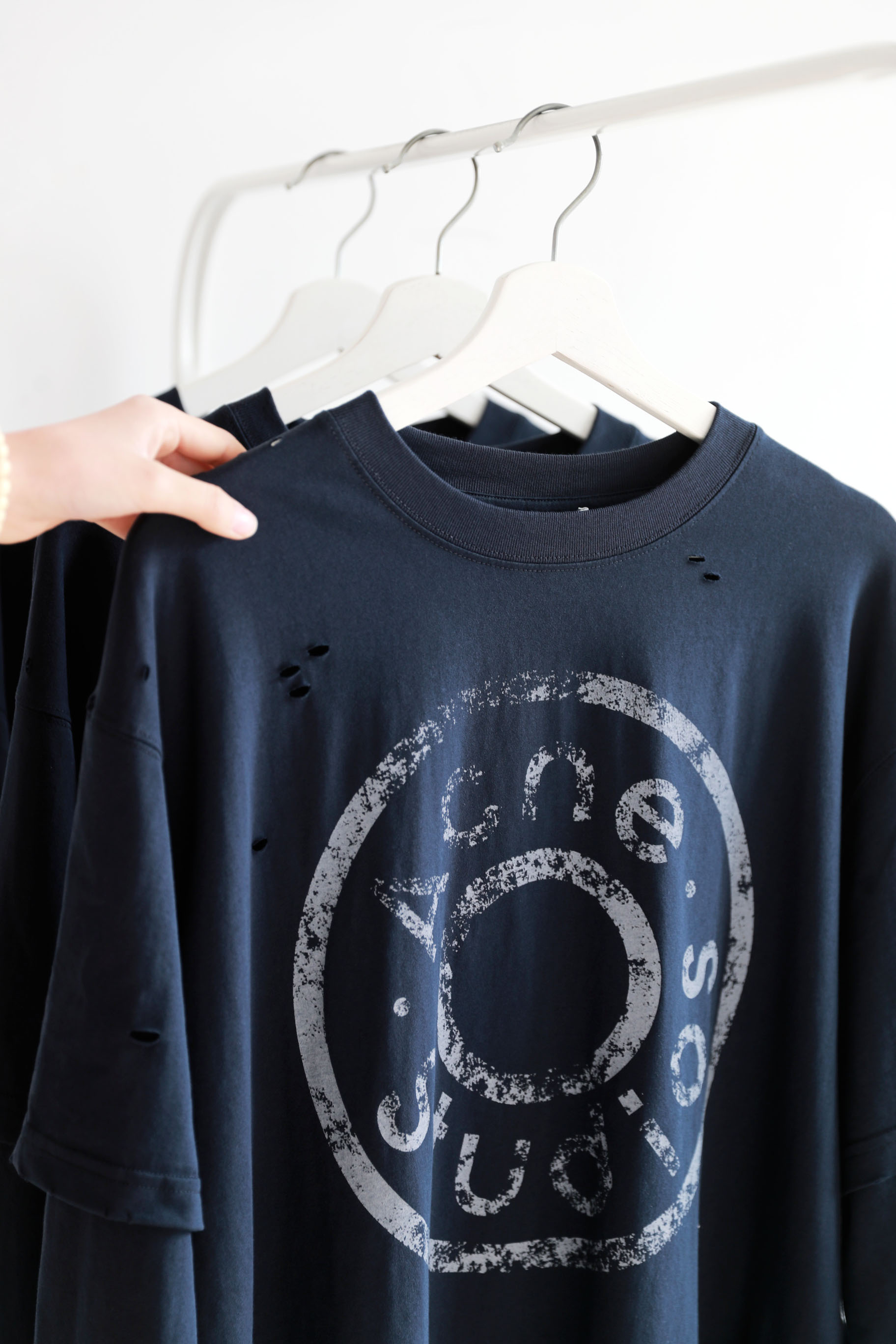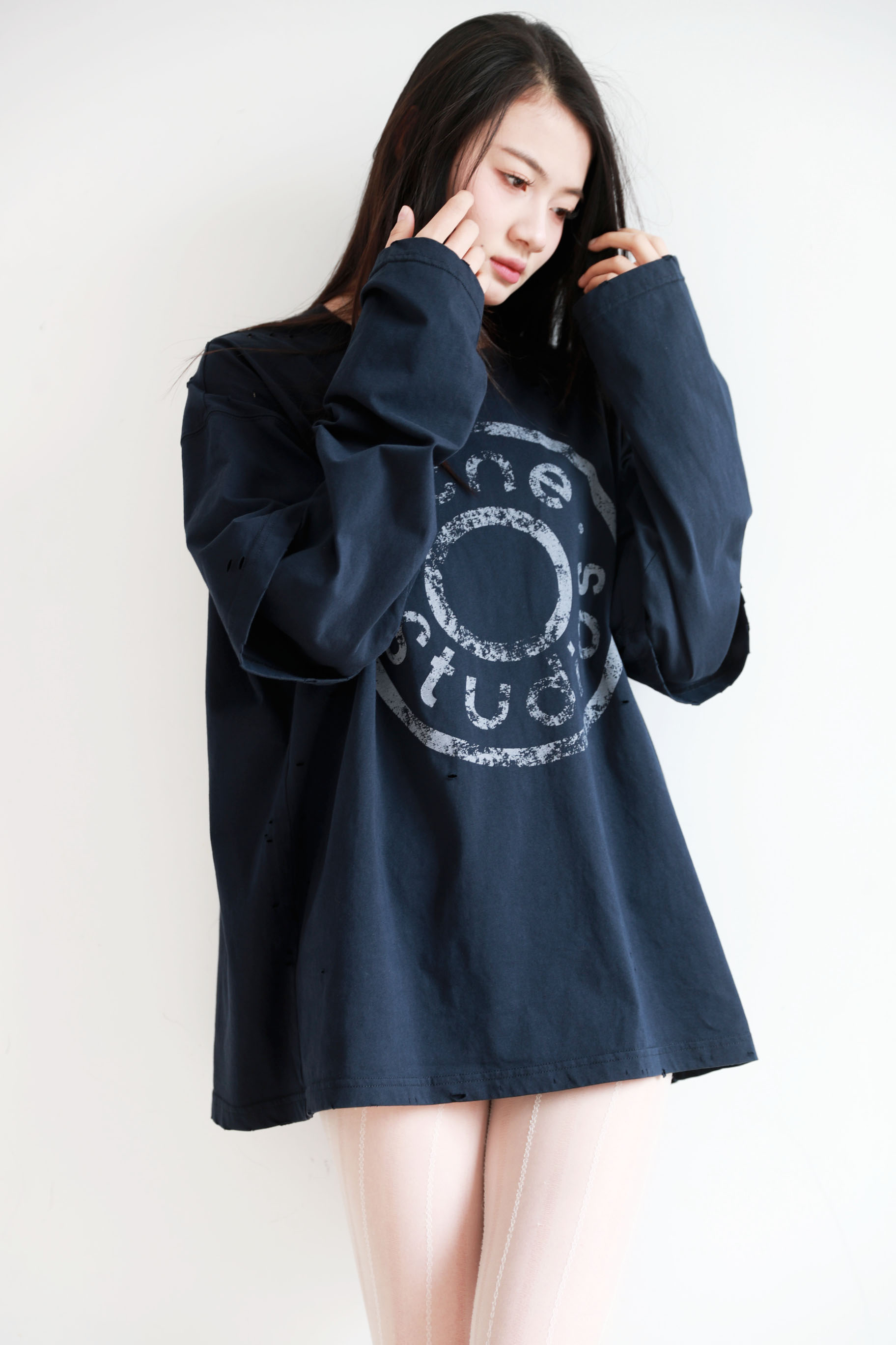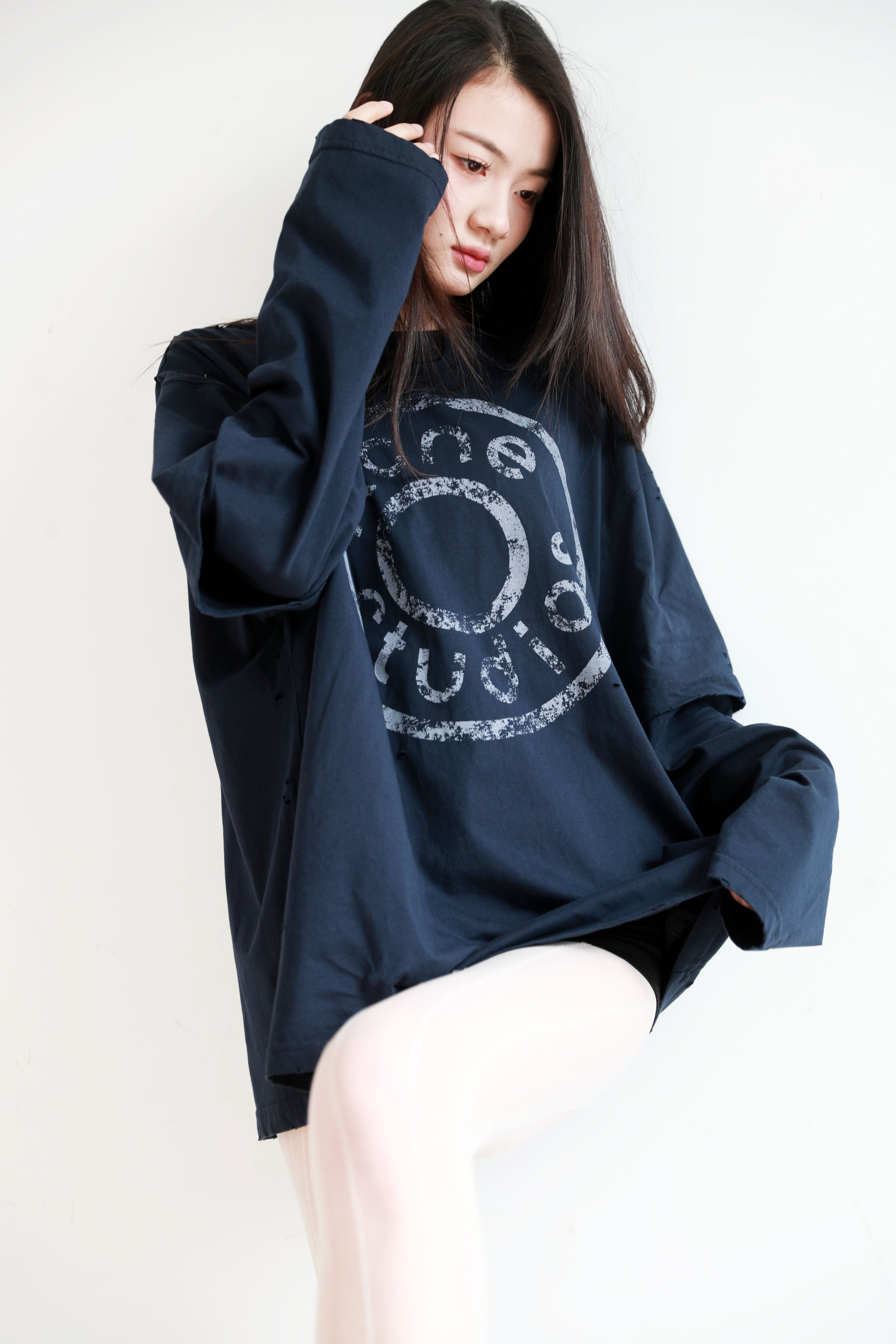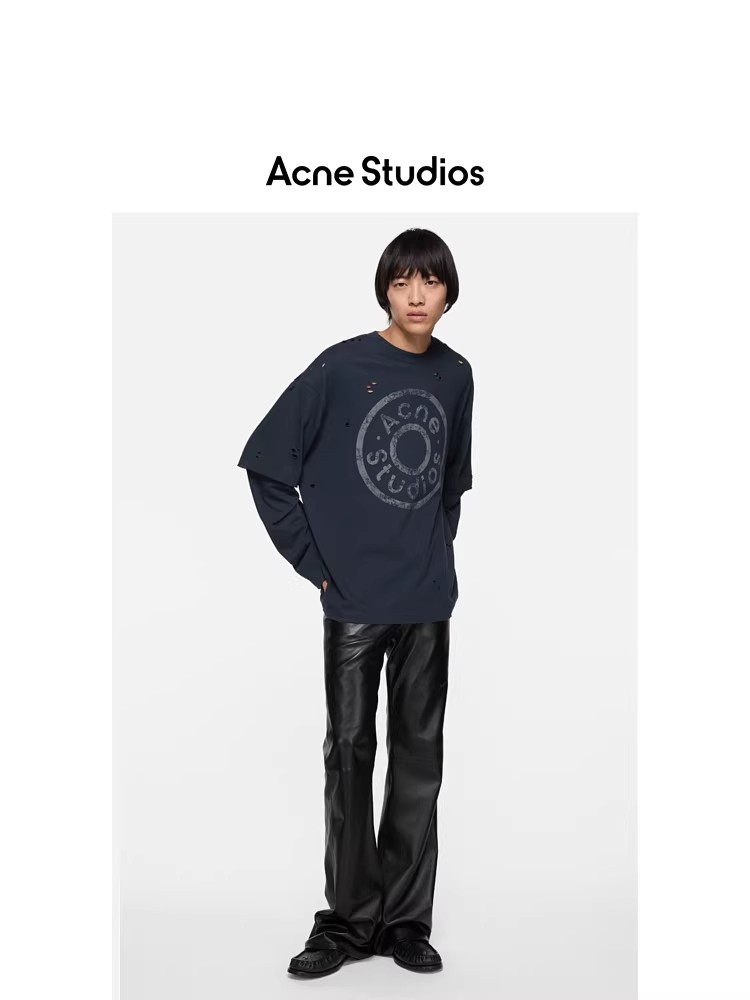 假两件长袖tee,胸口字母印花。复古做旧破洞水洗圆领上衣E010658
