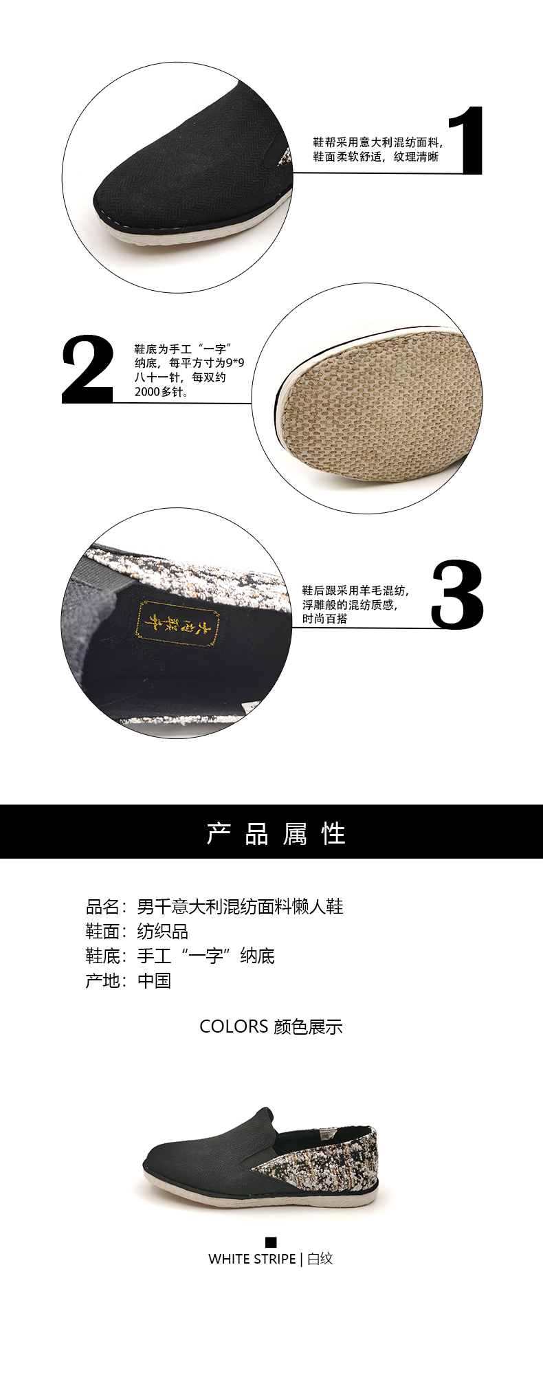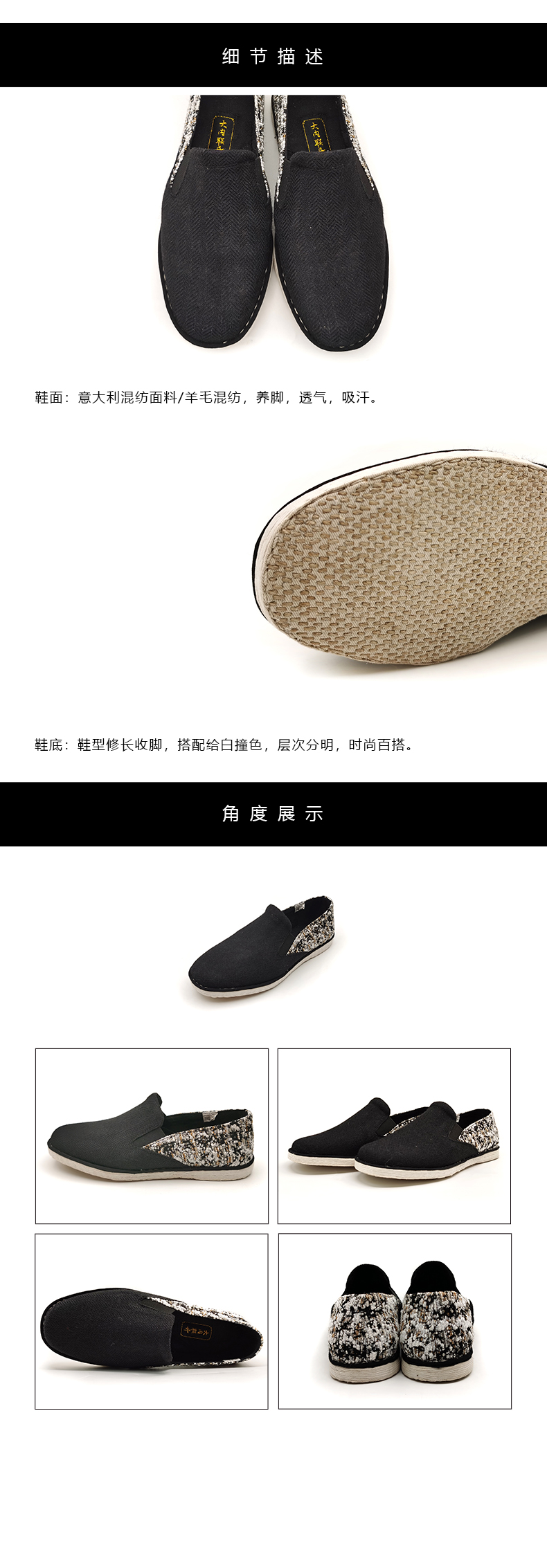 内联升男鞋手工单鞋千层底意大利混纺面料松紧口巾舌鞋DN8517
