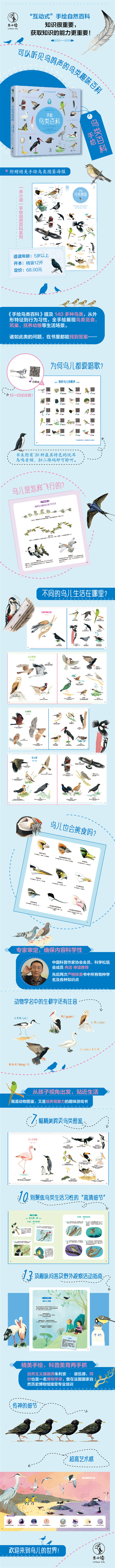 这是一本给5岁以上孩子的手绘自然百科,书中提及140多种鸟类,从外形特征到行为习性,全手绘展现鸟类觅食、筑巢、抚养幼雏等生活场景。13项趣味问答及野外观察活动指南,让孩子了解更多关于鸟类的高清细节。附有20种悦耳鸟鸣音频,扫二维码即可聆听天籁之声。还附赠精美图鉴。