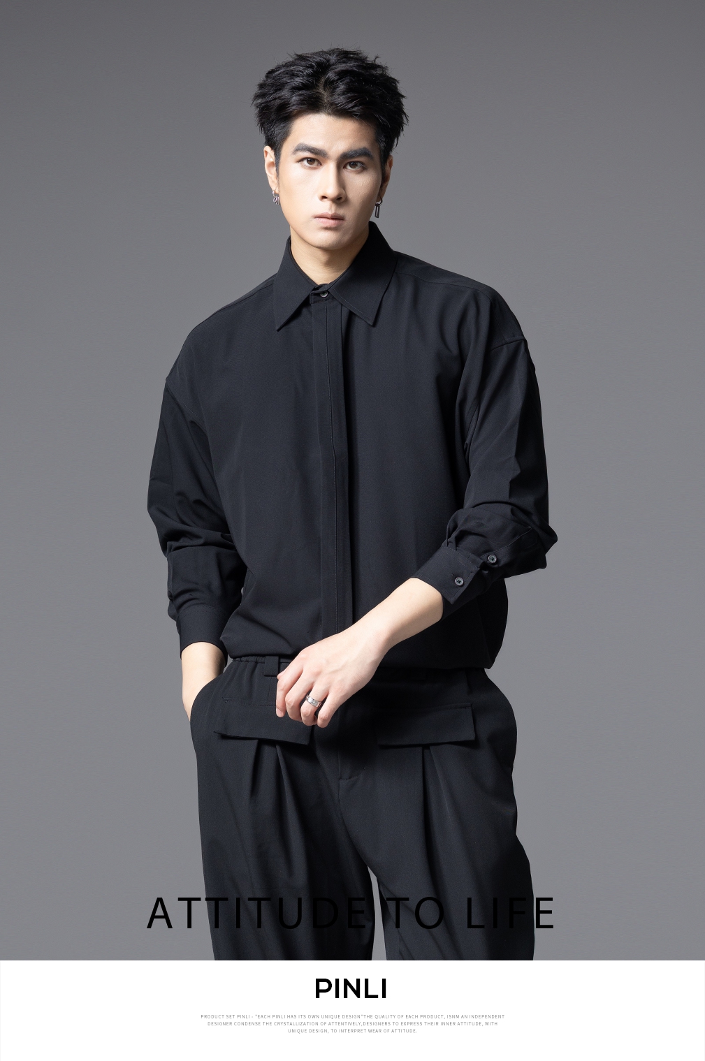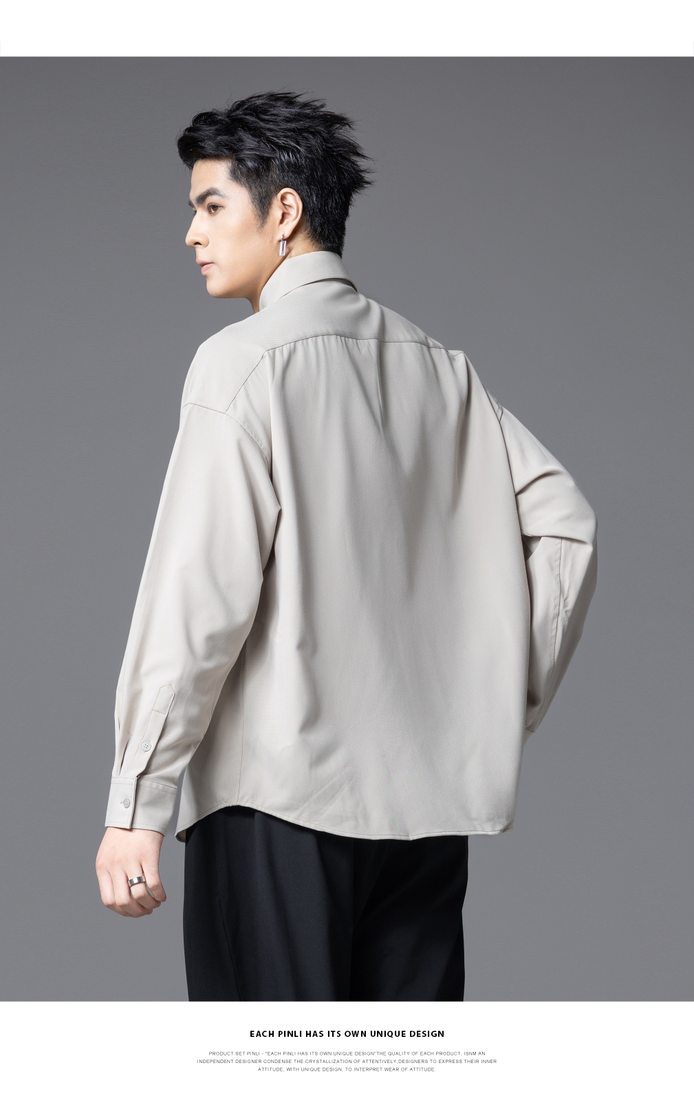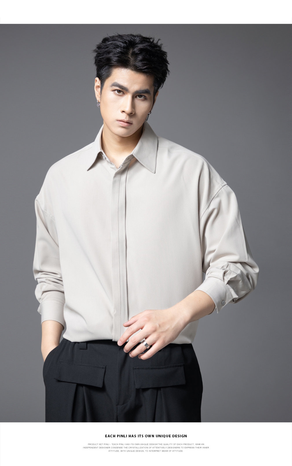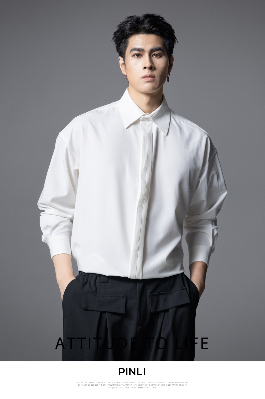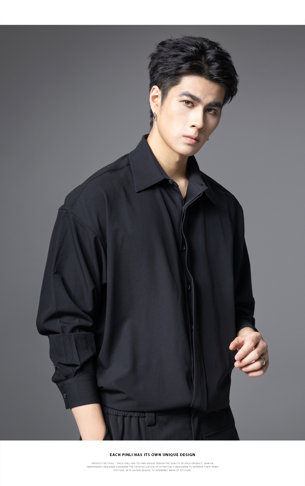 PINLI品立2025秋季新款男士宽松尖领纯色打底长袖衬衫休闲衬衣潮GD253113066
