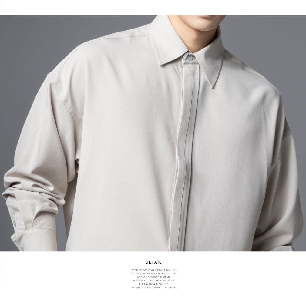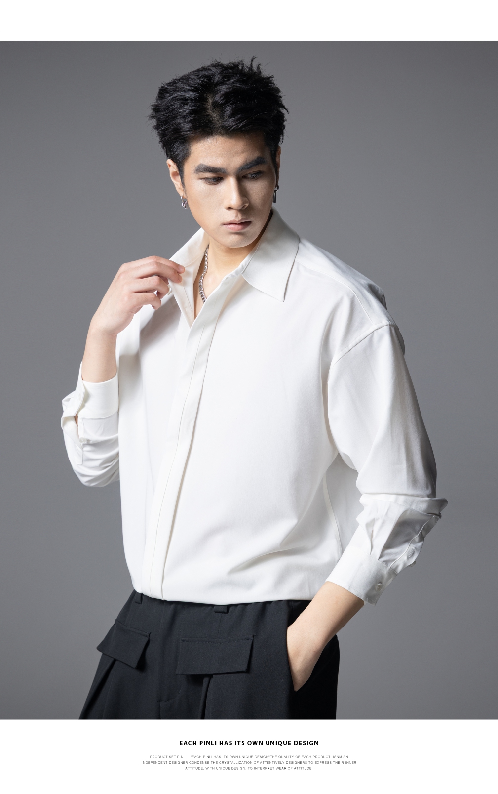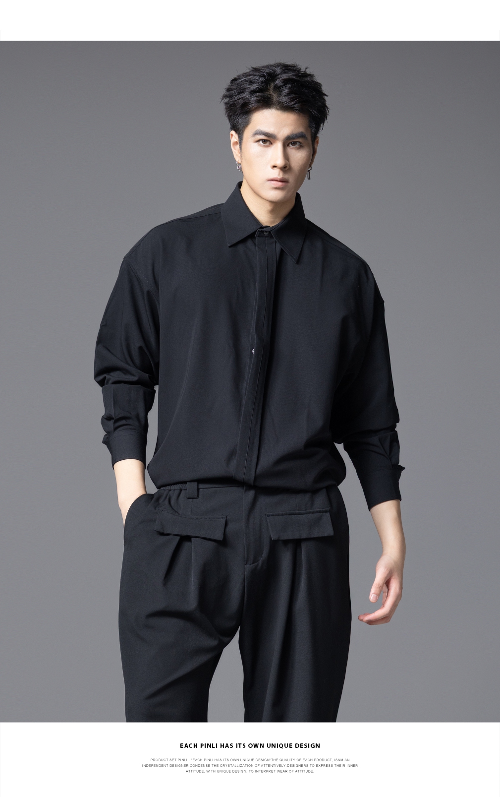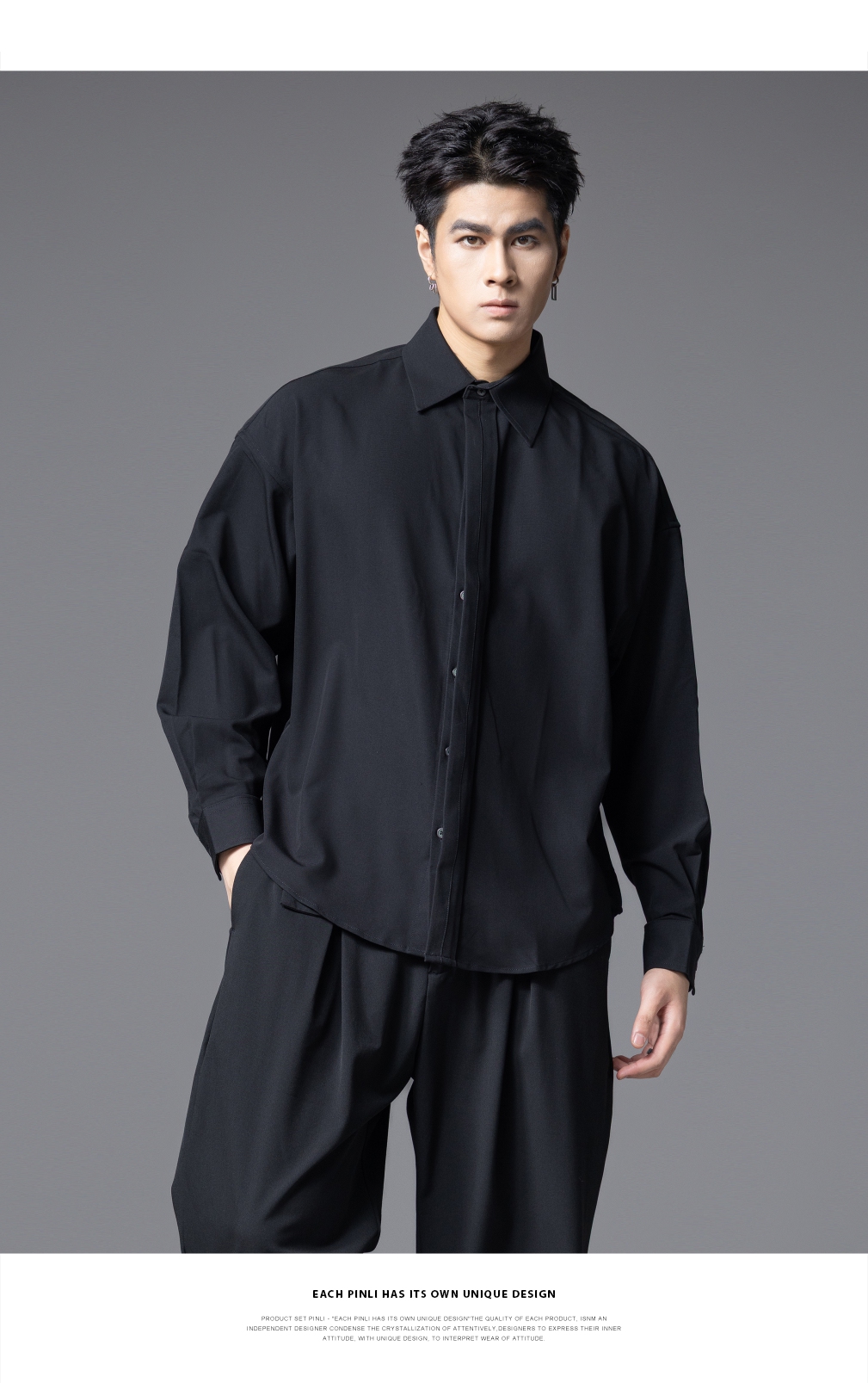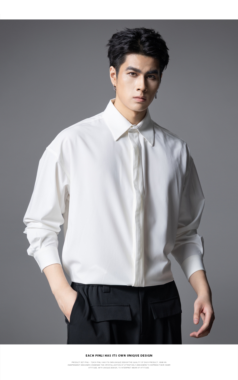 PINLI品立2025秋季新款男士宽松尖领纯色打底长袖衬衫休闲衬衣潮GD253113066