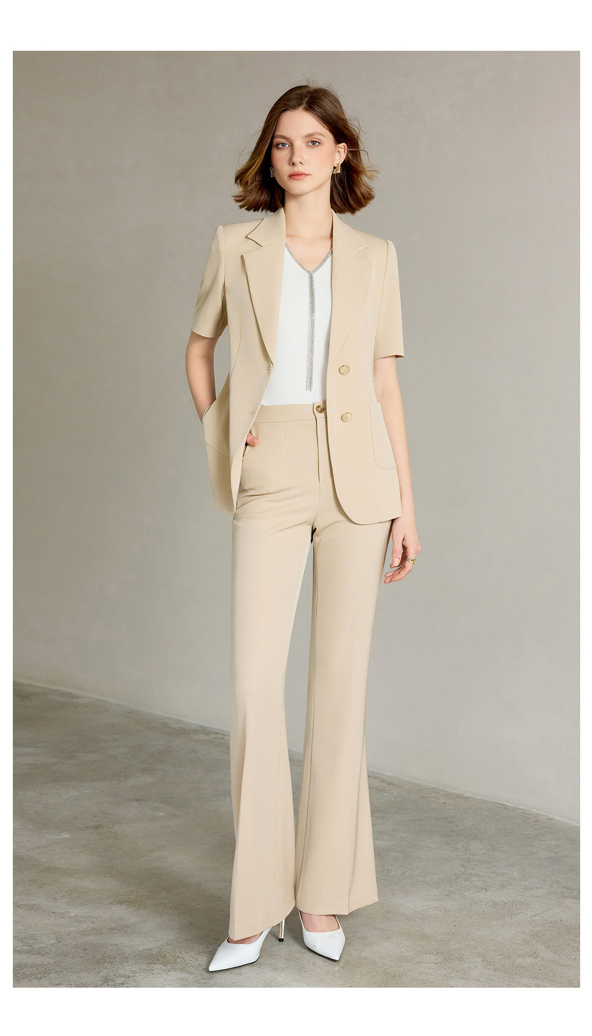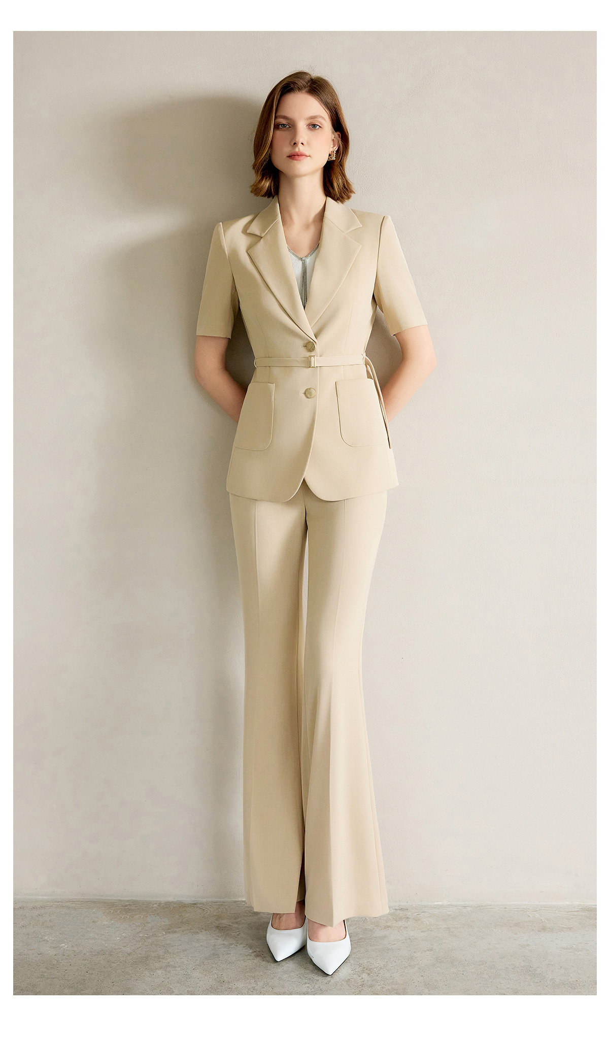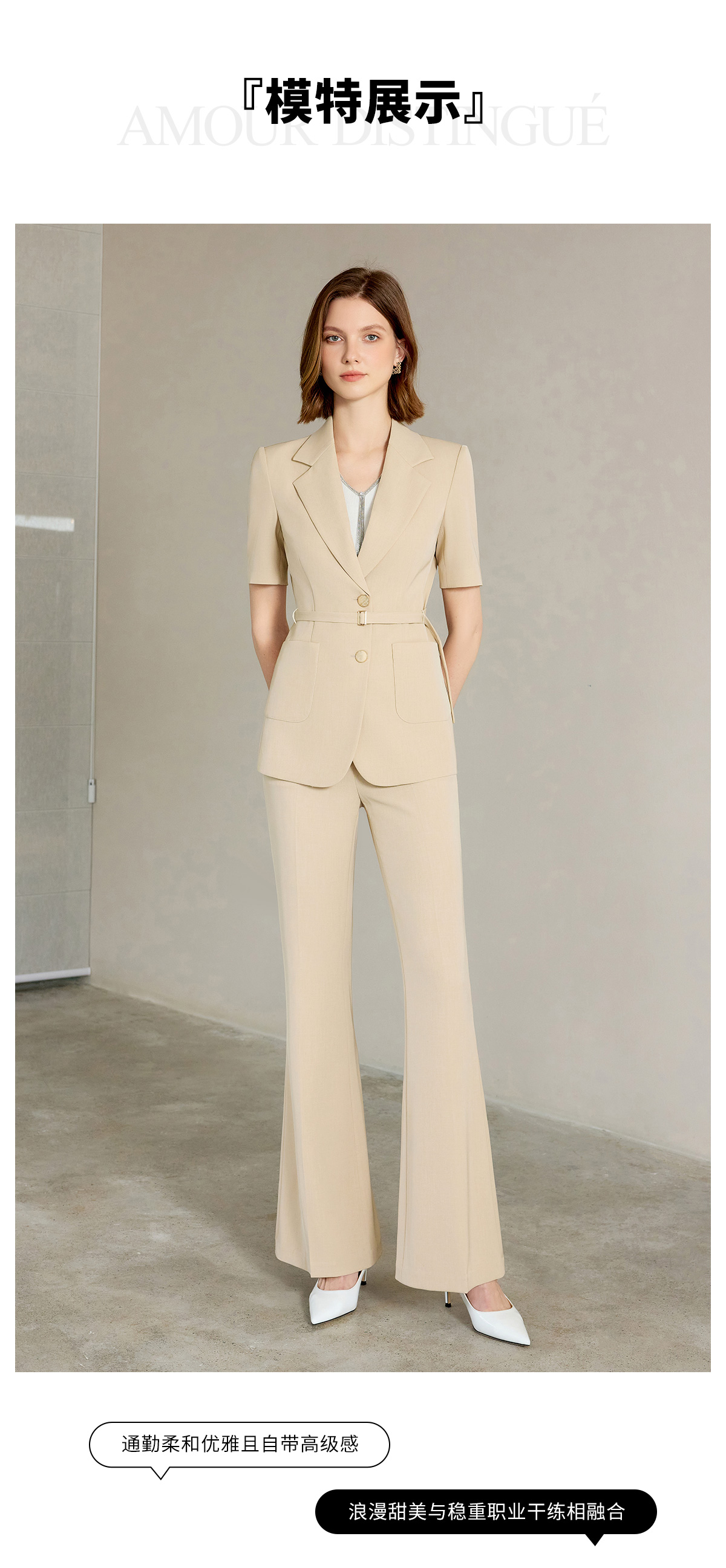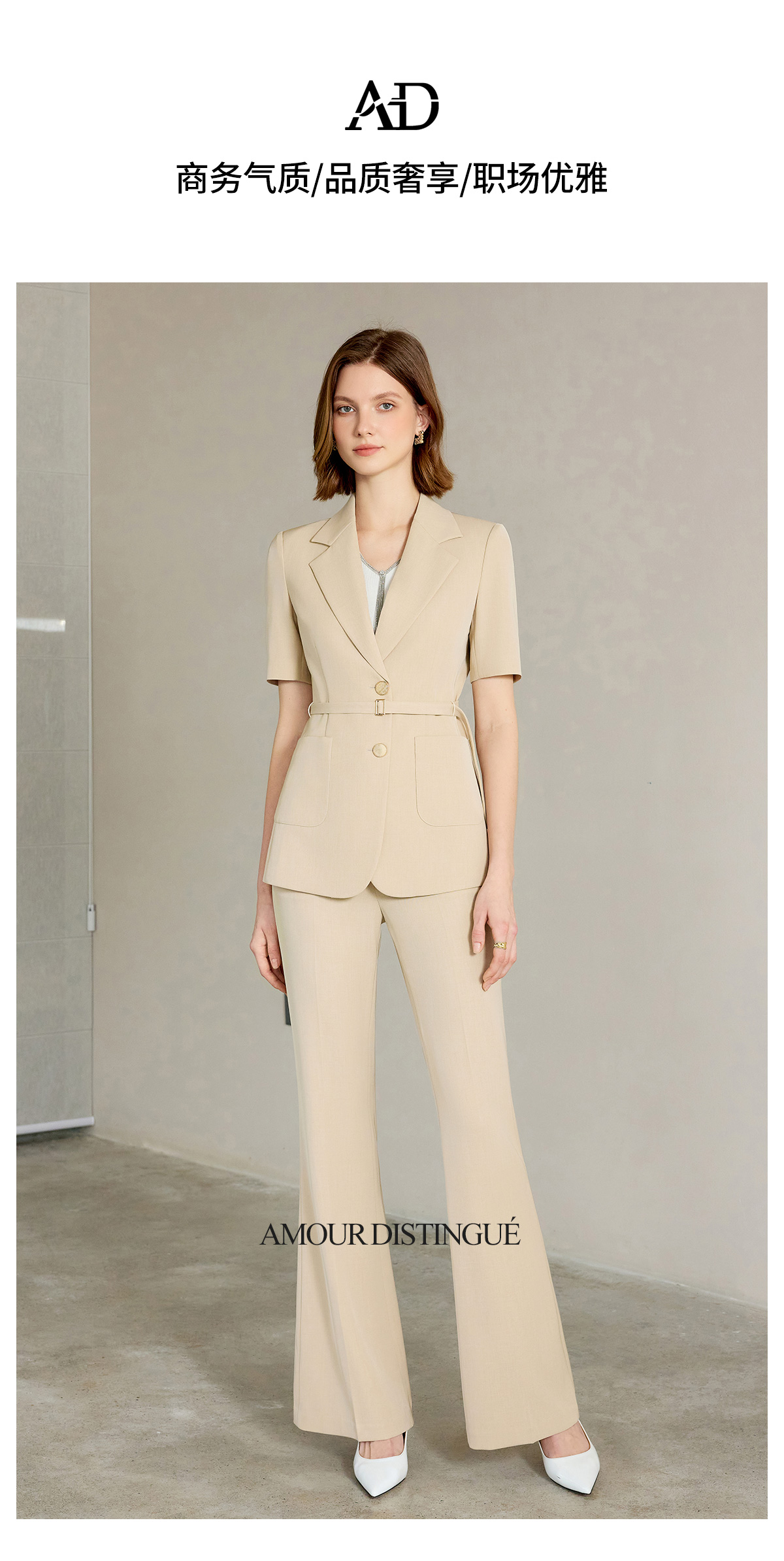 AD女士西装外套2025新款浅卡其色垂感西服套装高腰显瘦喇叭西裤夏