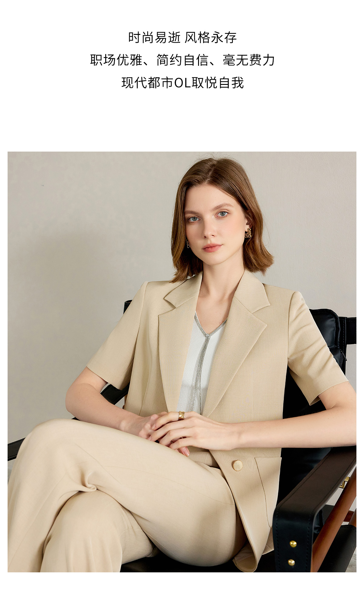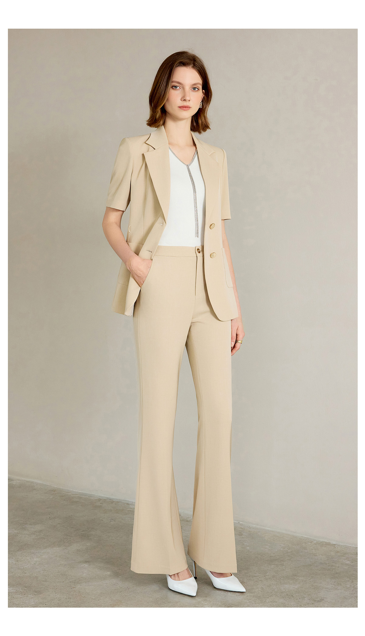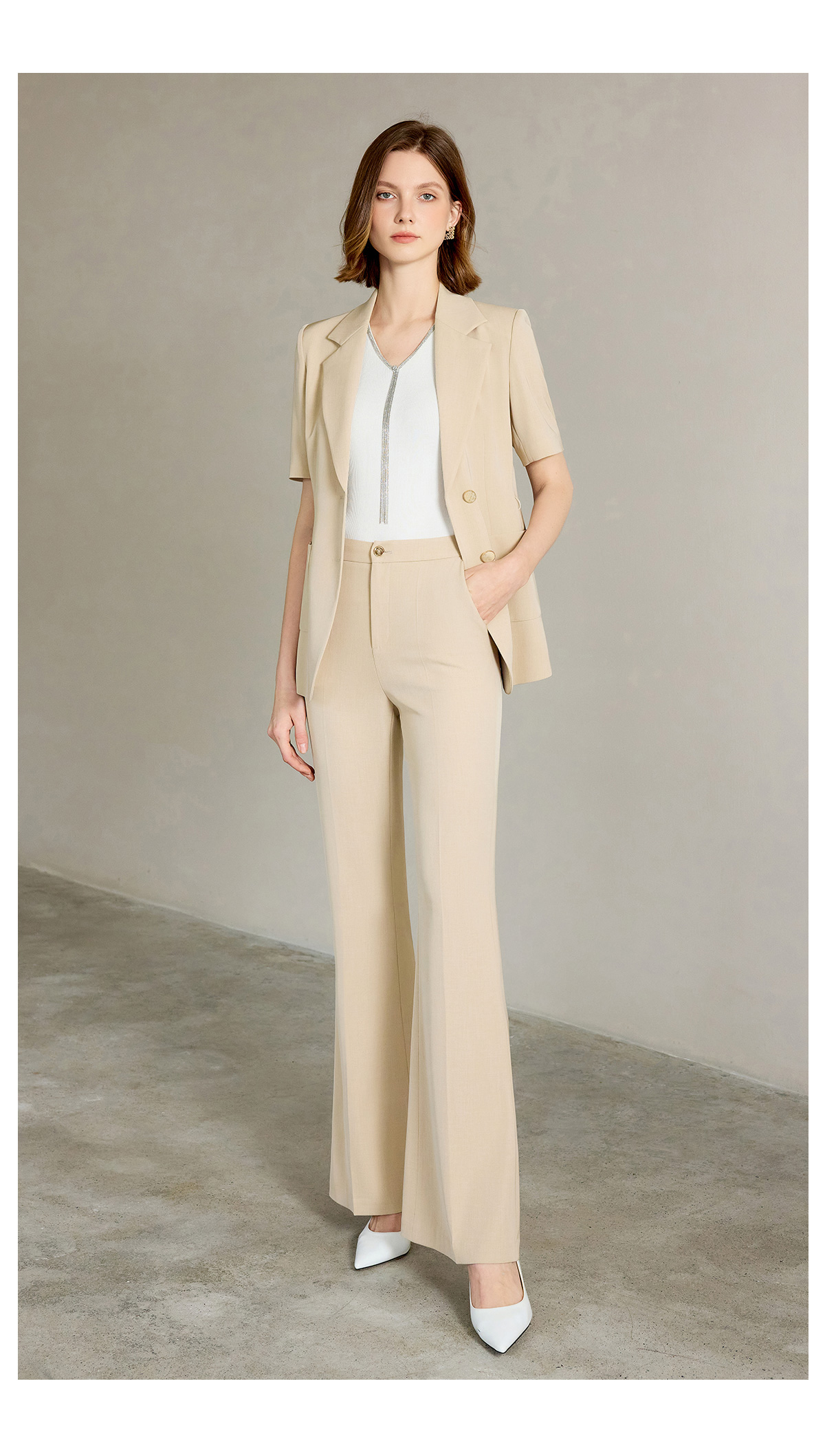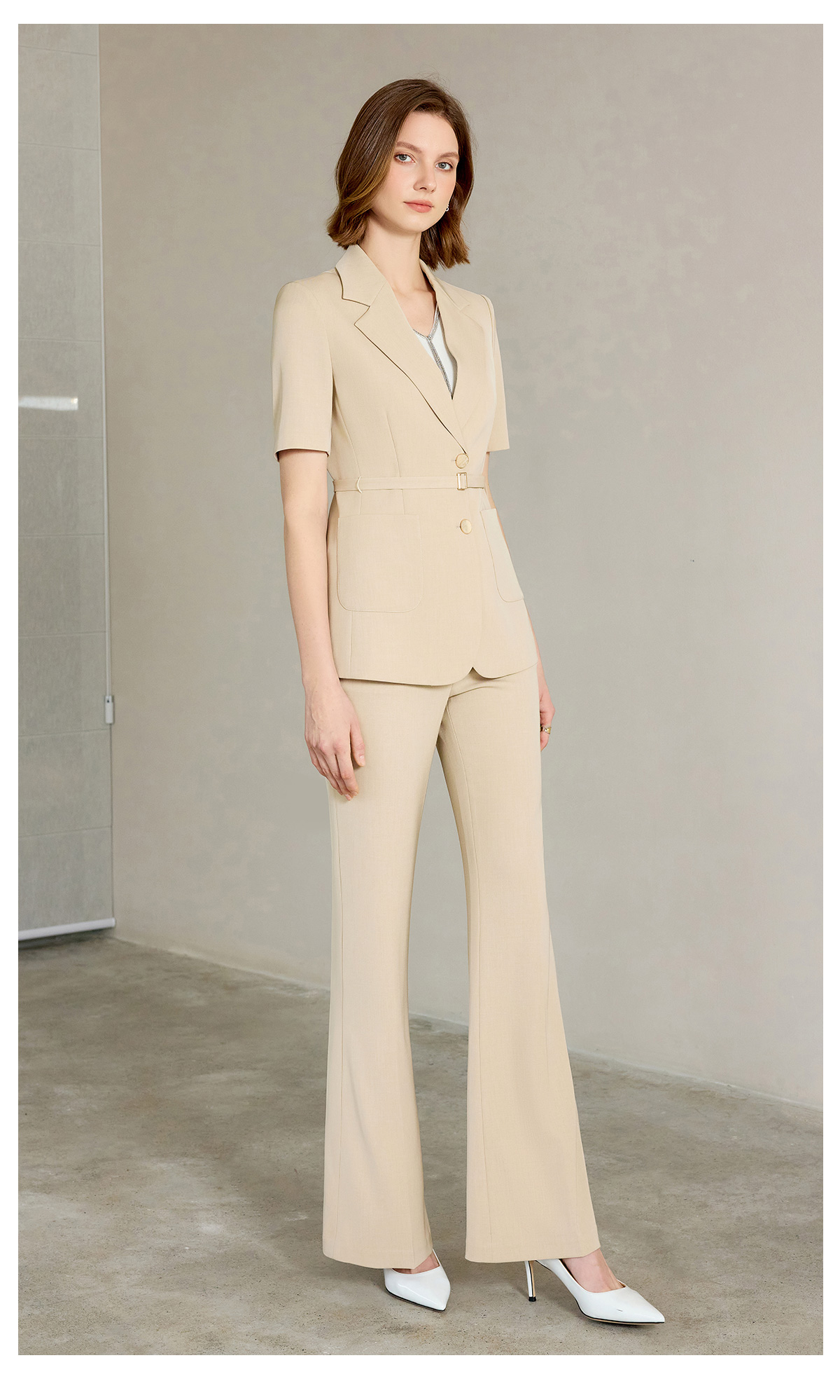 AD女士西装外套2025新款浅卡其色垂感西服套装高腰显瘦喇叭西裤夏