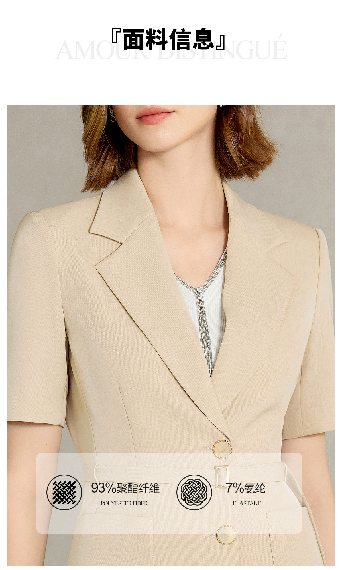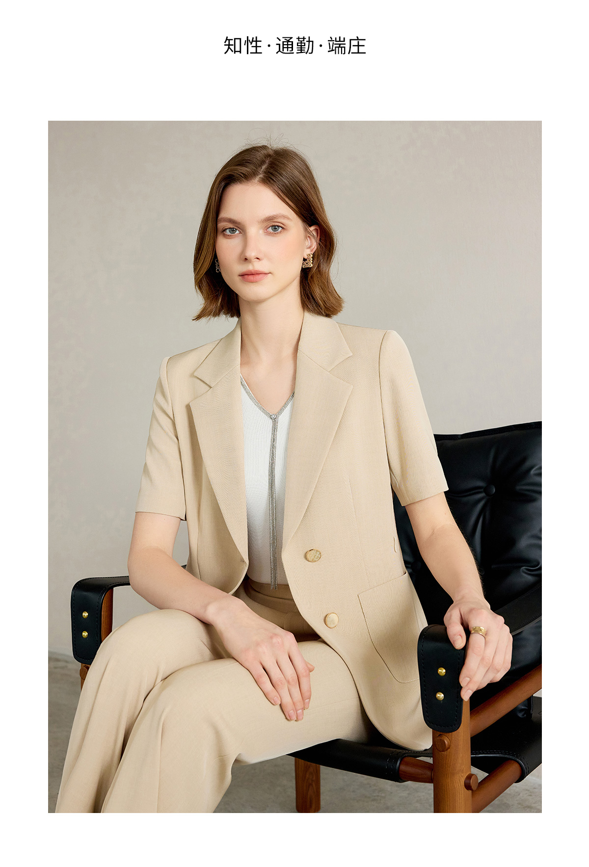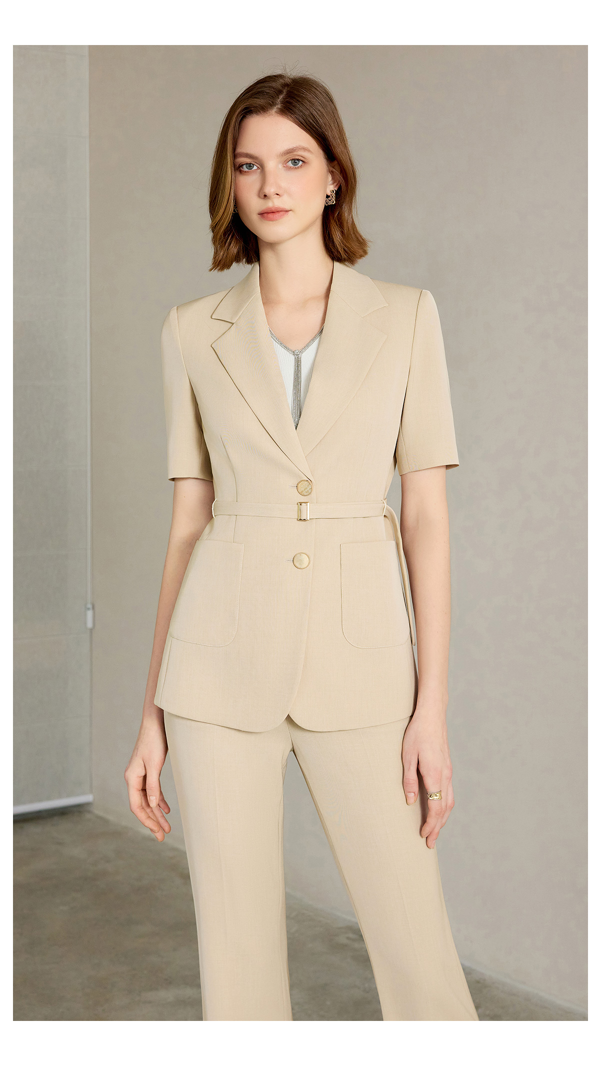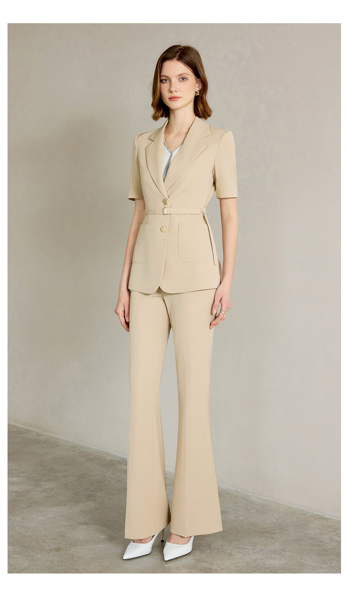 AD女士西装外套2025新款浅卡其色垂感西服套装高腰显瘦喇叭西裤夏