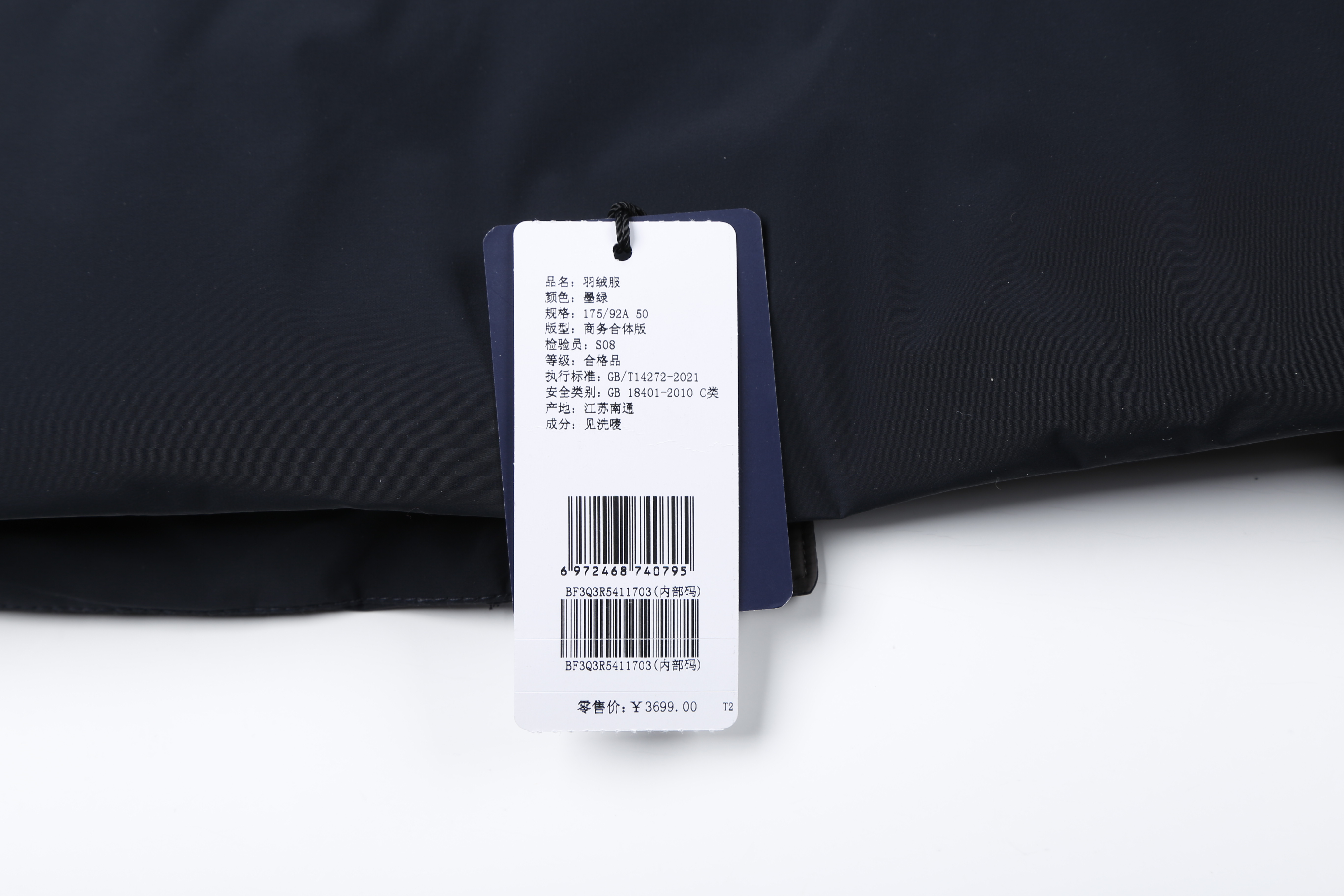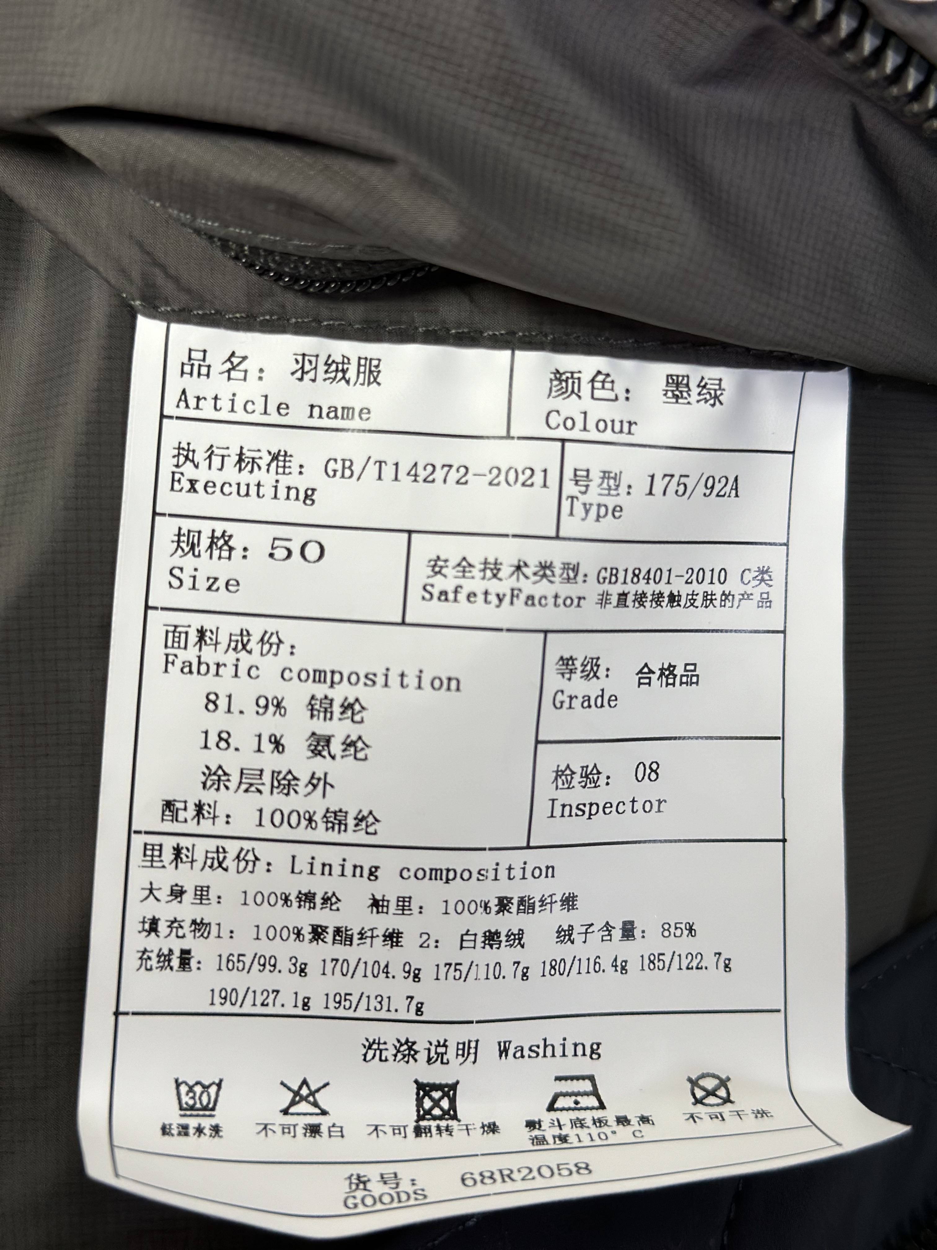 面料成分:81.9%锦纶18.1%氨纶涂层除外配料:100%锦纶 里料成分:大身里:100%锦纶 袖里:100%聚酯纤维 填充物1:100%聚酯纤维 2:白鹅绒 绒子含量:85% 充绒量:170/104.9g; 175/110.7g; 180/116.4g; 185/122.7g; 190/127.1g
