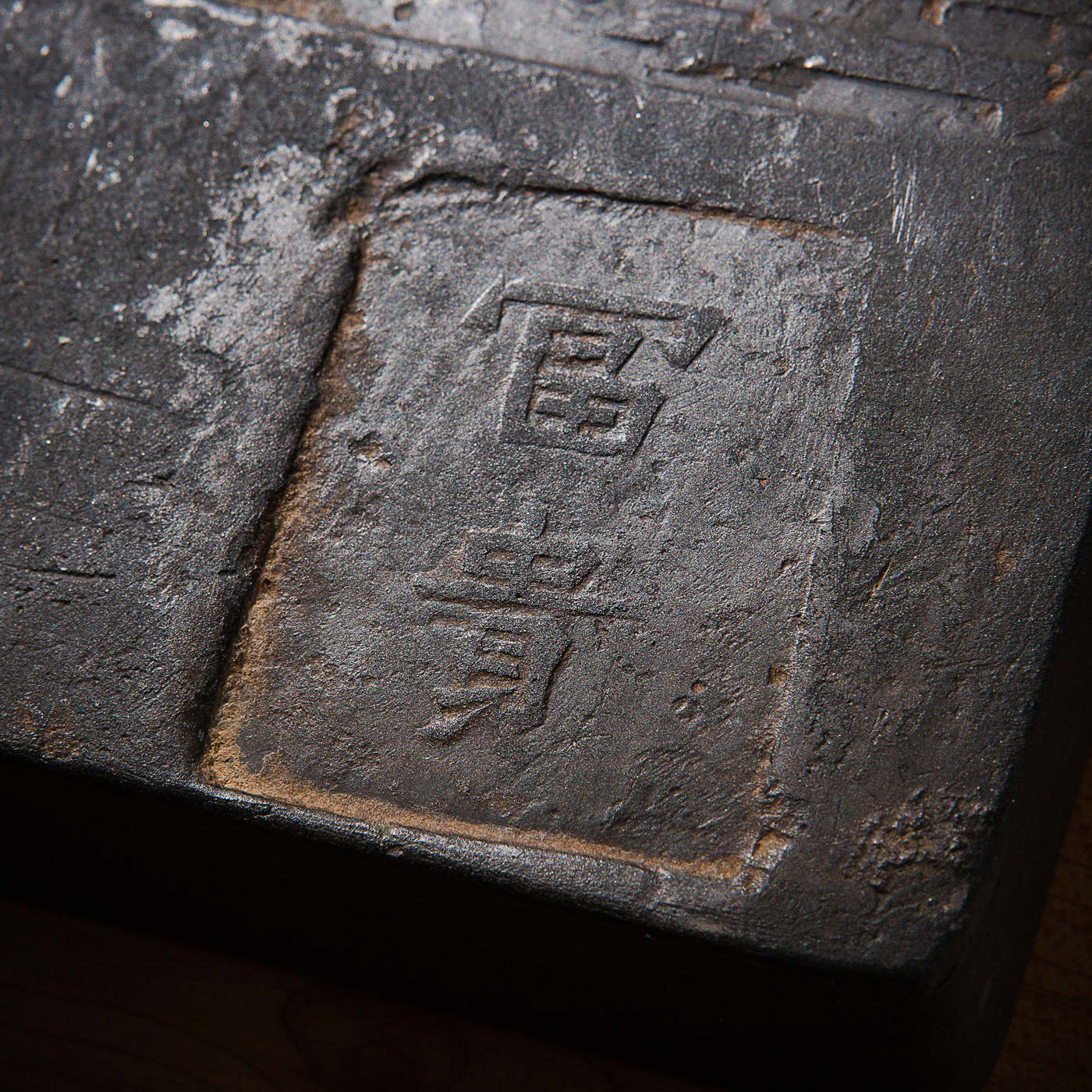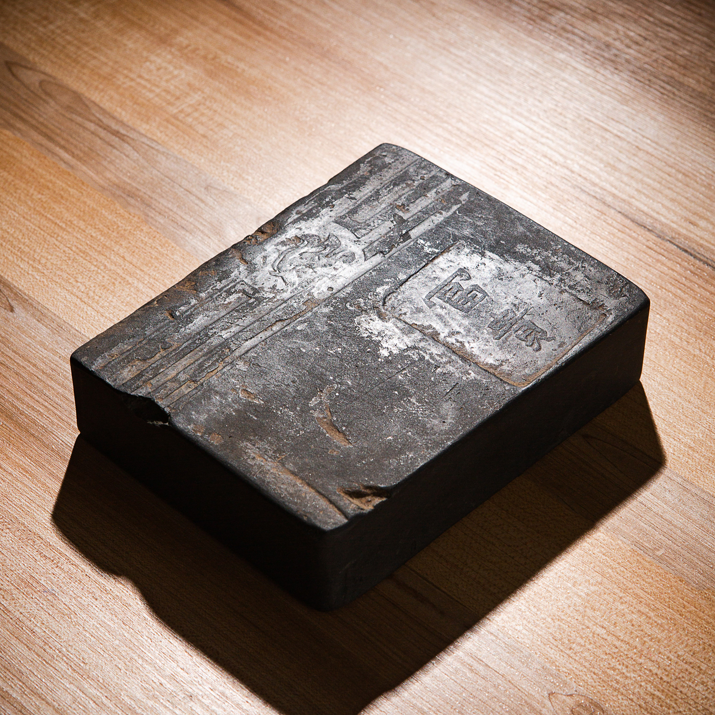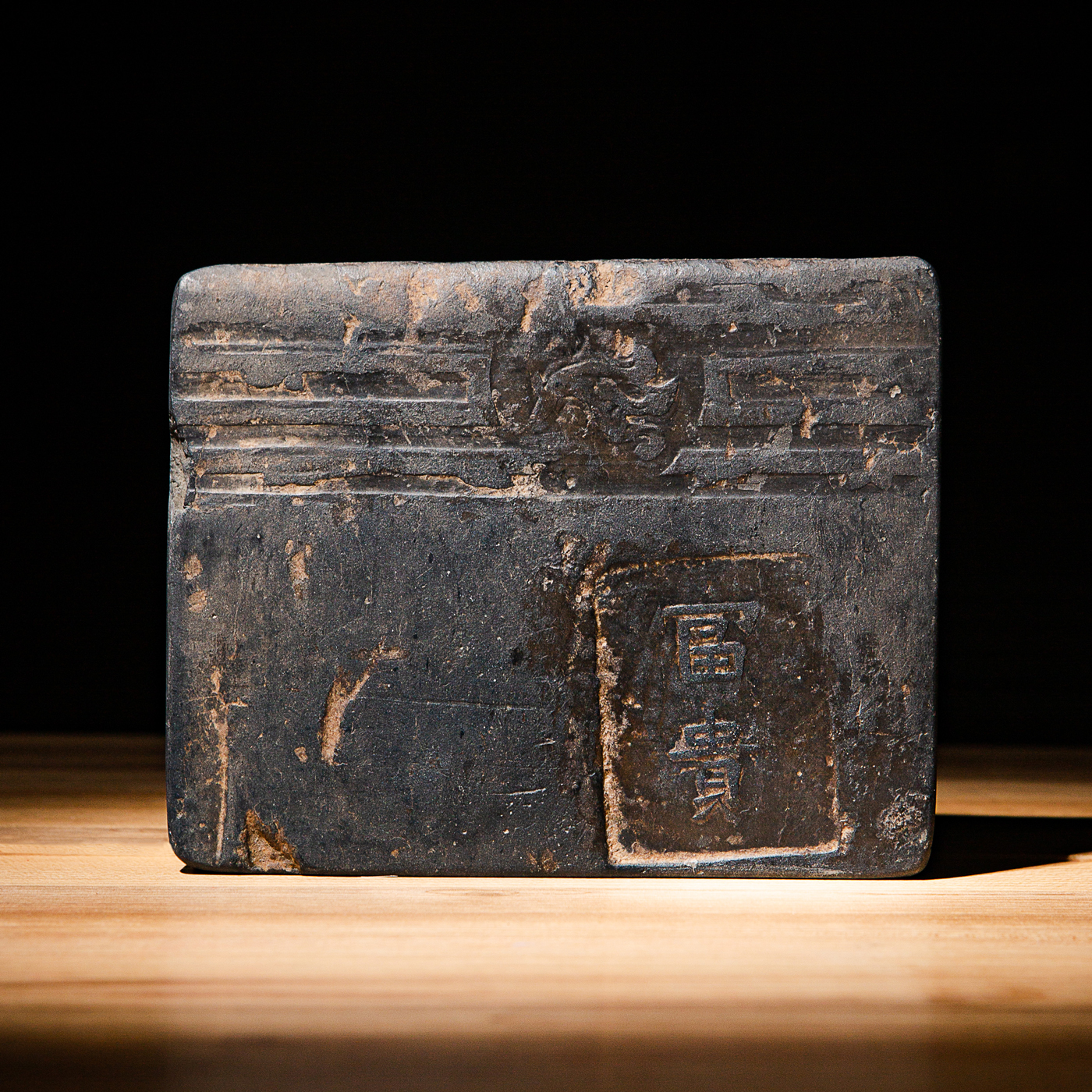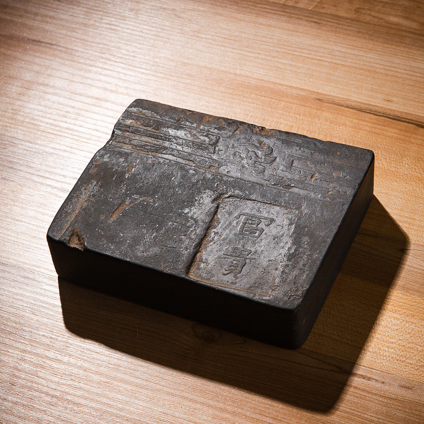 北齐“富贵”古砖制砚。砖为稀有大名品,存世稀有难寻,其铭文俊美古朴,皮壳老辣。采用镶嵌工艺制砚,工艺复杂,所镶嵌歙石质地细嫩,形状文雅,下发墨极佳。