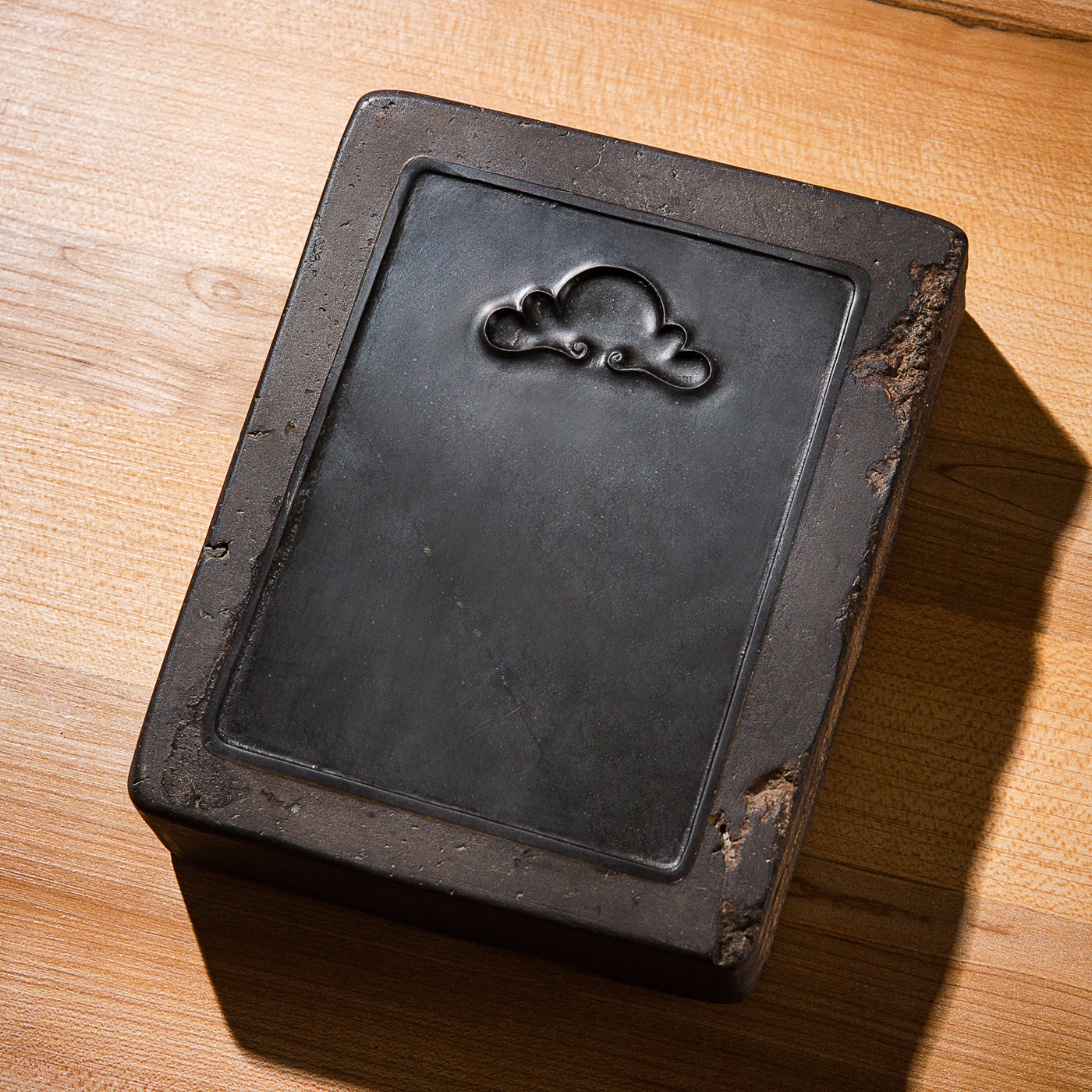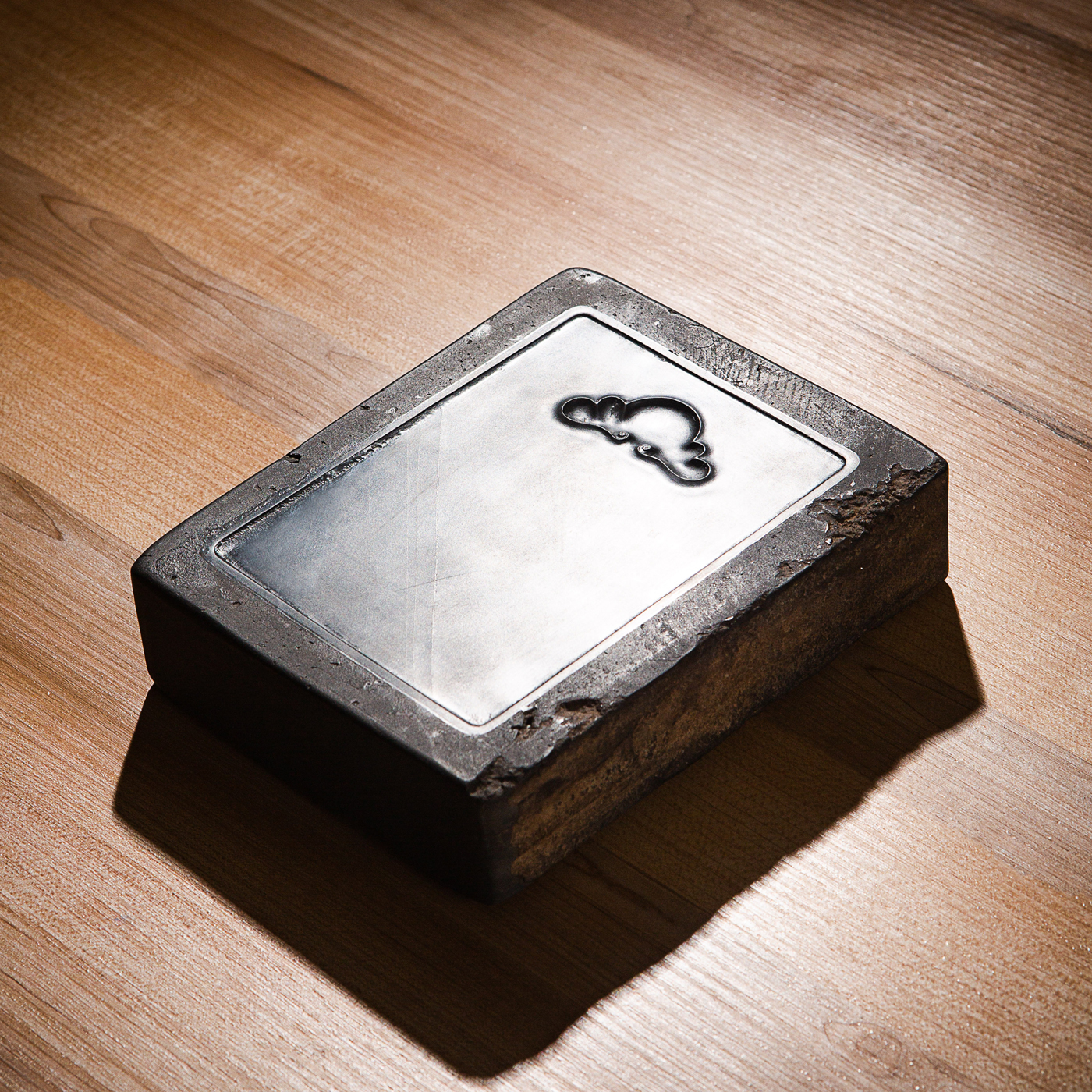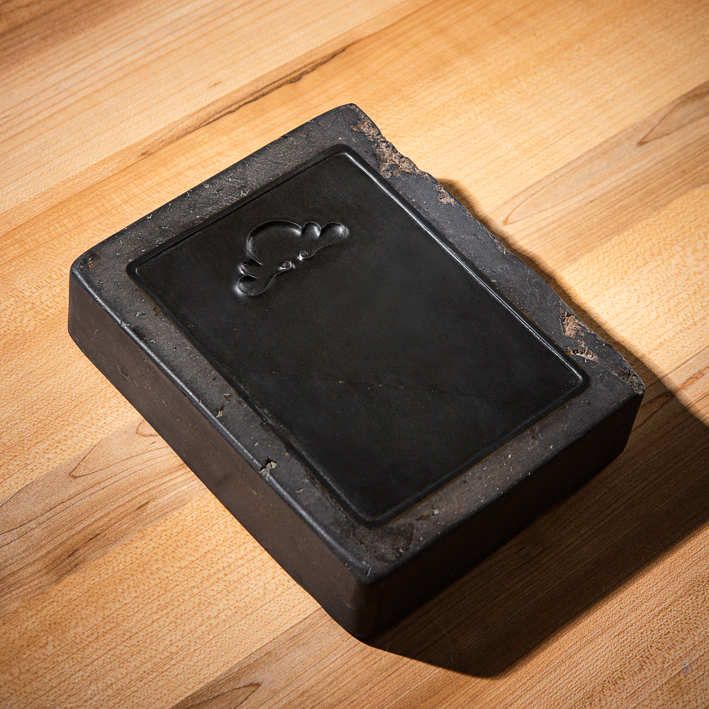北齐“富贵”古砖制砚。砖为稀有大名品,存世稀有难寻,其铭文俊美古朴,皮壳老辣。采用镶嵌工艺制砚,工艺复杂,所镶嵌歙石质地细嫩,形状文雅,下发墨极佳。