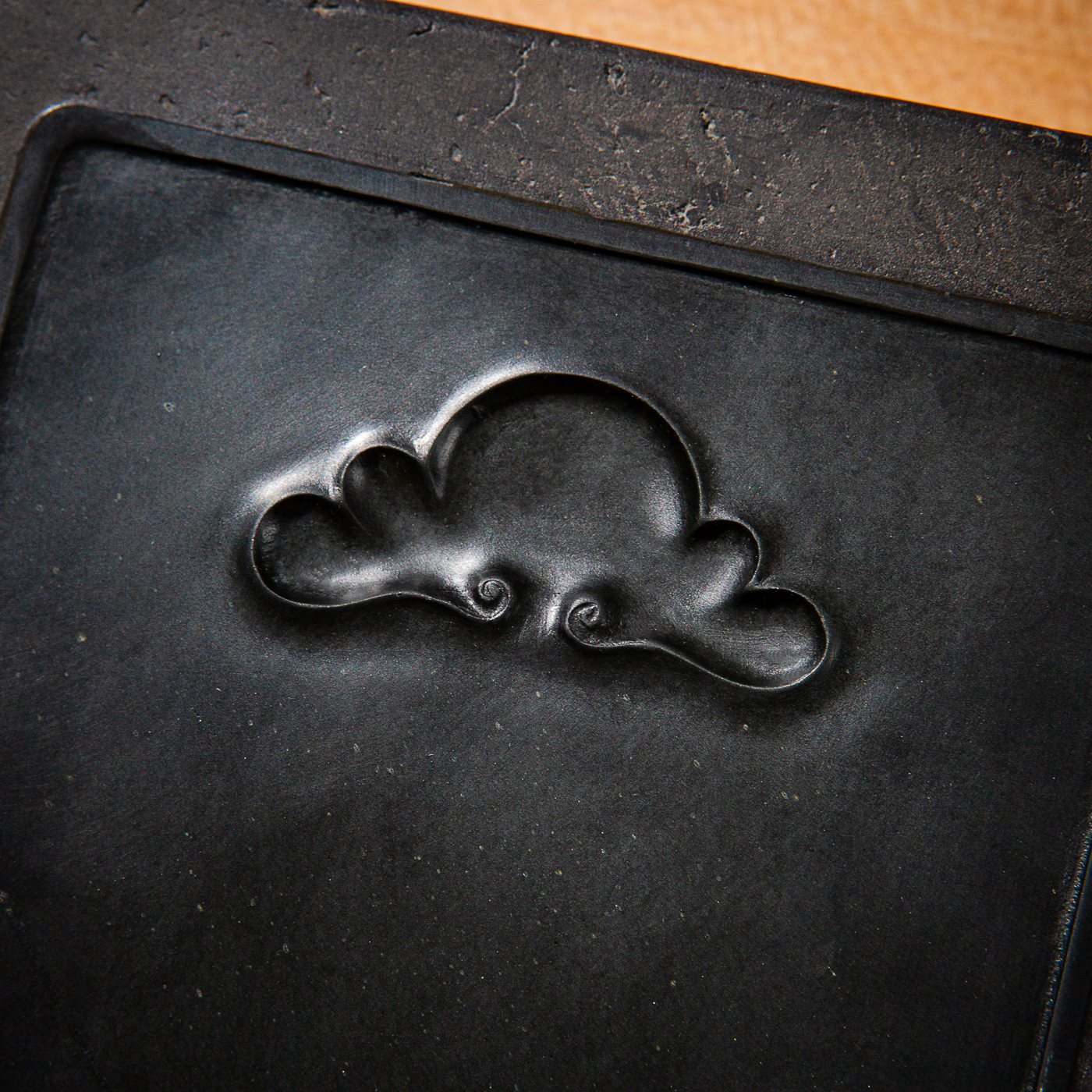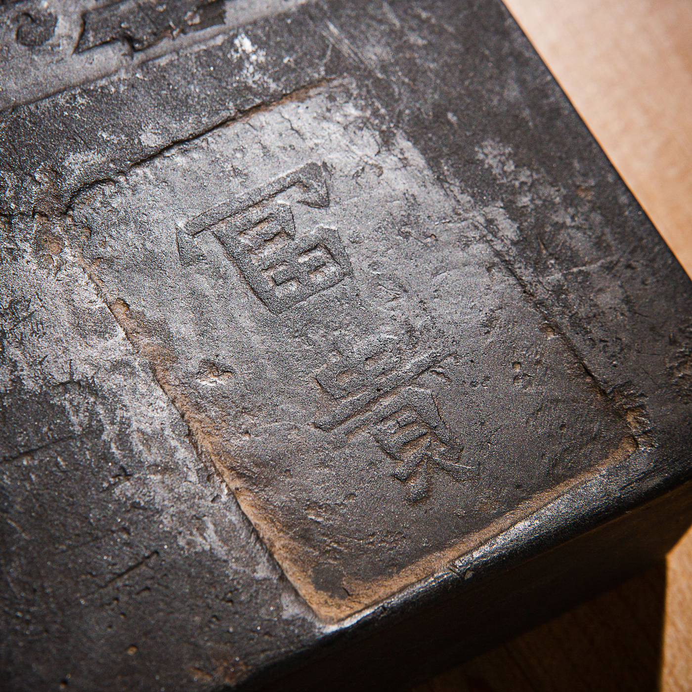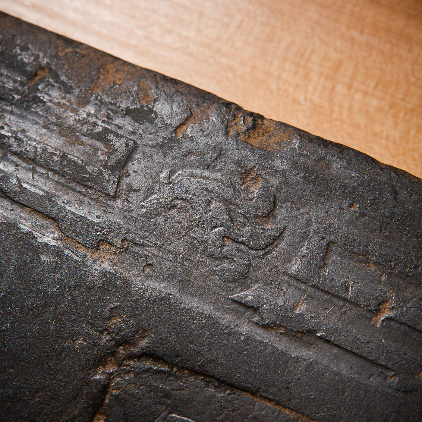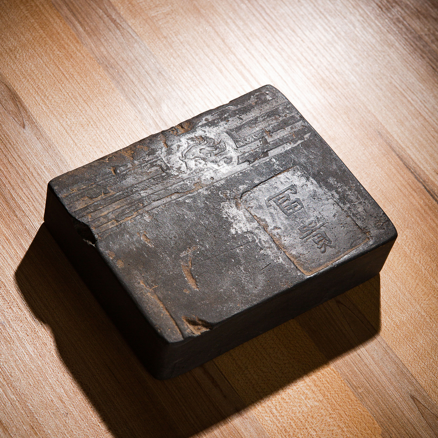 北齐“富贵”古砖制砚。砖为稀有大名品,存世稀有难寻,其铭文俊美古朴,皮壳老辣。采用镶嵌工艺制砚,工艺复杂,所镶嵌歙石质地细嫩,形状文雅,下发墨极佳。