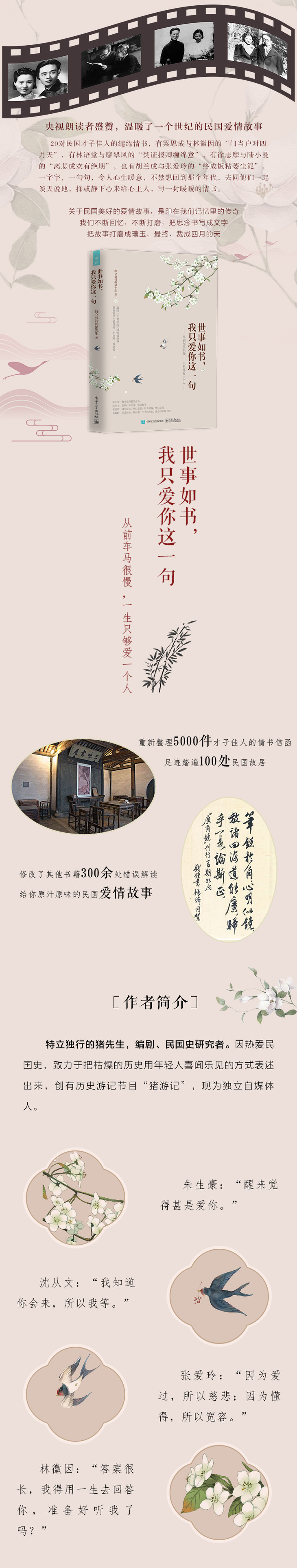 内容简介:朱生豪:“醒来觉得甚是爱你。” 张爱玲:“因为爱过,所以慈悲;因为懂得,所以宽容。” 林徽因:“答案很长,我得用一生去回答你,准备好听我了吗?” 钱钟书:“我见到她之前,从未想到要结婚;我娶了她十几年,从未后悔娶她;也从未想过要娶别的女人。” 沈从文说:“我走过许多地方的路,行过许多地方的桥,看过许多次数的云,喝过许多种类的酒,却只爱过一个正当最好年龄的人。” 央视朗读者盛赞,温暖了一个世纪的民国爱情故事。20对民国才子佳人的缱绻情书,有梁思成与林徽因的“门当户对四月天”,有林语堂与廖翠凤的“焚证报卿缠绵意”,有徐志摩与陆小曼的“离悲成欢有绝期”,也有胡兰成与张爱玲的“终成饭粘萎尘泥”,一字字,一句句,令人心生暖意,不禁想回到那个年代,去同他们一起谈天说地,抑或静下心来给心上人,写一封暖暖的情书。 关于民国美好的爱情故事,是印刻在我们记忆里的传奇,我们不断回忆,不断打磨,把思念书写成文字,把故事打磨成璞玉。最终,裁成四月的天。