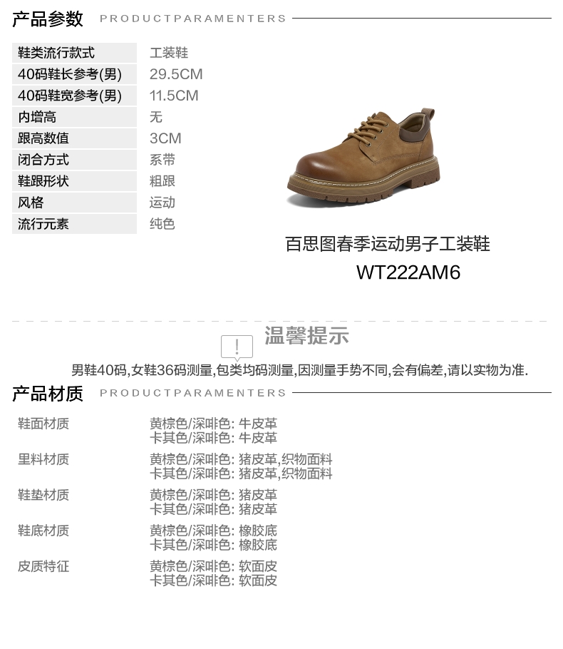 【云粉节】BF楼百思图26春季新款休闲户外工装鞋时尚厚底增高男鞋WT222AM6吊牌价959,现价480