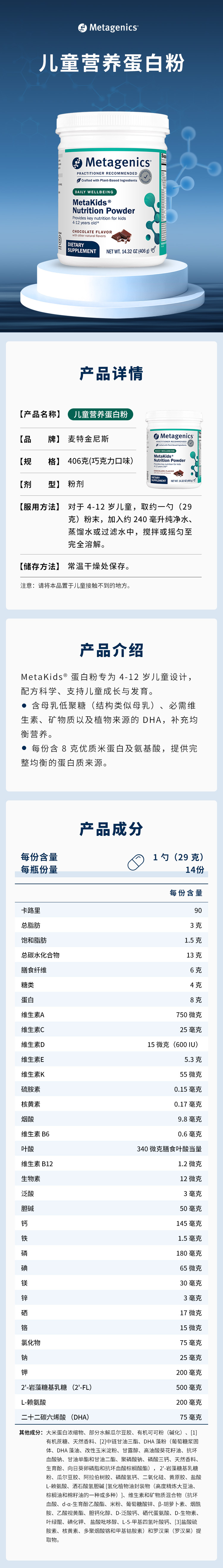 【保税现货】Metagenics儿童营养粉麦特金尼斯植物大米蛋白MetaKids Nutrition