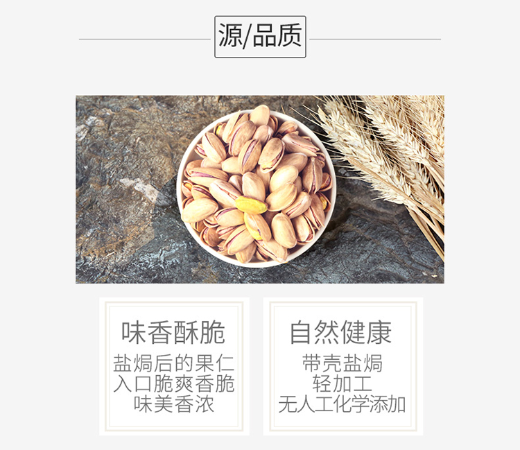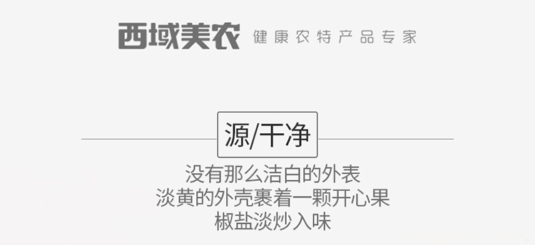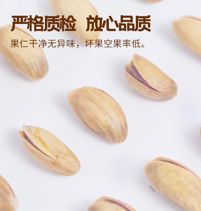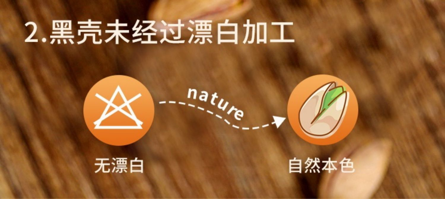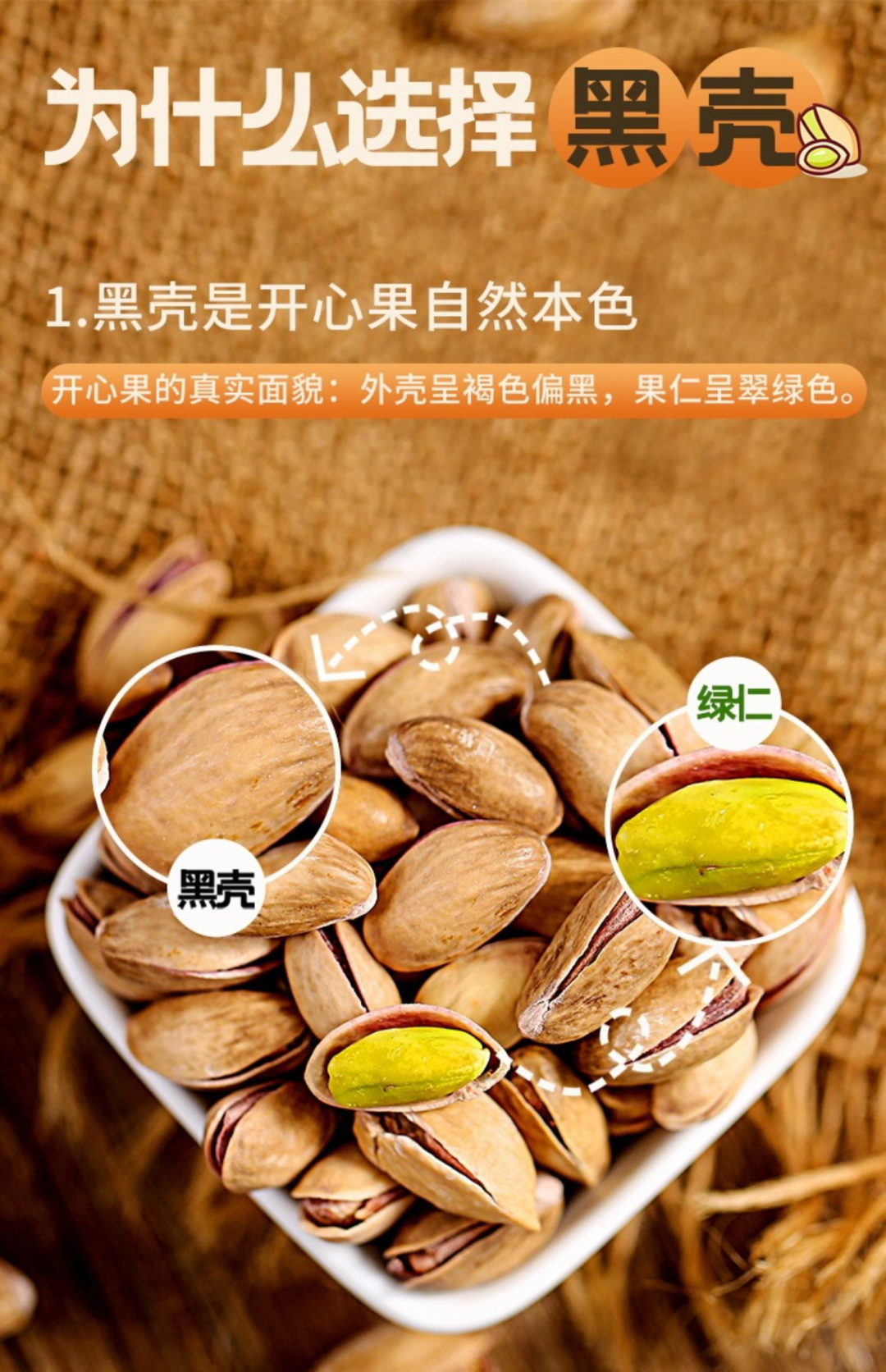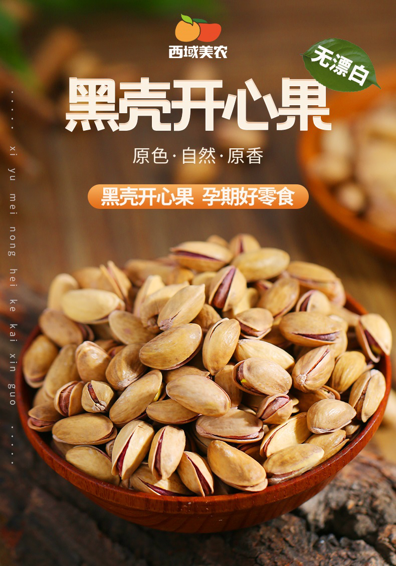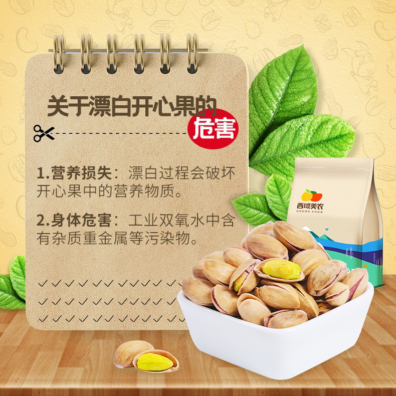 市面上有很多开心果都是白白的,其实是经过了双氧水漂白,看起来美貌,但并不安全哦!而西域美农家的开心果,来自新疆,颗颗都是在果树成熟之后中进行采摘并多次筛选,带壳盐焗,只是加入了盐进行轻加工,不添加其它化学物质,不用双氧水漂白,吃得更安心!