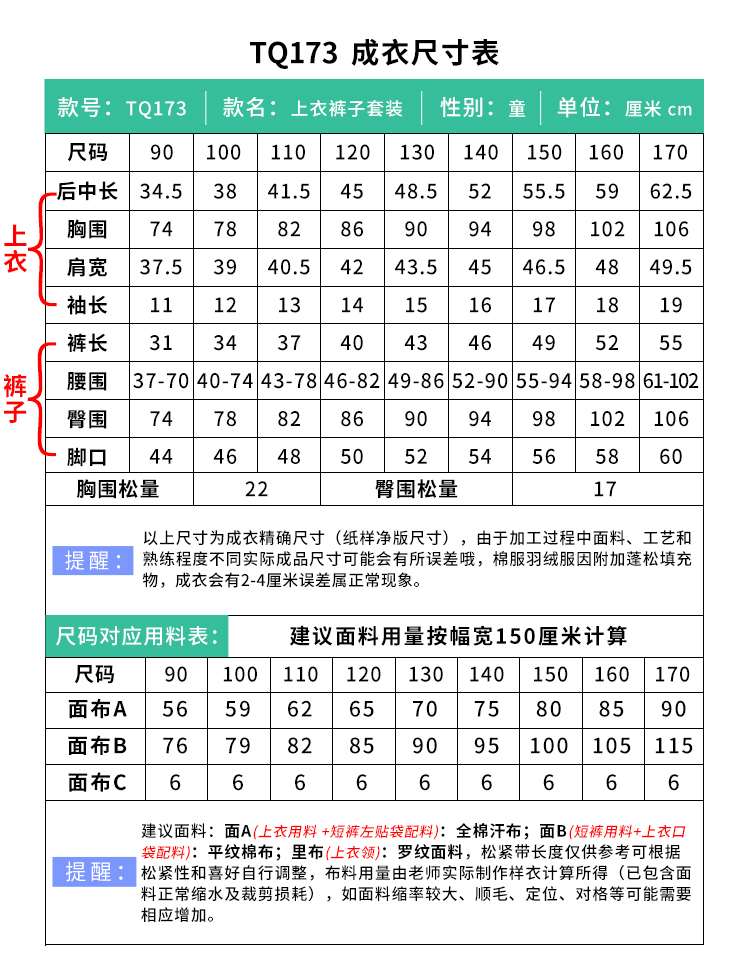 裁缝学苑TQ173圆领T恤松紧腰短裤套装纸样儿童休闲两件套童装样板