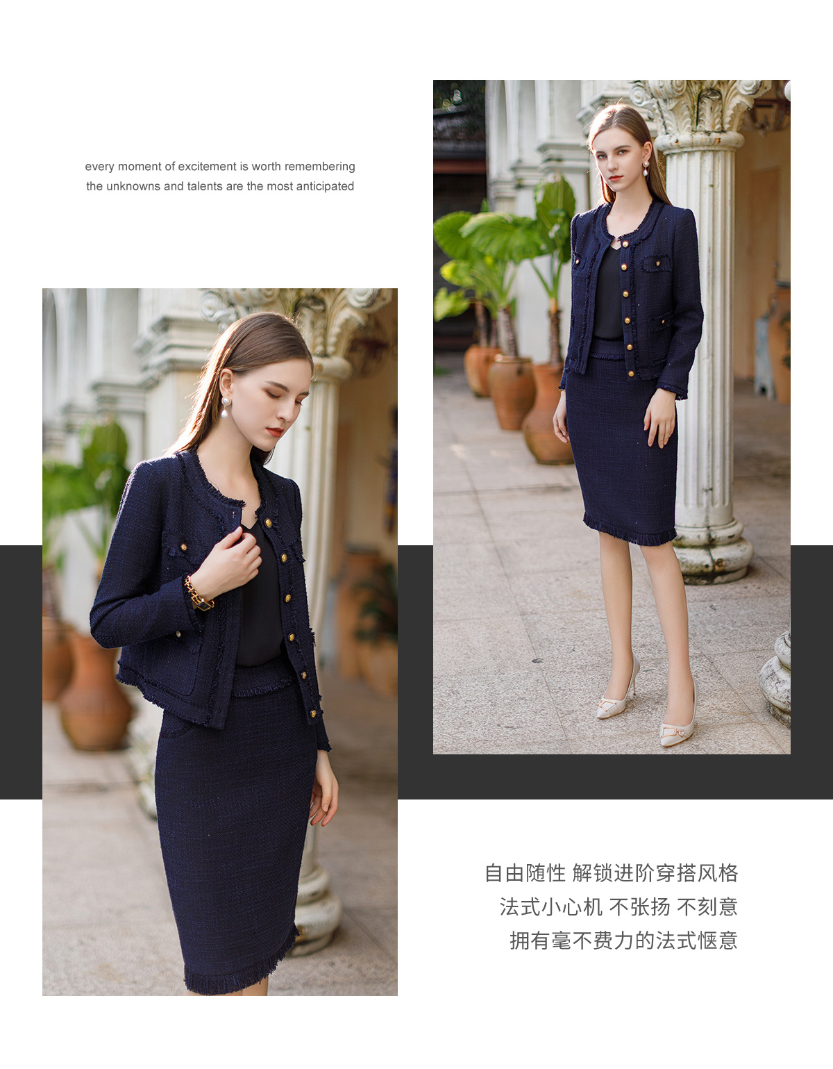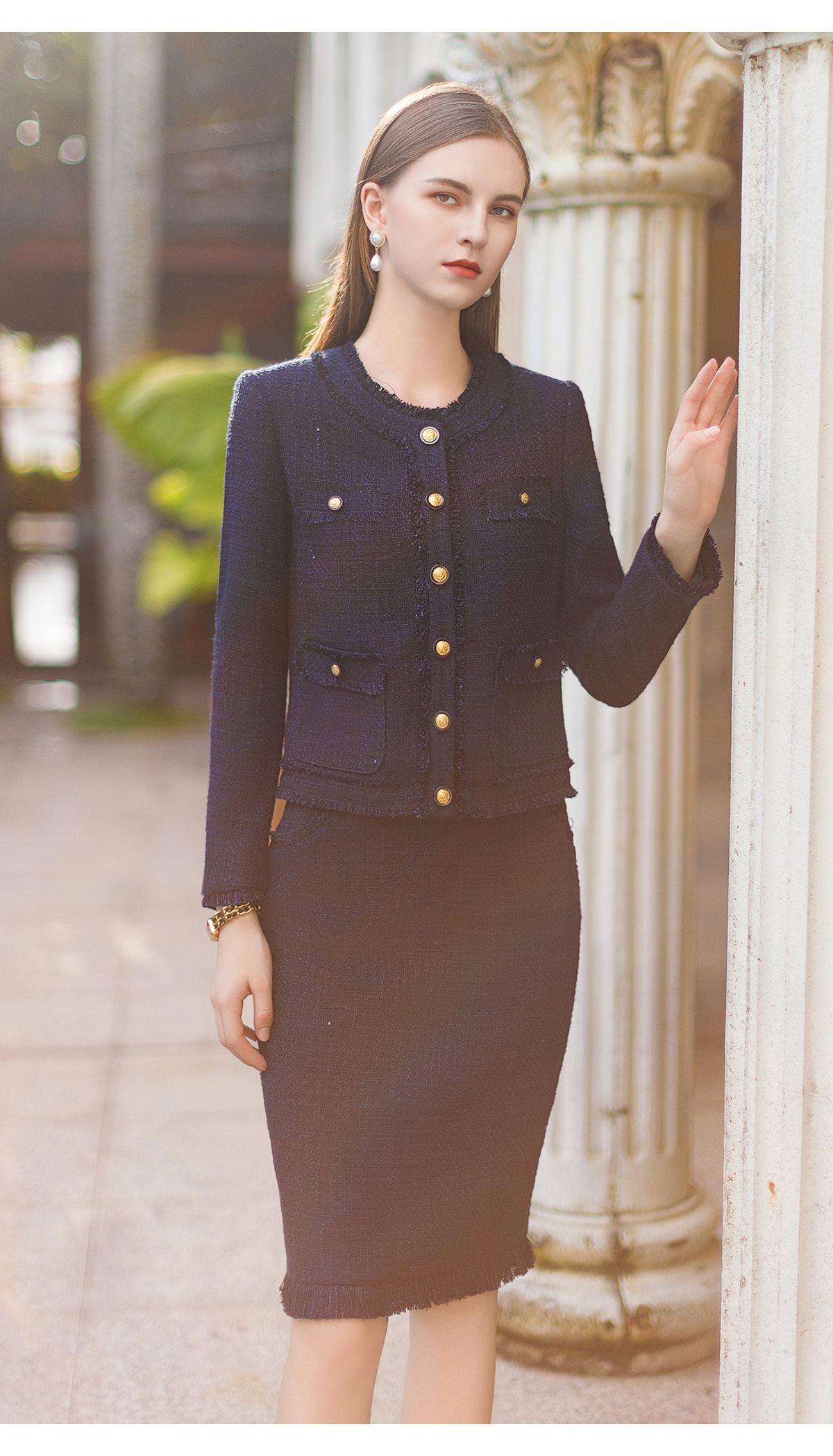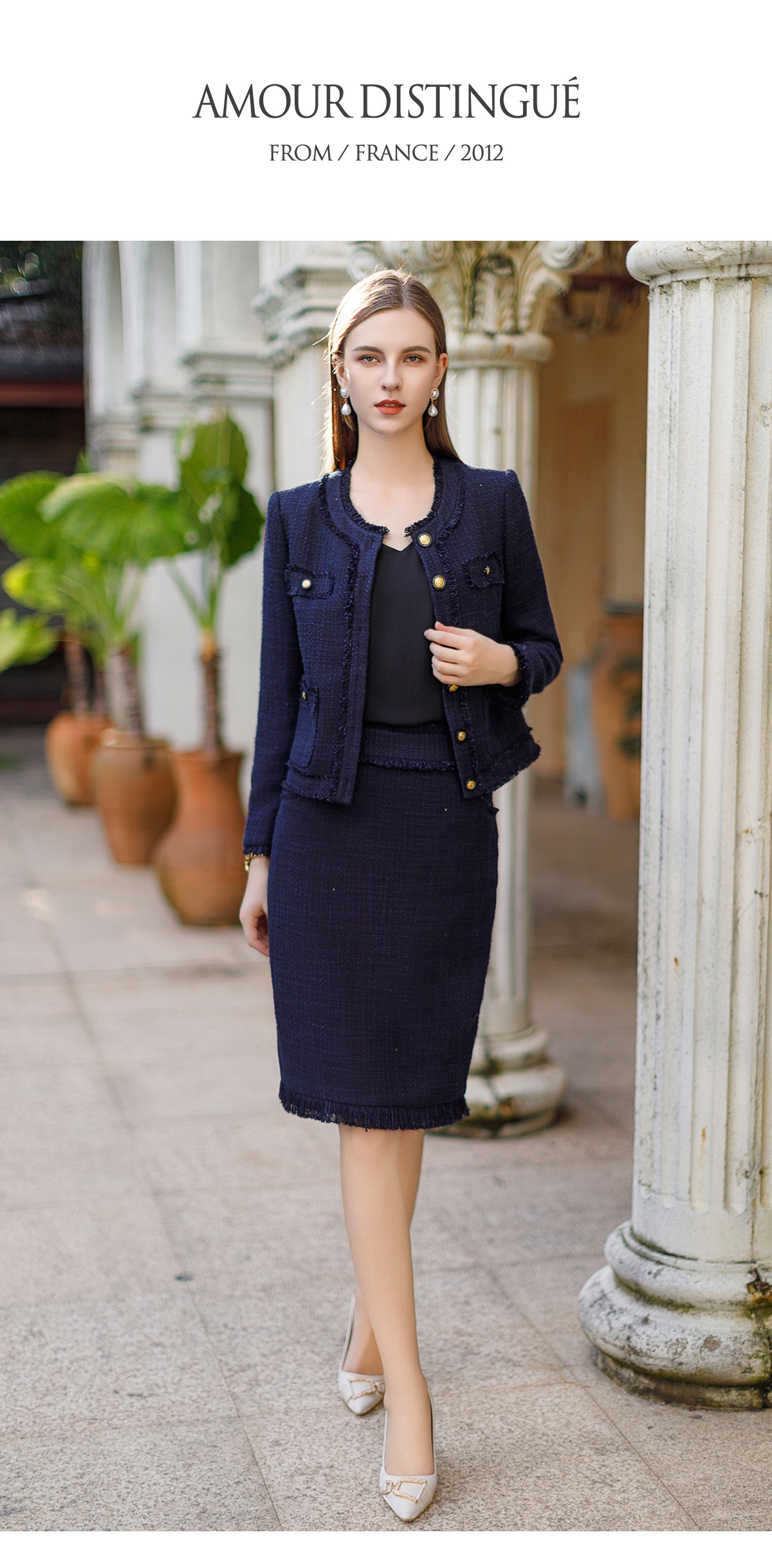 AD小香风职业套装裙女秋冬新款毛边编织开衫短外套藏青色两件套