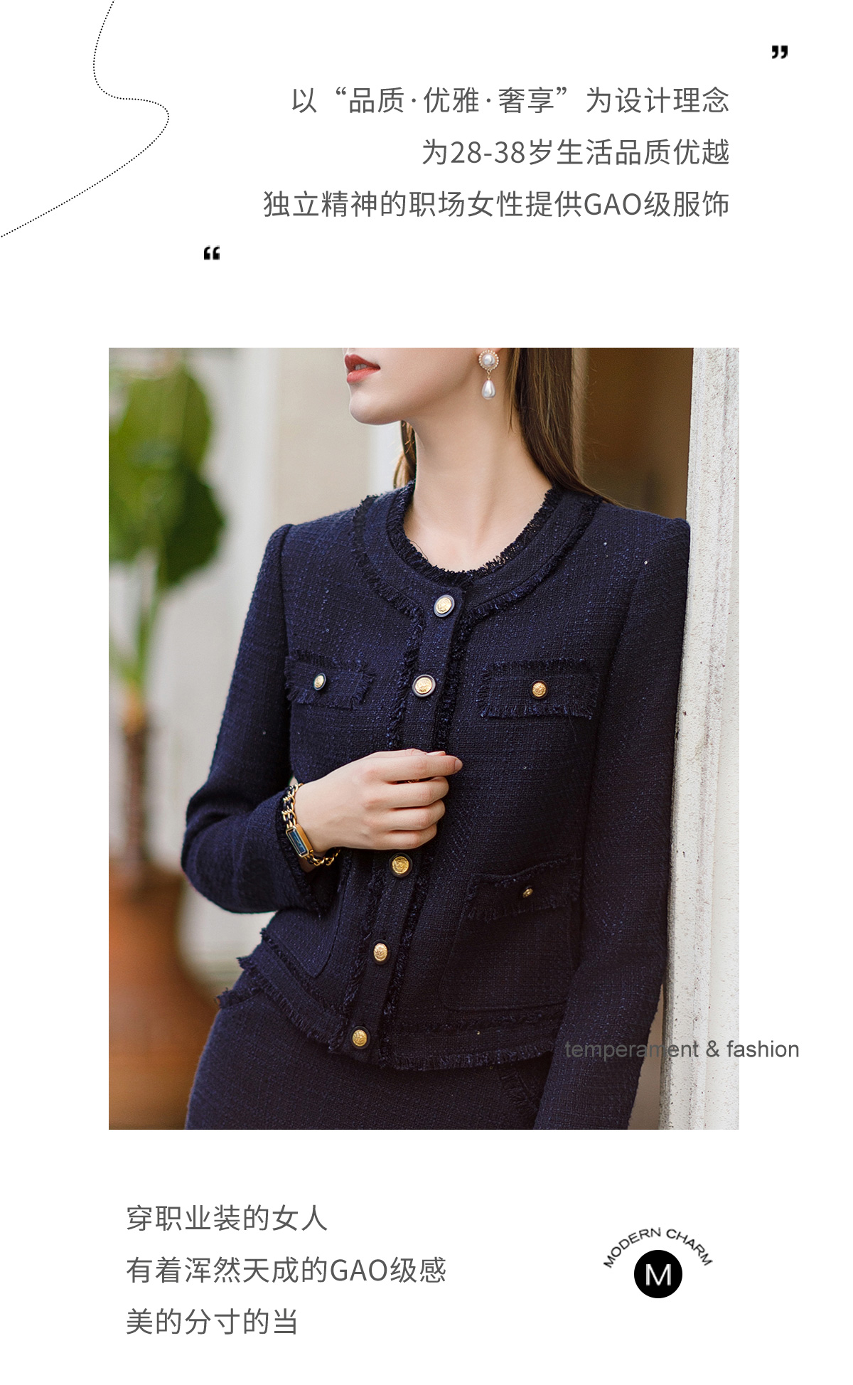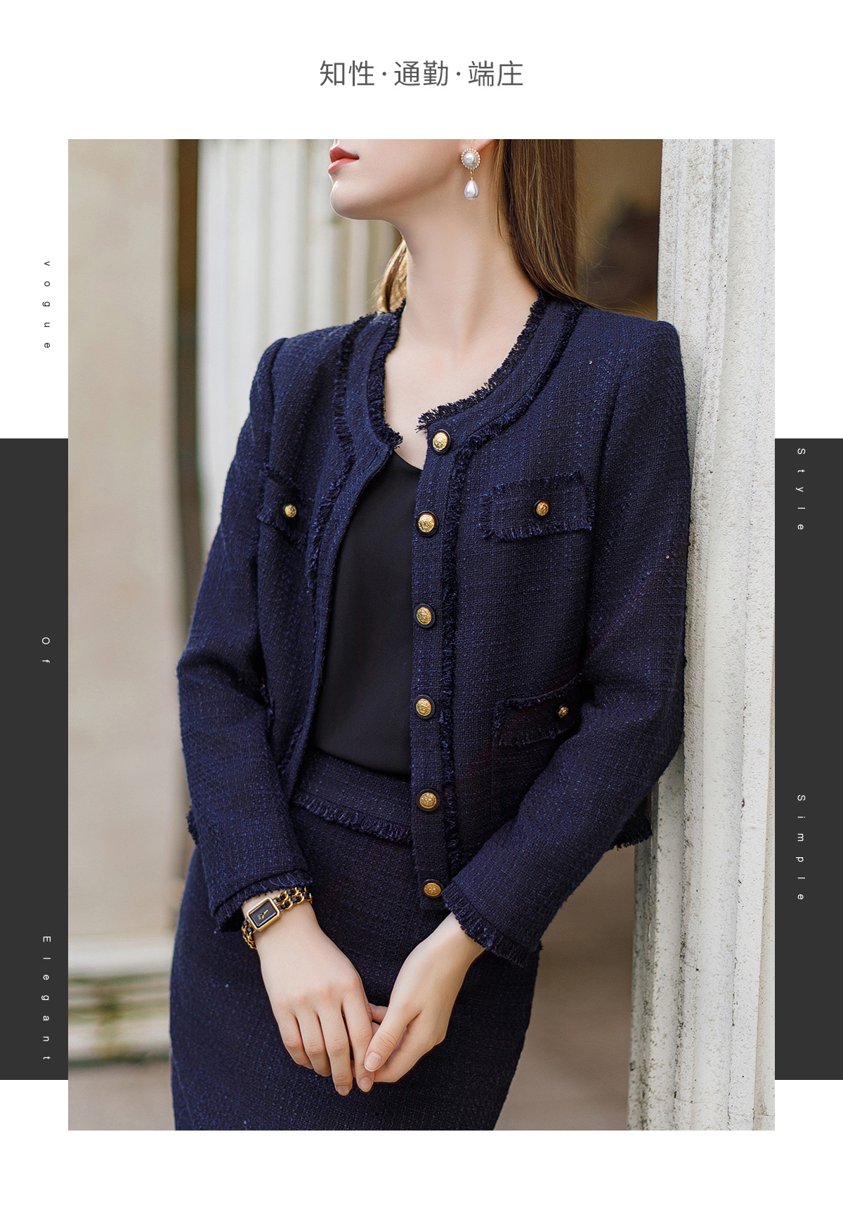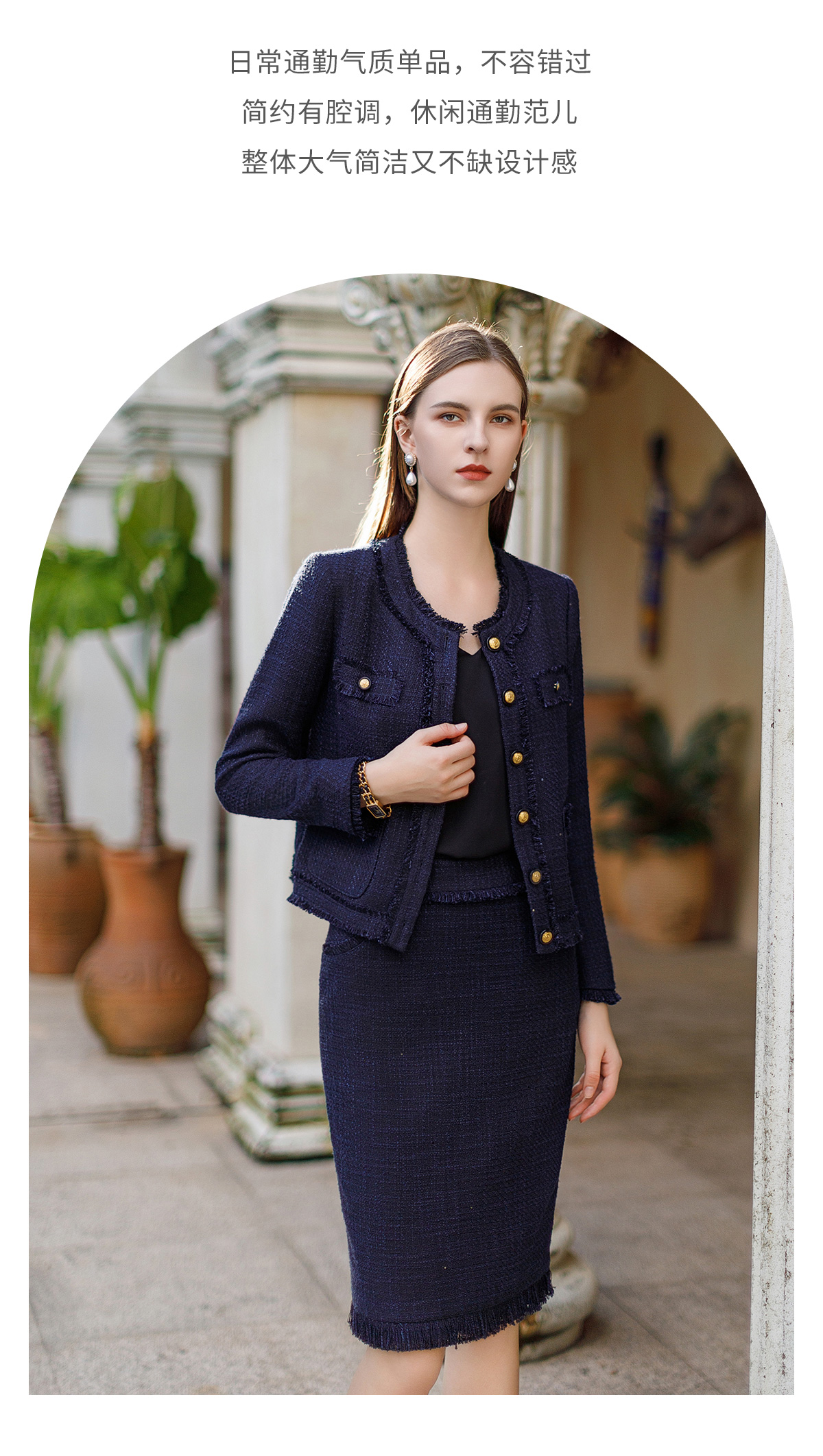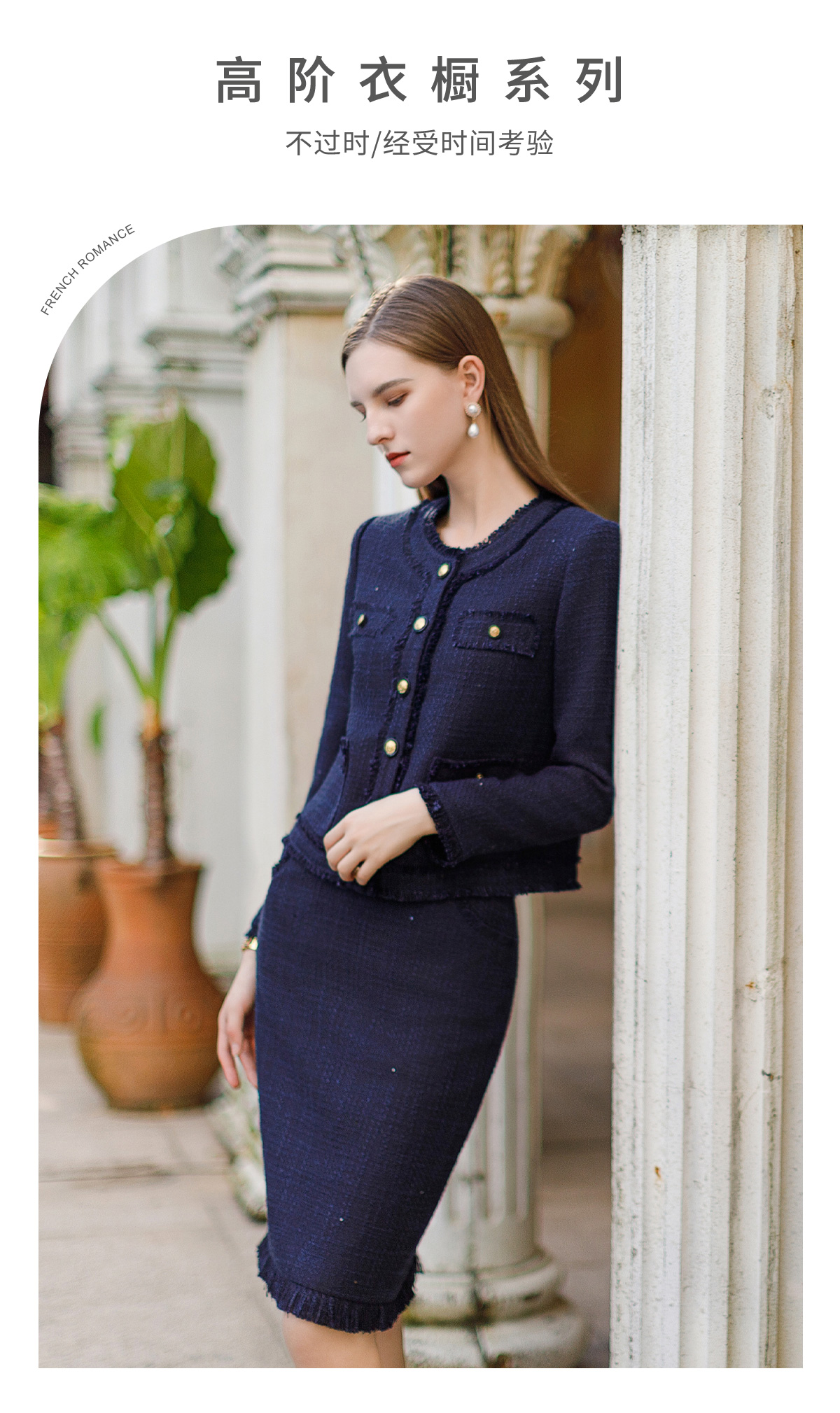 AD小香风职业套装裙女秋冬新款毛边编织开衫短外套藏青色两件套