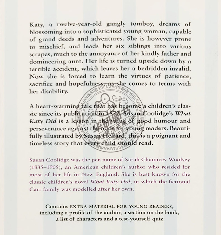 What Katy Did《凯蒂做了什么》自出版以来,一直是儿童读物的经典,温暖了许多人的内心。这本书告诉我们,拥有幽默感和坚韧不拔的精神是非常重要的,可以帮助我们克服生活中的各种难题。本书的插图由Susan Hellard绘制,书末附有作者(The Writer)、书籍(The Book)、角色(The Character)等的详细介绍,以及一篇单项选择题(Test Yourself),以检测小读者是否真正理解了全书的内容。