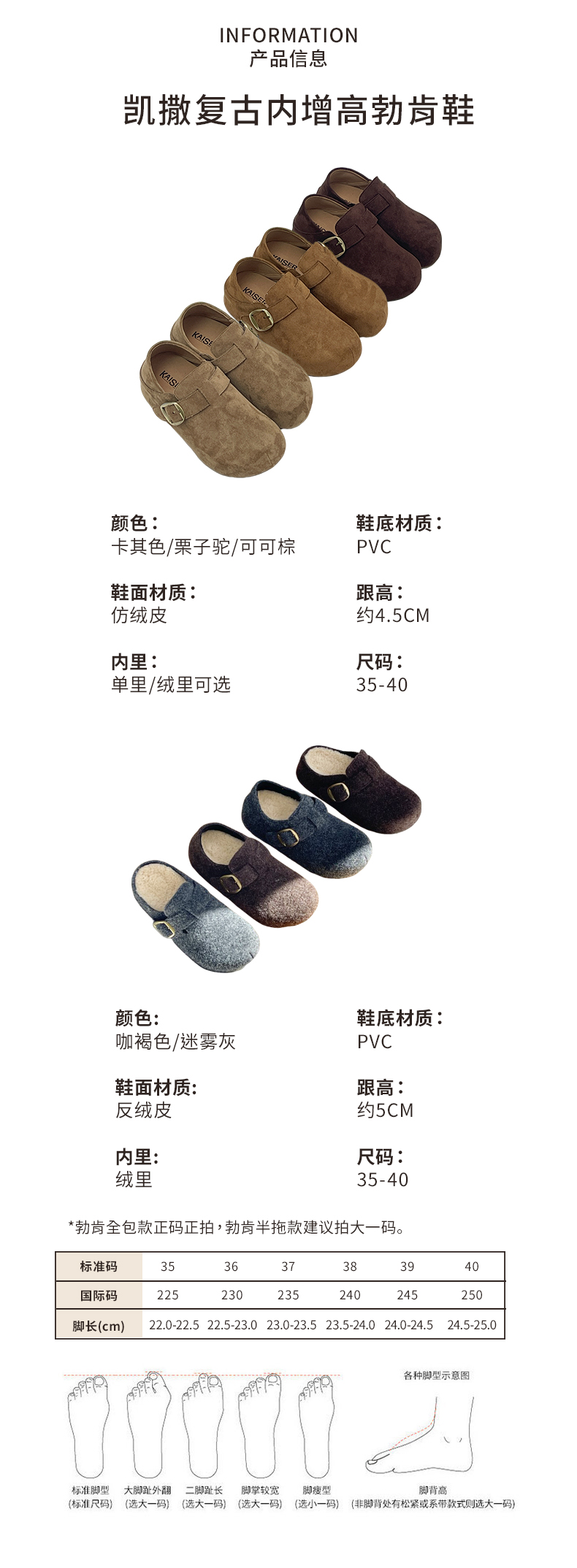 【限量赠品!】凯撒KAISER 复古内增高休闲勃肯鞋 单里棉里可选 I 可半拖可全包 4.5-5厘米内增高显高显瘦 秋冬百搭【棉全包、棉半包款 爆仓3-5天发货】