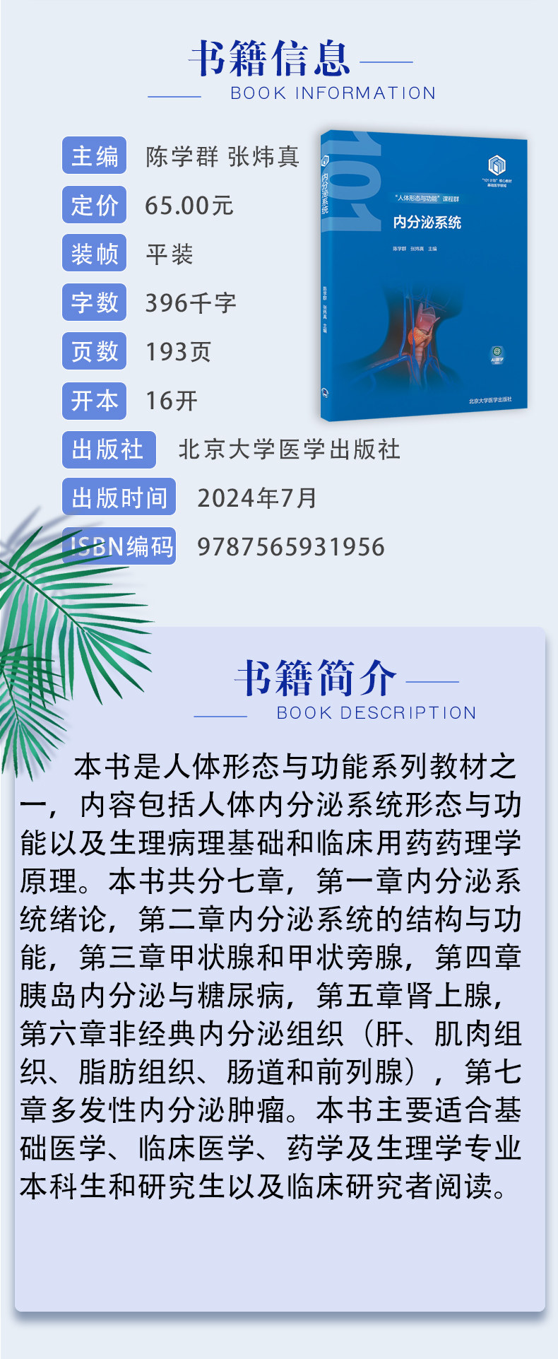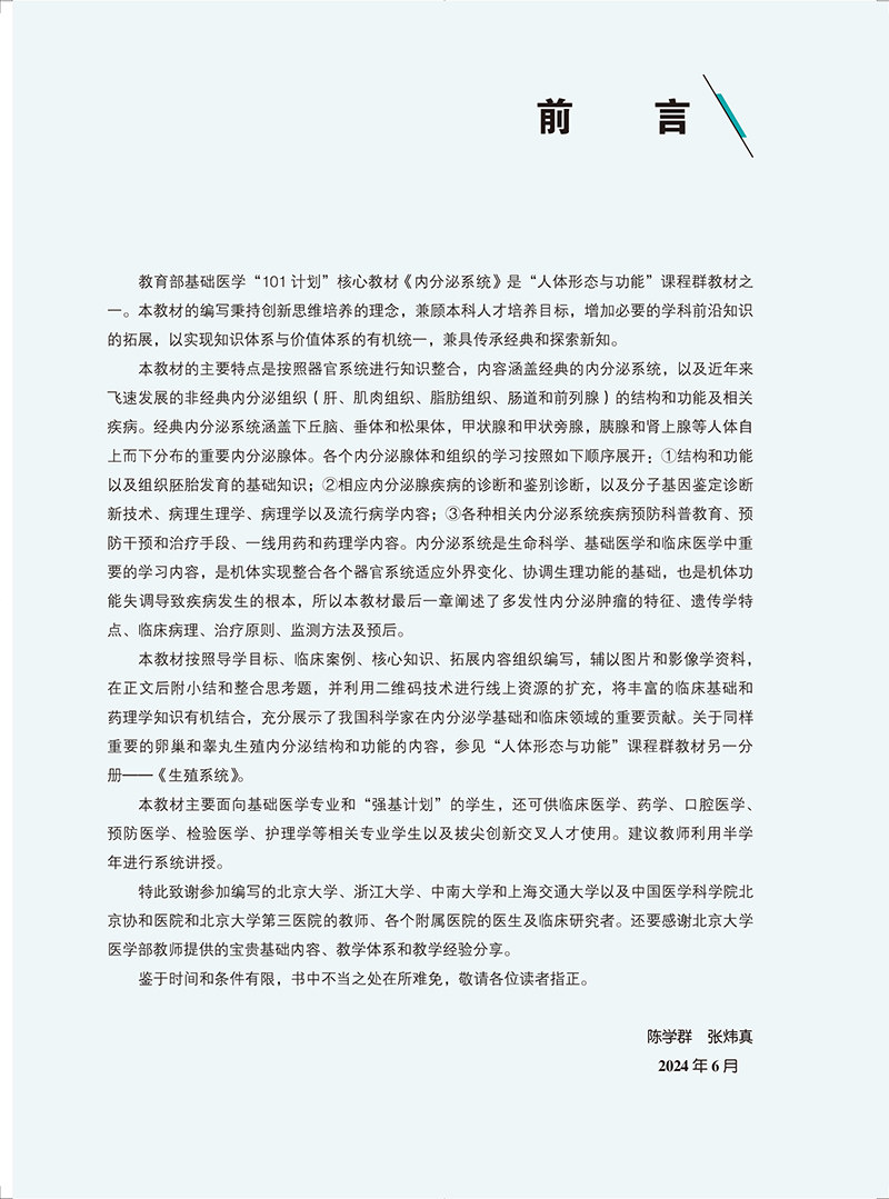 本书是人体形态与功能系列教材之一,内容包括人体内分泌系统形态与功能以及生理病理基础和临床用药药理学原理。本书共分七章,第一章内分泌系统绪论,第二章内分泌系统的结构与功能,第三章甲状腺和甲状旁腺,第四章胰岛内分泌与糖尿病,第五章肾上腺,第六章非经典内分泌组织(肝、肌肉组织、脂肪组织、肠道和前列腺),第七章多发性内分泌肿瘤。本书主要适合基础医学、临床医学、药学及生理学专业本科生和研究生以及临床研究者阅读。