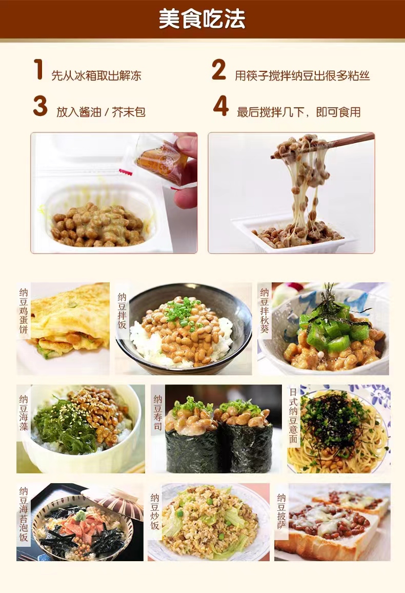 【食用方法】 将冷冻的纳豆室温放置4-6小时或提前1天冷藏解冻,充分搅拌至拉丝状,再加入生抽、芥末葱花或辣椒等调味料,搭配米饭或面条食用。
