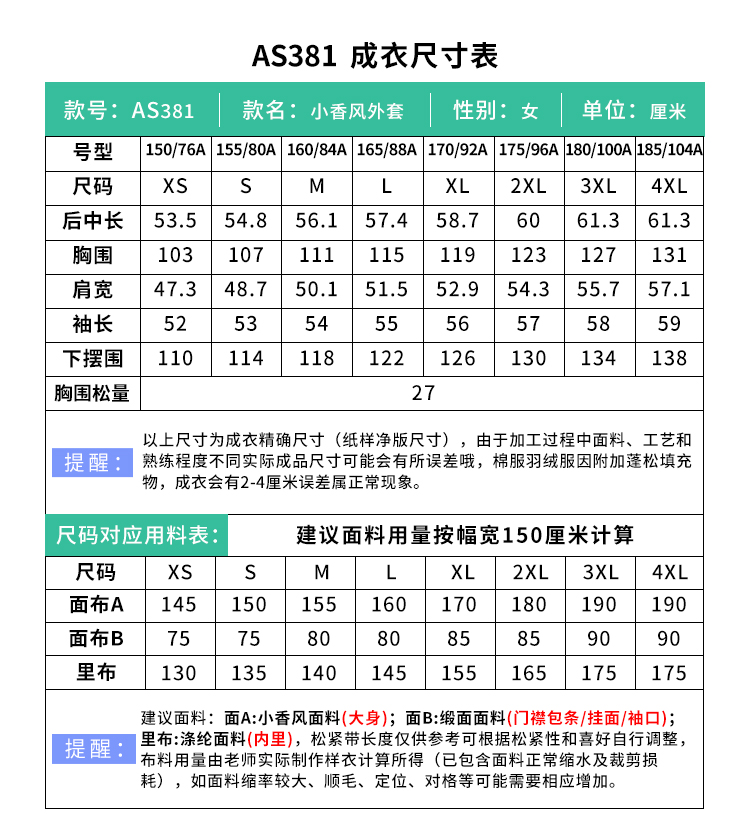 裁缝学苑AS381重工高级感翻边袖小香风外套纸样女装新款短上衣版型图纸