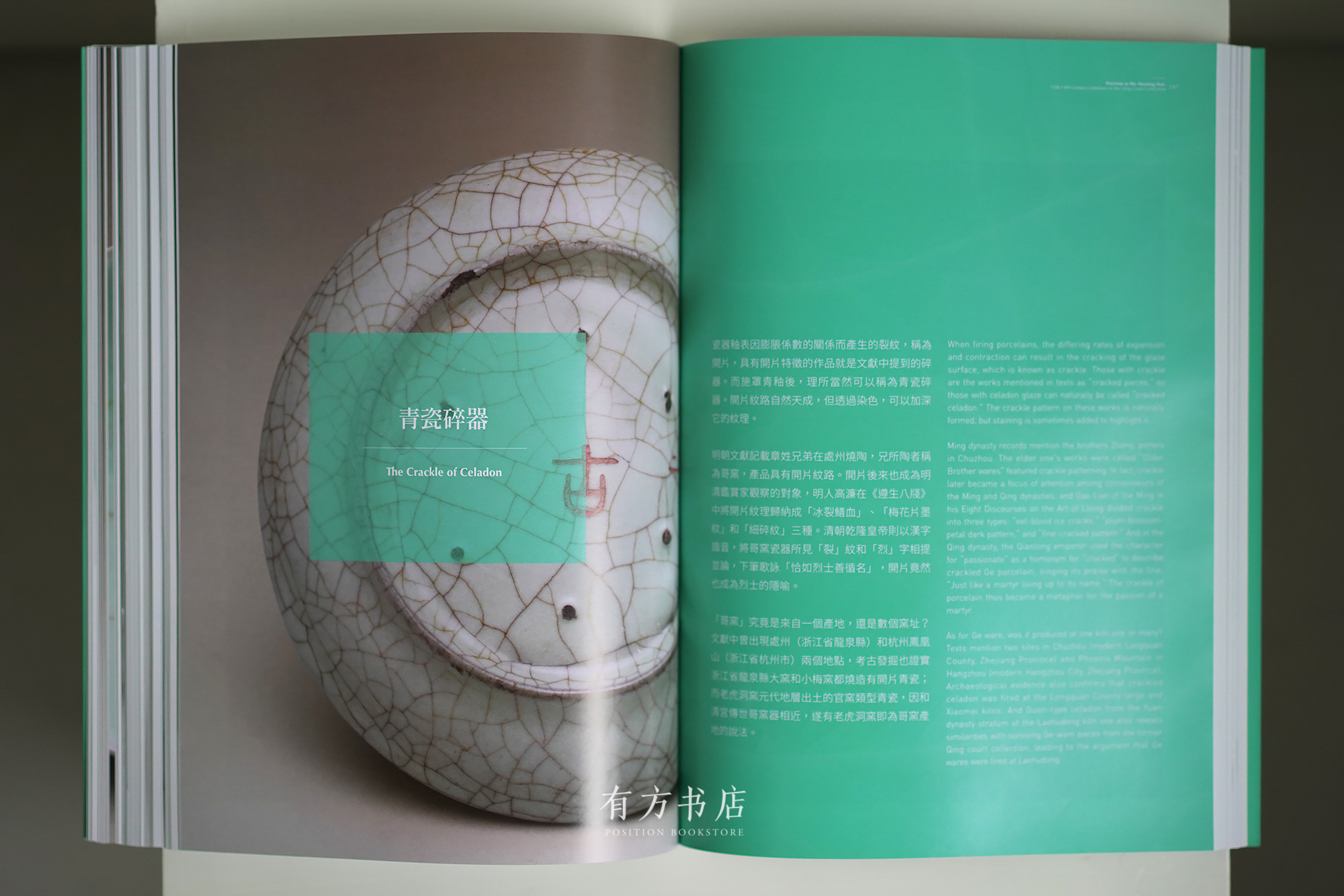 台北故宫的这本图录出自2015-2017年的同名展览。策展人以乾隆帝的鉴赏与收藏为线索策划展览,随展出版的图录则分四章细说:汝窑与北宋官窑、南宋官窑、龙泉窑、青瓷碎器。带领观众观察、了解各窑作品在釉色上的异同,典雅方正的造型与时代风格,以及独特的青瓷冰裂纹之美。配以精简的说明文字与图片,对照青瓷产地考古出土及窖藏,为观众提供参考。