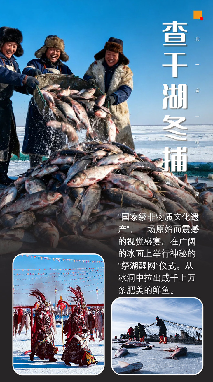查干湖冬捕是吉林省前郭尔罗斯蒙古族自治县传统冬季渔业生产方式,起源于辽金时期,以祭湖、醒网、凿冰、撒网等流程形成独特渔猎文化。该习俗于2008年被列入国家级非物质文化遗产名录!装满鱼的网肚无法拉出冰面,只能从狭小的出网口逐条捞出。当渔网被一点点出,“冰湖腾鱼”的盛景再次呈现。